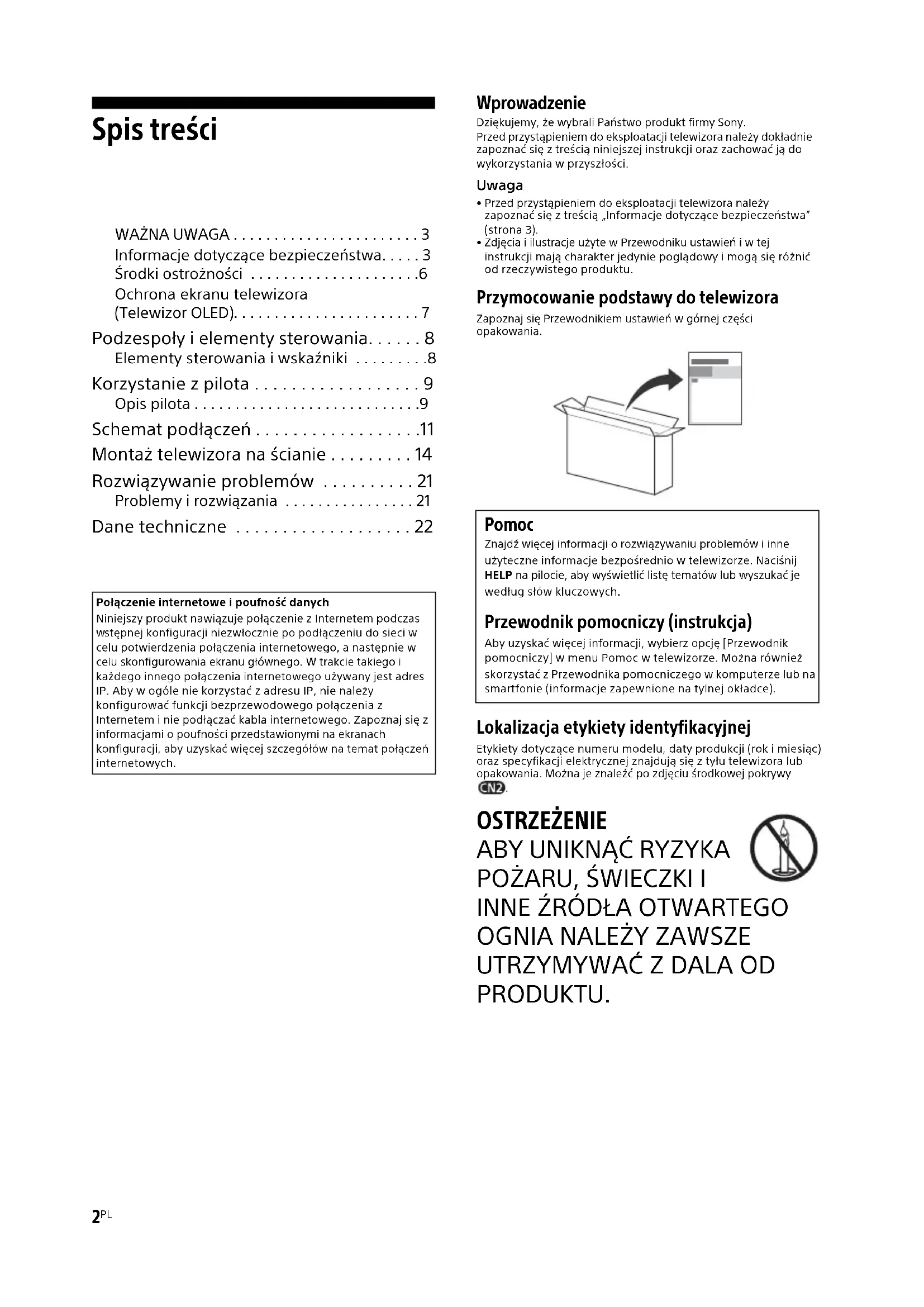 PRODUKTU. Połączenie internetowe i poufność danychNiniejszy produkt nawiązuje połączenie z Internetem podczas stępnej konfiguracji niezwłocznie po podłączeniu do sieci w celu potwierdzenia połączenia internetowego, a następnie w celu skonfigurowania ekranu głównego. W trakcie takiego i każdego innego połączenia internetowego używany jest adres IP. Aby w ogóle nie korzystać z adresu IP, nie należy konfigurować funkcji bezprzewodowego połączenia z Internetem i nie podłączać kabla internetowego. Zapoznaj się z informacjami o poufności przedstawionymi na ekranach konfiguracji, aby uzyskać więcej szczegółów na temat połączeń internetowych. Pomoc Znajdź więcej informacji o rozwiązywaniu problemów i inne użyteczne informacje bezpośrednio w telewizorze. Naciśnij HELP na pilocie, aby wyświetlić listę tematów lub wyszukać je według słów kluczowych. Przewodnik pomocniczy (instrukcja) Aby uzyskać więcej informacji, wybierz opcję [Przewodnik pomocniczy] w menu Pomoc w telewizorze. Można również skorzystać z Przewodnika pomocniczego w komputerze lub na smartfonie (informacje zapewnione na tylnej okładce).3