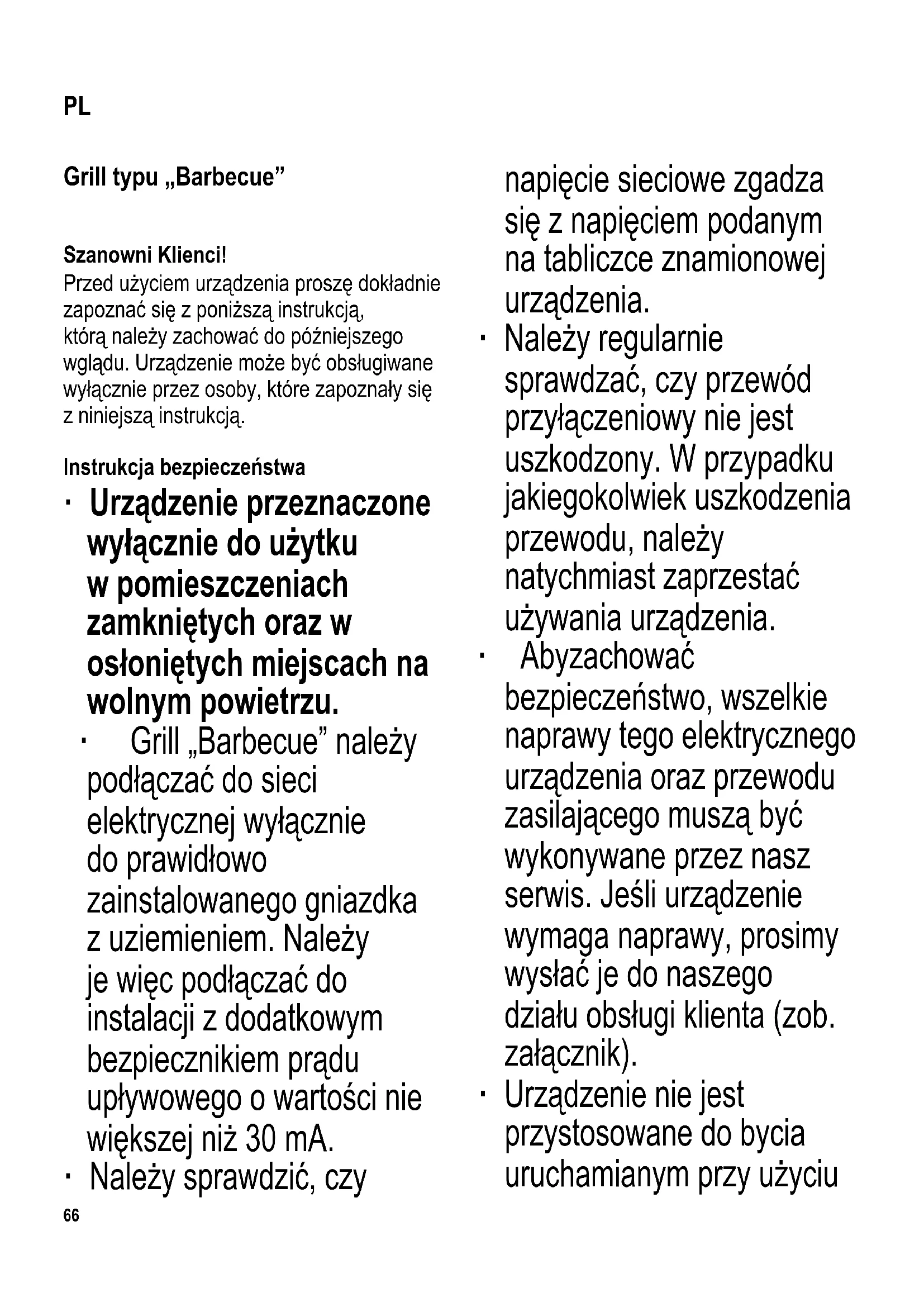 pokrywą. Ostrzeżenie! Bez podstawy i wspornika urządzenie może służyć także jako grill stołowy. Rozgrzewanie po raz pierwszy ∙ W łożyć wtyczkę do gniazdka elektrycznego. ∙ Rozgrzewać grill na pusto, z zamkniętą pokrywą i z maksymalną mocą, przez około 10 minut. W ten sposób pozbywamy się specyfi cznego zapachu nowego urządzenia. Może się71 pojawić nieco dymu, co jest zupełnie normalne, tym niemniej należy zapewnić odpowiednią wentylację, otwierając okno lub drzwi balkonowe. ∙ Wyczyścić grill zgodnie z opisem w części pt. Czyszczenie i konserwacja. Termometr Termometr na pokrywie wskazuje aktualną temperaturę wewnątrz komory grilla. Płyta grillowa ∙ P łyta grillowa pokryta jest bardzo trwałą warstwą ceramiczną, która umożliwia grillowanie w bardzo wysokiej temperaturze bez tłuszczu lub oleju albo tylko z niewielką ich ilością. ∙ Przed ułożeniem do grillowania takich produktów jak warzywa czy ryba, nałożyć za pomocą pędzelka lub papierowego ręcznika niewielką ilość tłuszczu/oleju do smażenia w wysokich temperaturach (tłuszcz do sma żenia bądź olej kokosowy, palmowy, słonecznikowy, rzepakowy lub canola). ∙ Oleje, które nie są przeznaczone do smażenia w wysokich temperaturach, spalają się na ceramicznej powierzchni i powodują uszkodzenia, które pozbawiają jej właściwości chroniących przed przywieraniem. ∙ Szczegółowe informacje na temat czyszczenia urządzenia znajdują się w punkcie Czyszczenie i konserwacja. Grillowanie ∙ Sprawdzić, czy grill „Barbecue” został prawidłowo zmontowany i jest stabilny. ∙ W łożyć wtyczkę do gniazdka elektrycznego. ∙ Ustawić gałkę termostatu w pozycji MAX. Włącza się lampka kontrolna i grill zaczyna się rozgrzewać. ∙ Kiedy osiągnię ta zostanie wystarczająco wysoka temperatura, otworzyć pokrywę i umieścić produkt spożywczy. ∙ Podczas grillowania pokrywa może być otwarta lub zamknięta. Kiedy jest zamknięta, osiągana temperatura jest wyższa ze względu na efekt podobny do zachodzącego w piekarniku – grillowanie ma wówczas charakter pośredni. ∙ Temperaturę można w razie potrzeby regulować w dół bądź w górę za pomocą gałki termostatu. ∙ Po zakończeniu grillowania: ∙ Ustawić gałkę termostatu w pozycji MIN. ∙ Najpierw wyjąć wtyczkę z gniazda elektrycznego, a następnie odłączyć wtyczkę termostatu. ∙ Zostawić grill do ostygni ęcia. Czyszczenie i konserwacja ∙ Po zakończeniu pracy zaleca się dokładne wyczyszczenie urządzenia. ∙ Przed przystąpieniem do czyszczenia grilla, odłączyć urządzenie od zasilania, wyjąć wtyczkę termostatu i zostawić urządzenie do całkowitego ostygnięcia. ∙ Nie stosować druciaków kuchennych, wełny metalowej ani trących środków czyszczących. ∙ Wytrzeć płytę grillową papierowym ręcznikiem. Aby usunąć uporczywe zabrudzenia, należy wyjąć płytę i umyć delikatną gąbką w wodzie z detergentem – można ewentualnie zostawić ją na jakiś czas do namoczenia. Płytę grillową, a72 zwłaszcza gniazdo termostatu należy zawsze dokładnie osuszyć. ∙ Aby zapobiec ryzyku porażenia prądem, nie zanurzać przewodu zasilającego ani wtyczki termostatu w cieczy, ani nie dopuszczać do ich kontaktu z cieczami. Złącze termostatu można przetrzeć wilgotną, gładką ściereczką. ∙ W razie potrzeby pokrywę i miskę grilla można wyczyścić ściereczką namoczoną w wodzie z detergentem, po czym od razu należy wytrzeć do sucha. ∙ Tackę ociekacza można umyć w wodzie z detergentem. ∙ Elementy urządzenia nie nadają się do mycia w zmywarce. Utylizacja Urządzenia oznaczone powyższym symbolem należy utylizować osobno, a nie wraz ze zwykłymi odpadkami z gospodarstwa domowego. Urządzenia takie zawierają bowiem cenne materiały, które można poddać recyklingowi. Odpowiednia utylizacja takich urządzeń pomaga w ochronie środowiska i zdrowia człowieka. Szczegółowych informacji na ten temat udzielają lokalne władze lub sklepy prowadzące sprzedaż detaliczną. Gwarancja Gwarancja na produkt obejmuje wady materiału i wykonania przez okres dwóch lat od daty zakupu produktu. W ramach gwarancji producent zobowiązuje się do naprawy lub wymiany wszelkich wadliwych elementów, pod warunkiem, że produkt zostanie odniesiony prze klienta do punktu zakupu, a później odesłany przez sklep do serwisu centralnego w Opolu, prowadzonego przez fi rmę Serv- Serwis Sp.z o.o. Aby gwarancja zachowała ważność, urządzenie musi być używane zgodnie z instrukcją i nie może być modyfi kowane, naprawiane lub w jakikolwiek sposób naruszane przez nieupoważnioną do tego osobę, ani też uszkodzone w wyniku nieprawidłowego użycia. Gwarancja nie obejmuje naturalnego zużycia, ani elementów łatwo tłukących się, jak szkło, elementy z tworzyw sztucznych, żarówki itd. Niniejsza gwarancja nie ogranicza ustawowych praw konsumenta ani innych praw, jakie konsument posiada zgodnie z obowiązującymi przepisami, które dotyczą zakupu przedmiotów użytkowych. Jeżeli urządzenie przestanie działać prawidłowo i musi zostać odesłane, należy je dokładnie zapakować i dołączyć imię, nazwisko i adres nadawcy oraz przyczynę odesłania. Jeśli urządzenie jest nadal na gwarancji, proszę także dołączyć paragon zakupu, lub fakturę zakupową.73