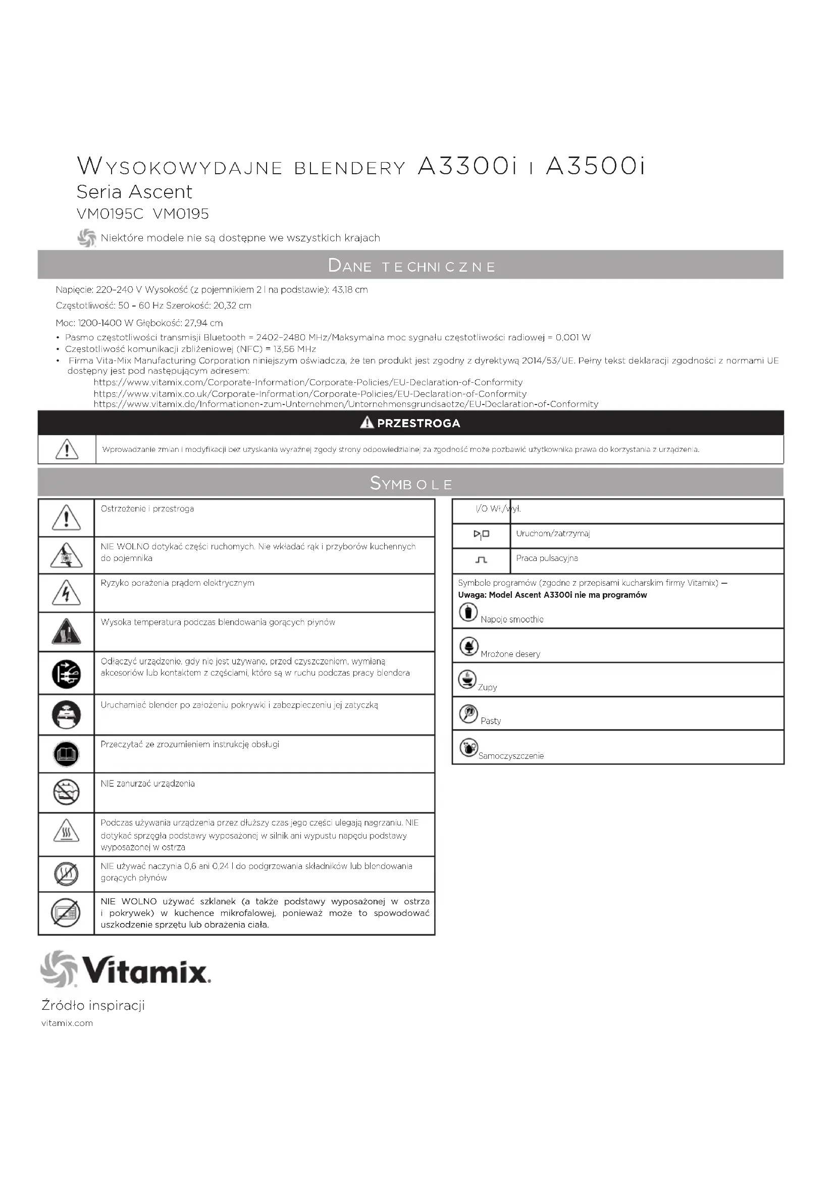 Vitality General Trading LLC PO Box 73265 Dubai Emiratele Arabe Unite Tel: +971 (0) 561089662 www.vitality.ae info@vitality.ae 4Homes FZCO PO Box 61379, Dubai UAE. Tel: +971 4 3807611 Fax: +971 4 387612 4homes@4homes.ae www.tavolashop.com AUSTRALIA ȘI NOUA ZEELANDĂ Vitamix ANZ Pty Limited 167 King St Newcastle NSW2300 Australia Tel: 1-800-766437 (AUS) Tel: 050-853-0697 (NZ) www.vitamix.com.au www.vitamix.co.nzwysokowydAjne Blendery A3300i i A3500i Seria Ascent Źródło inspiracjivitamix.com VM0185 Symb o l e dane t e chni c z n e Napięcie: 220–240V Wysokość (z pojemnikiem 2l na podstawie): 43,18cm Częstotliwość: 50 – 60Hz Szerokość: 20,32cmMoc: 1200-1400 W Głębokość: 27,94cmI/O Wł./wył. Uruchom/zatrzymajPraca pulsacyjnaSymbole programów (zgodne z przepisami kucharskim firmy Vitamix) — Uwaga: Model Ascent A3300i nie ma programów Napoje smoothie Mrożone desery Zupy PastySamoczyszczenie VM0195C VM0195 Niektóre modele nie są dostępne we wszystkich krajach• Pasmo częstotliwości transmisji Bluetooth = 2402–2480MHz/Maksymalna moc sygnału częstotliwości radiowej = 0,001W• Częstotliwość komunikacji zbliżeniowej (NFC) = 13,56MHz