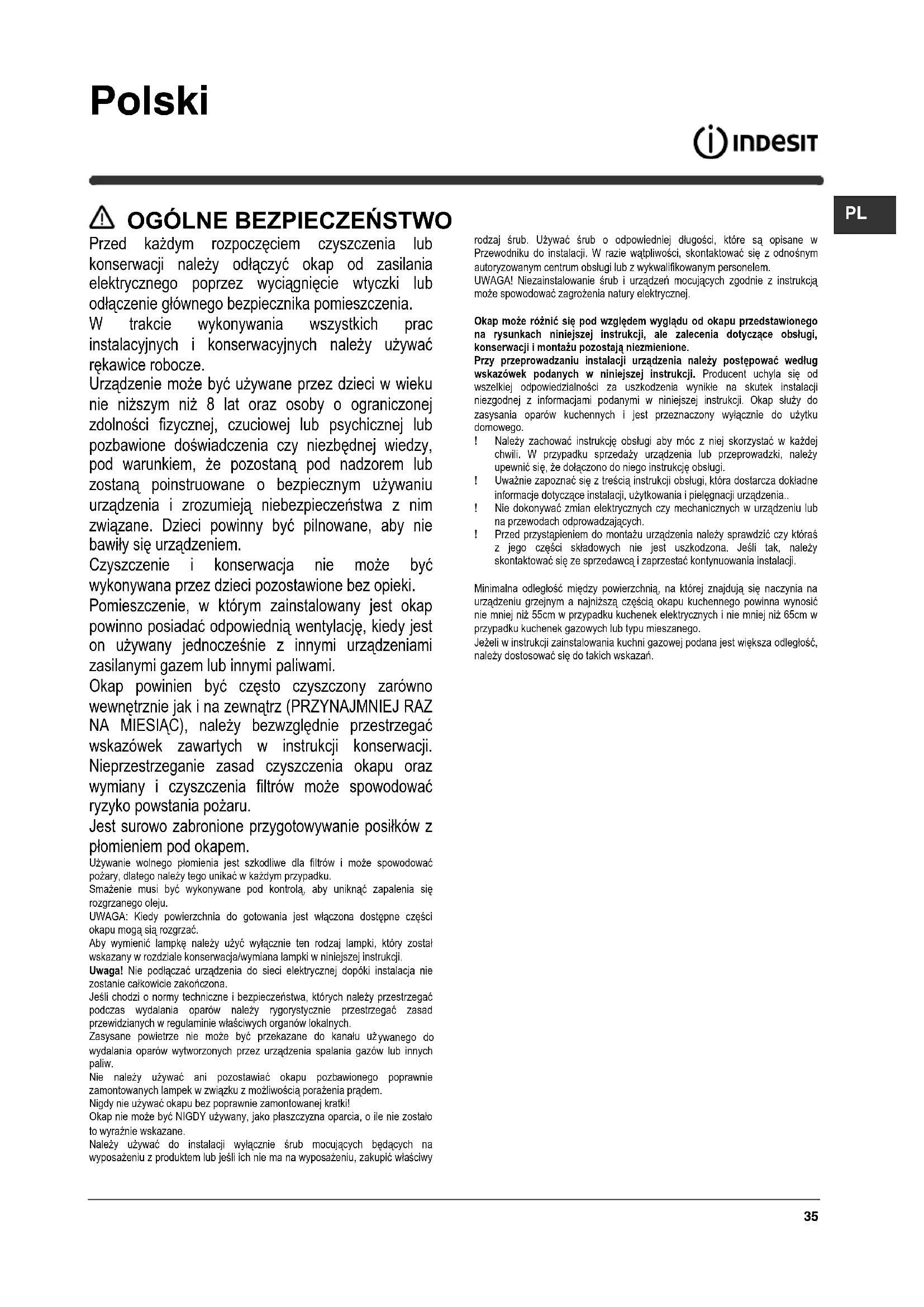 Przed każdym rozpoczęciem czyszczenia lub konserwacji należy odłączyć okap od zasilania elektrycznego poprzez wyciągnięcie wtyczki lub odłączenie głównego bezpiecznika pomieszczenia. W trakcie wykonywania wszystkich prac instalacyjnych i konserwacyjnych należy używać rękawice robocze. Urządzenie może być używane przez dzieci w wieku nie niższym niż 8 lat oraz osoby o ograniczonej zdolności fizycznej, czuciowej lub psychicznej lub pozbawione doświadczenia czy niezbędnej wiedzy, pod warunkiem, że pozostaną pod nadzorem lub zostaną poinstruowane o bezpiecznym używaniu urządzenia i zrozumieją niebezpieczeństwa z nim związane. Dzieci powinny być pilnowane, aby nie bawiły się urządzeniem. Czyszczenie i konserwacja nie może być wykonywana przez dzieci pozostawione bez opieki. Pomieszczenie, w którym zainstalowany jest okap powinno posiadać odpowiednią wentylację, kiedy jest on używany jednocześnie z innymi urządzeniami zasilanymi gazem lub innymi paliwami. Okap powinien być często czyszczony zarówno wewnętrznie jak i na zewnątrz (PRZYNAJMNIEJ RAZ NA MIESIĄC), należy bezwzględnie przestrzegać wskazówek zawartych w instrukcji konserwacji. Nieprzestrzeganie zasad czyszczenia okapu oraz wymiany i czyszczenia filtrów może spowodować ryzyko powstania pożaru. Jest surowo zabronione przygotowywanie posiłków z płomieniem pod okapem. Używanie wolnego płomienia jest szkodliwe dla filtrów i może spowodować pożary, dlatego należy tego unikać w każdym przypadku. Smażenie musi być wykonywane pod kontrolą, aby uniknąć zapalenia się rozgrzanego oleju. UWAGA: Kiedy powierzchnia do gotowania jest włączona dostępne części okapu mogą sią rozgrzać. Aby wymienić lampkę należy użyć wyłącznie ten rodzaj lampki, który został wskazany w rozdziale konserwacja/wymiana lampki w niniejszej instrukcji. Uwaga! Nie podłączać urządzenia do sieci elektrycznej dopóki instalacja nie zostanie całkowicie zakończona. Jeśli chodzi o normy techniczne i bezpieczeństwa, których należy przestrzegać podczas wydalania oparów należy rygorystycznie przestrzegać zasad przewidzianych w regulaminie właściwych organów lokalnych. Zasysane powietrze nie może być przekazane do kanału uż ywanego do wydalania oparów wytworzonych przez urządzenia spalania gazów lub innych paliw. Nie należy używać ani pozostawiać okapu pozbawionego poprawnie zamontowanych lampek w związku z możliwością porażenia prądem. Nigdy nie używać okapu bez poprawnie zamontowanej kratki! Okap nie może być NIGDY używany, jako płaszczyzna oparcia, o ile nie zostało to wyraźnie wskazane. Należy używać do instalacji wyłącznie śrub mocujących będących na wyposażeniu z produktem lub jeśli ich nie ma na wyposażeniu, zakupić właściwy rodzaj śrub. Używać śrub o odpowiedniej długości, które są opisane w Przewodniku do instalacji. W razie wątpliwości, skontaktować się z odno śnym autoryzowanym centrum obsługi lub z wykwalifikowanym personelem. UWAGA! Niezainstalowanie śrub i urządzeń mocujących zgodnie z instrukcją może spowodować zagrożenia natury elektrycznej. Okap może różnić się pod względem wyglądu od okapu przedstawionego na rysunkach niniejszej instrukcji, ale zalecenia dotyczące obsługi, konserwacji i montażu pozostają niezmienione. Przy przeprowadzaniu instalacji urządzenia należy postępować według wskazówek podanych w niniejszej instrukcji. Producent uchyla się od wszelkiej odpowiedzialności za uszkodzenia wynikłe na skutek instalacji niezgodnej z informacjami podanymi w niniejszej instrukcji. Okap służy do zasysania oparów kuchennych i jest przeznaczony wyłącznie do użytku domowego. ! Należy zachować instrukcję obsługi aby móc z niej skorzystać w każdej chwili. W przypadku sprzedaży urządzenia lub przeprowadzki, należy upewnić si ę, że dołączono do niego instrukcję obsługi. ! Uważnie zapoznać się z treścią instrukcji obsługi, która dostarcza dokładne informacje dotyczące instalacji, użytkowania i pielęgnacji urządzenia.. ! Nie dokonywać zmian elektrycznych czy mechanicznych w urządzeniu lub na przewodach odprowadzających. ! Przed przystąpieniem do montażu urządzenia należy sprawdzić czy któraś z jego części składowych nie jest uszkodzona. Jeśli tak, należy skontaktować się ze sprzedawcą i zaprzestać kontynuowania instalacji. Minimalna odległość między powierzchnią, na której znajdują się naczynia na urządzeniu grzejnym a najniższą częścią okapu kuchennego powinna wynosić nie mniej niż 55cm w przypadku kuchenek elektrycznych i nie mniej niż 65cm w przypadku kuchenek gazowych lub typu mieszanego. Jeżeli w instrukcji zainstalowania kuchni gazowej podana jest większa odległość, należy dostosować się do takich wskazań.36