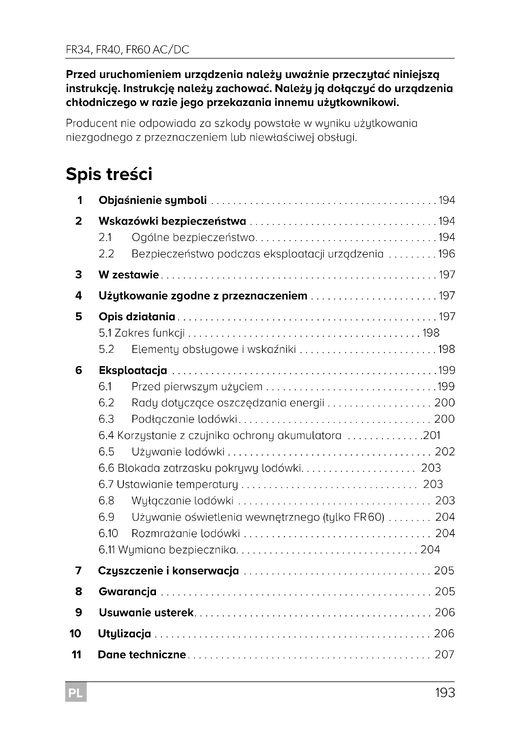 Jeżeli produkt nie będzie dłużej eksploatowany, koniecznie dowiedz się w najbliższym zakładzie recyklingu lub w specjalistycznym sklepie, jakie są aktualnie obowiązujące przepisy dotyczące utylizacji. Usterka Możliwa przyczyna Proponowane rozwiązanie Lodówka nie działa, nie świeci się dioda LED „POWER”.Brak napięcia w gnieździe prądu sta- łego DC pojazdu. Wwiększości pojazdów konieczne jest włączenie zapłonu, aby w gnieździe prądu stałego DC dostępne było napię- cie. Lodówka nie chłodzi (wtyczka jest włożona, świeci się dioda LED „POWER”). Uszkodzona sprężarka. Naprawę może wykonać tylko autoryzo- wany dział serwisowy.Lodówka nie chłodzi (wtyk jest podłączony, dioda LED „POWER” miga na pomarań-czowo, wyświetlacz jest wyłączony).Napięcie akumulatora pojazdu jest za niskie. Sprawdzić akumulator pojazdu i w razie potrzeby naładować go.Podczas zasilania z gniazda prądu sta-łego DC: Zapłon jest włączony, lodówka nie działa i nie świeci się dioda LED „POWER”. Gniazdo prądu stałego DC jest zabrudzone. Uniemożliwia to prawi-dłowe przewodzenie prądu w złączu. Jeżeli wtyczka lodówki w gnieździe prądu stałego DC jest zbyt ciepła, należy oczy- ścić gniazdo. Innym powodem może być nieprawidłowo zmontowana wtyczka.Bezpiecznik wtyczki prądu stałego DC jest przepalony. Wymienić bezpiecznik (8 A) we wtyczce prądu stałego DC, patrz rozdz. „Wymiana bezpiecznika” na stronie 204.Bezpiecznik pojazdu jest przepalony. Wymienić bezpiecznik gniazda prądu sta- łego DC pojazdu (zwykle 15 A). Patrz instrukcja obsługi pojazdu.Na wyświetlaczu wyświetla się komuni- kat o błędzie (np. „Err1”) i lodówka nie chłodzi.Lodówka wy łączyła się z powodu wewnętrznego błędu. Naprawy może dokonać tylko autoryzo- wany zakład serwisowy. FR34-FR40-FR60--O-16s.book Seite 206 Donnerstag, 19. Juli 2018 3:22 15PL FR34, FR40, FR60 AC/DC Dane techniczne