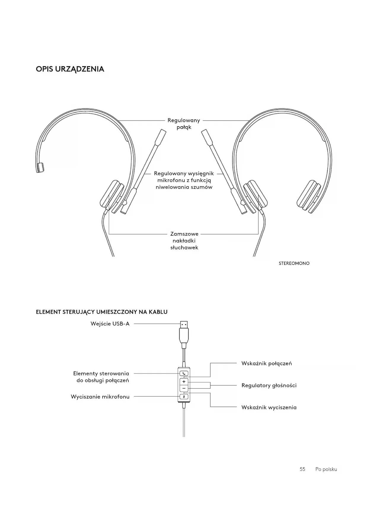 1 Wysięgnik mikrofonu obraca się o 270 stopni wobukierunkach. Używaj go po lewej lub prawej stronie. 2 Wyreguluj położenie elastycznego wysięgnika mikrofonu, aby lepiej przechwytywać dźwięk. ZAWARTOŚĆ ZESTAWU MONO 1 Zestaw słuchawkowy ze sterowaniem na kablu izłączem USB-A 2 Dokumentacja produktu STEREO 1 Zestaw słuchawkowy ze sterowaniem na kablu izłączem USB-A 2 Dokumentacja produktu USB-A USB-A