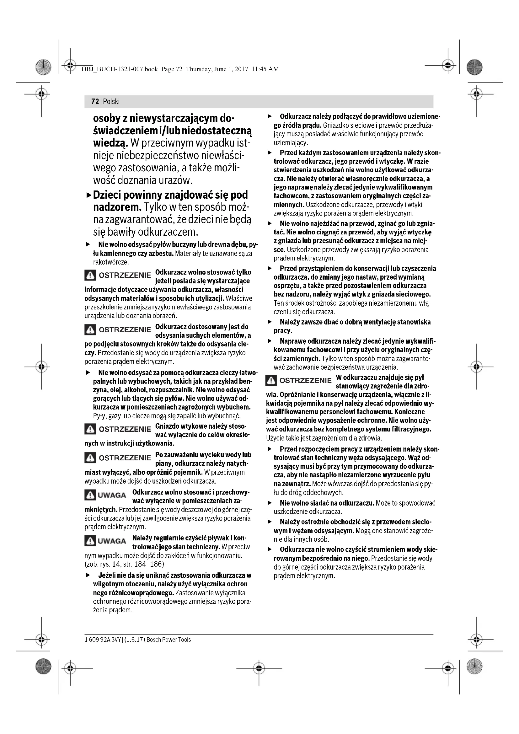 Wskazówka: Wymagania dotyczące stopnia prze- puszczalności (klasa ochrony przeciw- pyłowej L) udokumentowane zostały tyl- ko w przypadku odsysania na sucho. W odkurza- czu znajduje się pył stanowiący zagrożenie dla zdrowia. Opróżnianie i konserwację urządzenia, włącznie z likwidacją po- jemnika na pył należy zlecać odpo- wiednio wykwalifikowanemu perso- nelowi fachowemu. Konieczne jest odpowiednie wyposażenie ochronne. Nie wolno używać odkurzacza bez kompletnego systemu filtracyjnego. Użycie takie jest zagrożeniem dla zdro- wia. Nie wolno siadać na odkurzaczu ani na niego wchodzić Przed przystąpieniem do jakichkolwiek czynności obsługowym przy odkurza- czu, należy wyjąć wtyczkę sieciową z gniazda Należy nosić środki ochrony słuchu. UWAGA OSTRZEZENIE OBJ_BUCH-1321-007.book Page 73 Thursday, June 1, 2017 11:45 AM74 | Polski 1 609 92A 3VY | (1.6.17) Bosch Power Tools Zakres dostawy Odkurzacz uniwersalny (zob. rys. 1) Kompletny asortyment osprzętu można znaleźć w naszym ka- talogu osprzętu. Użycie zgodne z przeznaczeniem Odkurzacz przeznaczony jest do zasysania i pochłaniania sub- stancji niezagrażających zdrowiu i niepalnych cieczy. Jest do- stosowany do podwyższonych obciążeń w zastosowaniach przemysłowych, np. w rzemiośle, przemyśle i w warsztatach naprawczych. Odkurzacze klasy ochrony przeciwpyłowej L mogą, zgodnie z wymaganiami normy IEC/EN 60335-2-69, być stosowane do zasysania i odsysania niebezpiecznych dla zdrowia pyłów o wartości granicznej ekspozycji wynoszącej > 1 mg/m