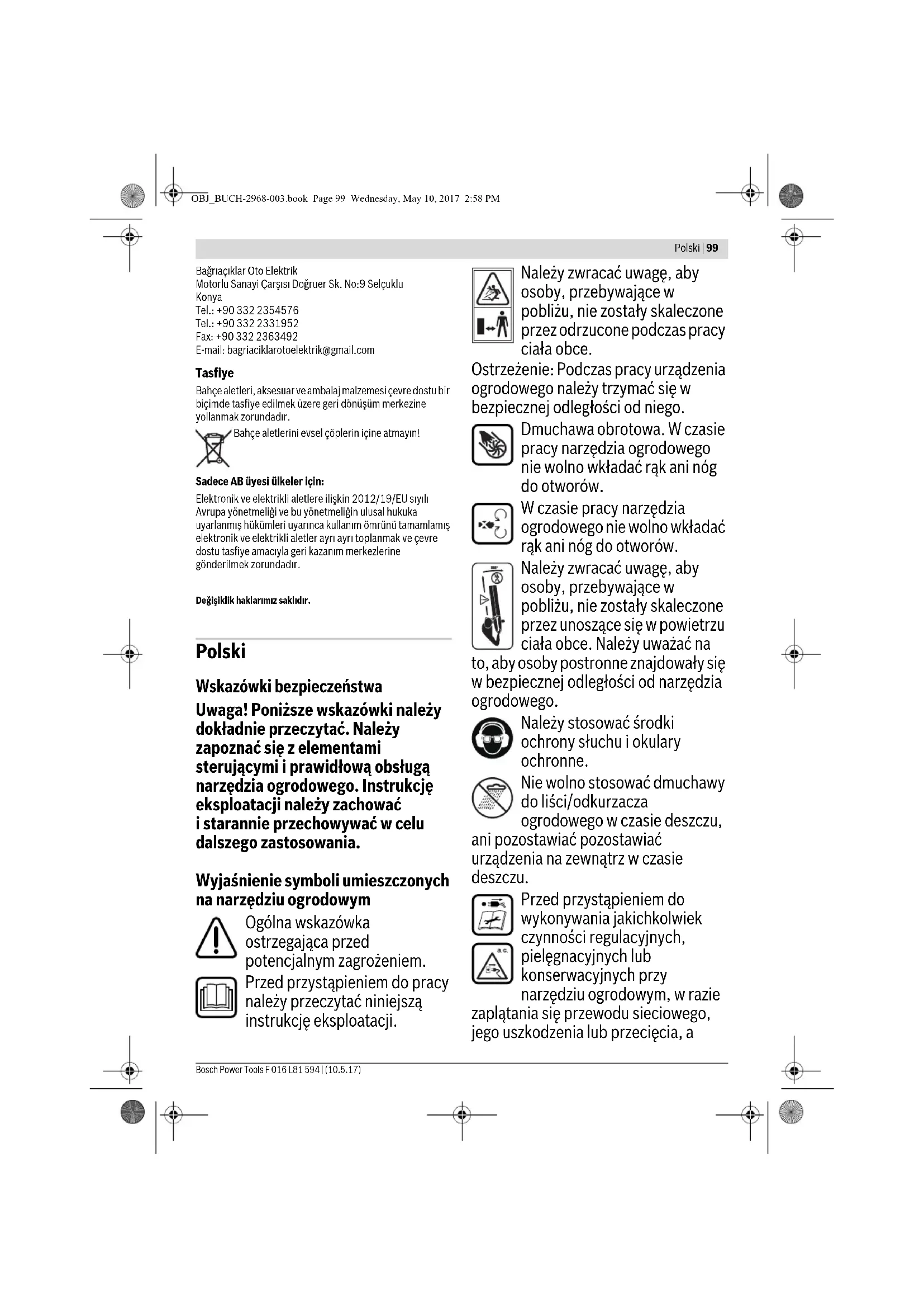 İşlemin amacı Şekil Sayfa Hata göstergesi Olası neden Giderilme yolu Bahçe aleti çalışmıyor Bileşenler doğru takılmamış Bakınız: “Montaj” Şebeke gerilimi yok Kontrol edin ve açın Şebeke prizi arızalı Başka bir priz kullanın Uzatma kablosunda hasar var Kabloyu kontrol edin ve hasarlı ise değiştirin Sigorta atmış durumda Sigortayı değiştirin Motor koruma sistemi devreye girmiş durumda Motorun soğumasını bekleyin ve fanın bloke olup olmadığını kontrol edin Bahçe aleti kesintili olarak çalışıyor Uzatma kablosunda hasar var Kabloyu kontrol edin ve hasarlı ise değiştirin Bahçe aletinin içindeki kablo sisteminde hata var Müşteri servisine başvurun Açma/kapama şalteri arızalı Müşteri servisine başvurun Motor koruma sistemi devreye girmiş durumda Motorun soğumasını bekleyin ve fanın bloke olup olmadığını kontrol edin Aşırı titreşim ve gürültü var Bahçe aleti arızalı Müşteri servisine başvurun Bahçe aleti üfleme/emme yapmıyor Meme/emme borusu bloke olmuş durumda Memeyi/emme borusunu açın Meme/emme borusu takılamıyor Yanlış montaj Bakınız: “Montaj” Emme yoğunluğu düşüyor Toplama torbası dolu Toplama torbasını boşaltın Toplama torbasının bağlantı rakoru bloke olmuş durumda Toplama torbasının bağlantı rakorunu açın Fan dönmüyor Fan bloke olmuş durumda Bahçe aletini kapatın ve blokajı giderin (koruyucu eldiven kullanın) OBJ_BUCH-2968-003.book Page 97 Wednesday, May 10, 2017 2:58 PM98 | Türkçe F 016 L81 594 | (10.5.17) Bosch Power Tools Bakım ve servis Bakım, temizlik ve depolama Bahçe aletinin kendinde bir çalışma yapmadan önce her defasında şebeke bağlantı fişini prizden çekin. İyi ve güvenli çalışabilmek için bahçe aletini temiz tutun. İyi ve güvenli çalışabilmek için bahçe aletini ve havalandırma aralıklarını temiz tutun. Bahçe aletindeki veya toplama torbasındaki kirleri nemli bir bezle temizleyin. Bahçe aletinin üstüne hiçbir zaman su püskürtmeyin ve bahçe aletini hiçbir zaman su içine daldırmayın. Bahçe aletini kuru, güvenli ve çocukların erişemeyeceği bir yerde saklayın. Bahçe aletinin üzerine başka nesneler koymayın. Müşteri hizmeti ve uygulama danışmanlığı www.bosch-garden.com Lütfen bütün başvuru ve yedek parça siparişlerinizde bahçe aletinin tip etiketi üzerindeki 10 haneli ürün kodunu belirtiniz. Sadece Türkiye için geçerlidir: Bosch genel olarak yedek parçaları 5 yıl hazır tutar. Türkçe Bosch Sanayi ve Ticaret A.Ş. Elektrikli El Aletleri Aydınevler Mah. İnönü Cad. No: 20 Küçükyalı Ofis Park A Blok 34854 Maltepe-İstanbul Tel.: 444 80 10 Fax: +90 216 432 00 82 E-mail: iletisim@bosch.com.tr www.bosch.com.tr Bulsan Elektrik İstanbul Cad. Devrez Sok. İstanbul Çarşısı No: 48/29 İskitler Ankara Tel.: +90 312 3415142 Tel.: +90 312 3410302 Fax: +90 312 3410203 E-mail: bulsanbobinaj@gmail.com Faz Makine Bobinaj Cumhuriyet Mah. Sanayi Sitesi Motor İşleri Bölümü 663 Sk. No:18 Antalya Tel.: +90 242 3465876 Tel.: +90 242 3462885 Fax: +90 242 3341980 E-mail: info@fazmakina.com.tr Körfez Elektrik Karaağaç Mah. Sümerbank Cad. No:18/2 Erzincan Tel.: +90 446 2230959 Fax: +90 446 2240132 E-mail: bilgi@korfezelektrik.com.tr Değer İş Bobinaj İsmetpaşa Mah. İlk Belediye Başkan Cad. 5/C Şahinbey/Gaziantep Tel.: +90 342 2316432 Fax: +90 342 2305871 E-mail: degerisbobinaj@hotmail.com Tek Çözüm Bobinaj Küsget San.Sit.A Blok 11Nolu Cd.No:49/A Şehitkamil/Gaziantep Tel.: +90 342 2351507 Fax: +90 342 2351508 E-mail: cozumbobinaj2@hotmail.com Günşah Otomotiv Beylikdüzü Sanayi Sit. No: 210 Beylikdüzü İstanbul Tel.: +90 212 8720066 Fax: +90 212 8724111 E-mail: gunsahelektrik@ttmail.com Aygem 10021 Sok. No: 11 AOSB Çiğli İzmir Tel.: +90232 3768074 Fax: +90 232 3768075 E-mail: boschservis@aygem.com.tr Sezmen Bobinaj Ege İş Merkezi 1201/4 Sok. No: 4/B Yenişehir İzmir Tel.: +90 232 4571465 Tel.: +90 232 4584480 Fax: +90 232 4573719 E-mail: info@sezmenbobinaj.com.tr Ankaralı Elektrik Eski Sanayi Bölgesi 3. Cad. No: 43 Kocasinan Kayseri Tel.: +90 352 3364216 Tel.: +90 352 3206241 Fax: +90 352 3206242 E-mail: gunay@ankarali.com.tr Asal Bobinaj Eski Sanayi Sitesi Barbaros Cad. No: 24/C Samsun Tel.: +90 362 2289090 Fax: +90 362 2289090 E-mail: bpsasalbobinaj@hotmail.com Üstündağ Elektrikli Aletler Nusretiye Mah. Boyacılar Aralığı No: 9 Tekirdağ Tel.: +90 282 6512884 Fax: +90 282 6521966 E-mail: info@ustundagsogutma.com Marmara Elektrik Tersane cd. Zencefil Sok.No:6 Karaköy İstanbul Tel.: +90 212 2974320 Fax: +90 212 2507200 E-mail: info@marmarabps.com OBJ_BUCH-2968-003.book Page 98 Wednesday, May 10, 2017 2:58 PMPolski | 99 Bosch Power Tools F 016 L81 594 | (10.5.17) Bağrıaçıklar Oto Elektrik Motorlu Sanayi Çarşısı Doğruer Sk. No:9 Selçuklu Konya Tel.: +90 332 2354576 Tel.: +90 332 2331952 Fax: +90 332 2363492 E-mail: bagriaciklarotoelektrik@gmail.com Tasfiye Bahçe aletleri, aksesuar ve ambalaj malzemesi çevre dostu bir biçimde tasfiye edilmek üzere geri dönüşüm merkezine yollanmak zorundadır. Bahçe aletlerini evsel çöplerin içine atmayın! Sadece AB üyesi ülkeler için: Elektronik ve elektrikli aletlere ilişkin 2012/19/EU sıyılı Avrupa yönetmeliği ve bu yönetmeliğin ulusal hukuka uyarlanmış hükümleri uyarınca kullanım ömrünü tamamlamış elektronik ve elektrikli aletler ayrı ayrı toplanmak ve çevre dostu tasfiye amacıyla geri kazanım merkezlerine gönderilmek zorundadır. Değişiklik haklarımız saklıdır. Polski Wskazówki bezpieczeństwa Uwaga! Poniższe wskazówki należy dokładnie przeczytać. Należy zapoznać się z elementami sterującymi i prawidłową obsługą narzędzia ogrodowego. Instrukcję eksploatacji należy zachować i starannie przechowywać w celu dalszego zastosowania. Wyjaśnienie symboli umieszczonych na narzędziu ogrodowym Ogólna wskazówka ostrzegająca przed potencjalnym zagro