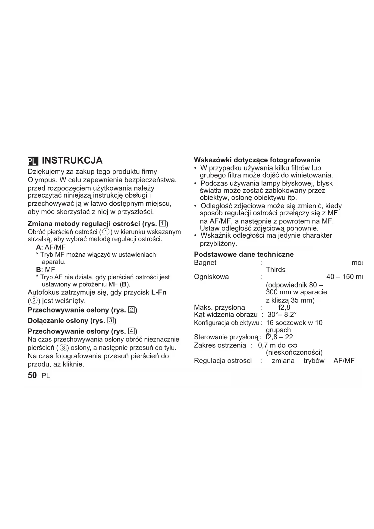INSTRUKCJA OBSŁUGI M.Zuiko Digital ED 40150mm f2.8 Pro OLYMPUS