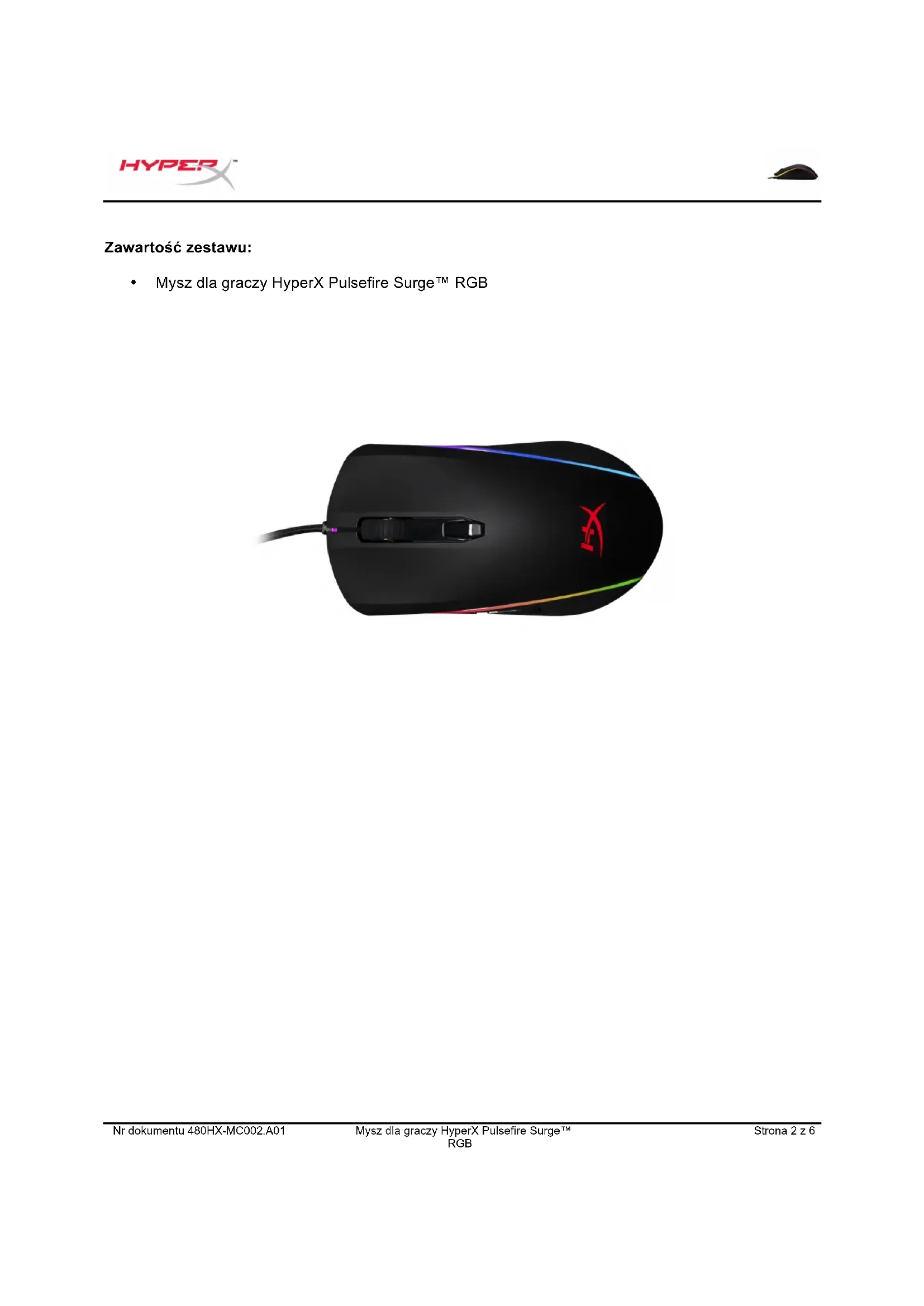 Przycisk DPI + przytrzymanie rolki myszy przez 10 sekund Przywrócenie ustawień fabrycznych myszy i wszystkich parametrów zapisanych w pamięci wbudowanej.Document No. 480HX-MC002.A01 Геймерская мышь HyperX Pulsefire Surge™ RGB Page 1 of 6
