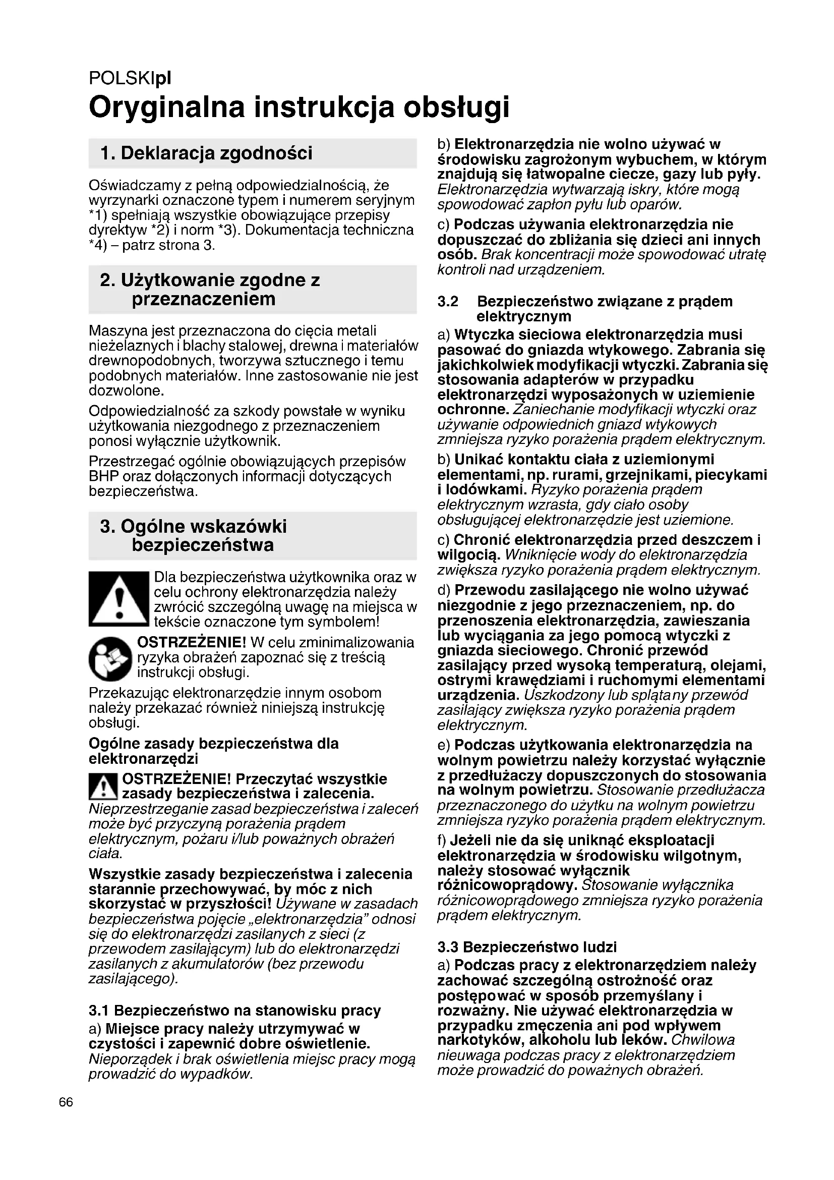 Oryginalna instrukcja obsługi Oświadczamy z pełną odpowiedzialnością, że wyrzynarki oznaczone typem i numerem seryjnym *1) spełniają wszystkie obowiązujące przepisy dyrektyw *2) i norm *3). Dokumentacja techniczna *4) – patrz strona 3. Maszyna jest przeznaczona do cięcia metali nieżelaznych i blachy stalowej, drewna i materiałów drewnopodobnych, tworzywa sztucznego i temu podobnych materiałów. Inne zastosowanie nie jest dozwolone. Odpowiedzialność za szkody powstałe w wyniku użytkowania niezgodnego z przeznaczeniem ponosi wyłącznie użytkownik. Przestrzegać ogólnie obowiązujących przepisów BHP oraz dołączonych informacji dotyczących bezpieczeństwa. Dla bezpieczeństwa użytkownika oraz w celu ochrony elektronarzędzia należy zwrócić szczególną uwagę na miejsca w tekście oznaczone tym symbolem! OSTRZEŻENIE! W celu zminimalizowania ryzyka obrażeń zapoznać się z treścią
