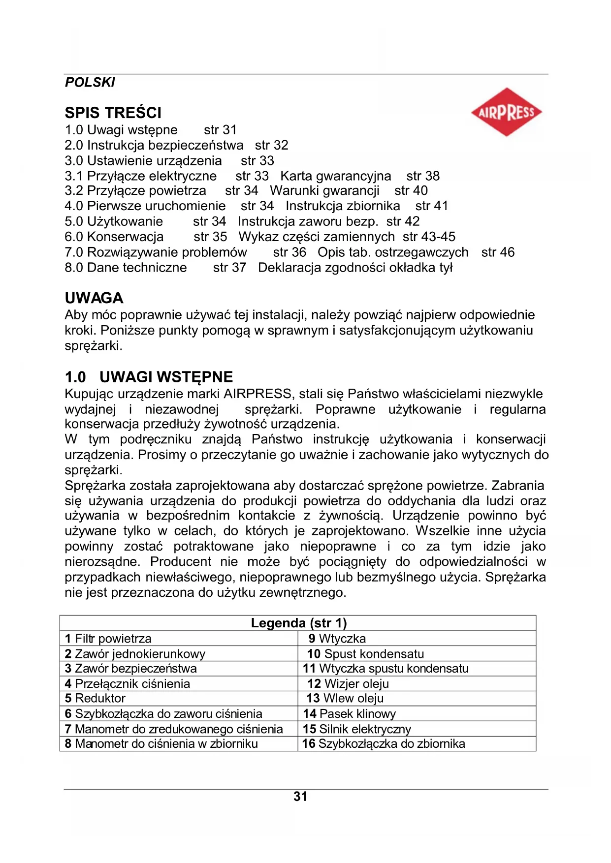 Kupując urządzenie marki AIRPRESS, stali się Państwo właścicielami niezwykle wydajnej i niezawodnej sprężarki. Poprawne użytkowanie i regularna konserwacja przedłuży żywotność urządzenia. W tym podręczniku znajdą Państwo instrukcję użytkowania i konserwacji urządzenia. Prosimy o przeczytanie go uważnie i zachowanie jako wytycznych do sprężarki. Sprężarka została zaprojektowana aby dostarczać sprężone powietrze. Zabrania się używania urządzenia do produkcji powietrza do oddychania dla ludzi oraz używania w bezpośrednim kontakcie z żywnością. Urządzenie powinno być używane tylko w celach, do których je zaprojektowano. Wszelkie inne użycia powinny zostać potraktowane jako niepoprawne i co za tym idzie jako nierozsądne. Producent nie może być pociągnięty do odpowiedzialności w przypadkach niewłaściwego, niepoprawnego lub bezmyślnego użycia. Sprężarka nie jest przeznaczona do użytku zewnętrznego. Legenda (str 1) 1 Filt r powietrza 9 Wtyczka 2 Za wór jednokierunkowy 10 Spust kondensatu 3 Za wór bezpieczeństwa 11 Wtyczka spustu kondensatu 4 Pr zełącznik ciśnienia 12 Wizjer oleju 5 Re duktor 13 Wlew oleju 6 Sz ybkozłączka do zaworu ciśnienia 14 Pasek klinowy 7 Manometr do zredukowanego ciśnienia 15 Silnik elektryczny 8 Ma nometr do ciśnienia w zbiorniku 16 Szybkozłączka do zbiornika32