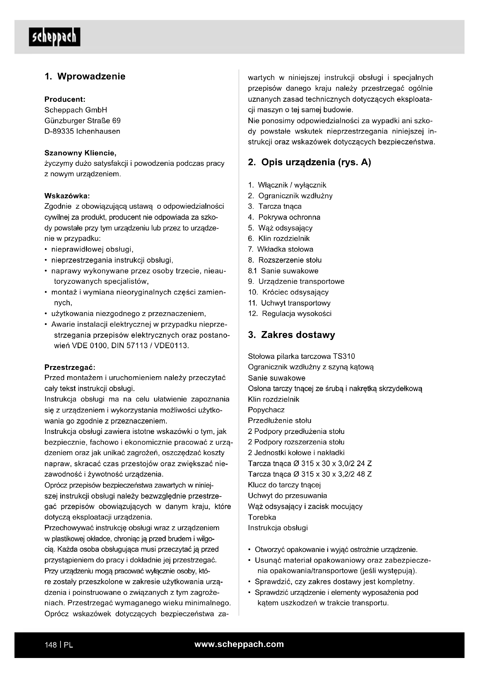 Producent: Scheppach GmbH Günzburger Straße 69 D-89335 Ichenhausen Szanowny Kliencie, życzymy dużo satysfakcji i powodzenia podczas pracy z nowym urządzeniem. Wskazówka: Zgodnie z obowiązującą ustawą o odpowiedzialności cywilnej za produkt, producent nie odpowiada za szko- dy powstałe przy tym urządzeniu lub przez to urządze- nie w przypadku: