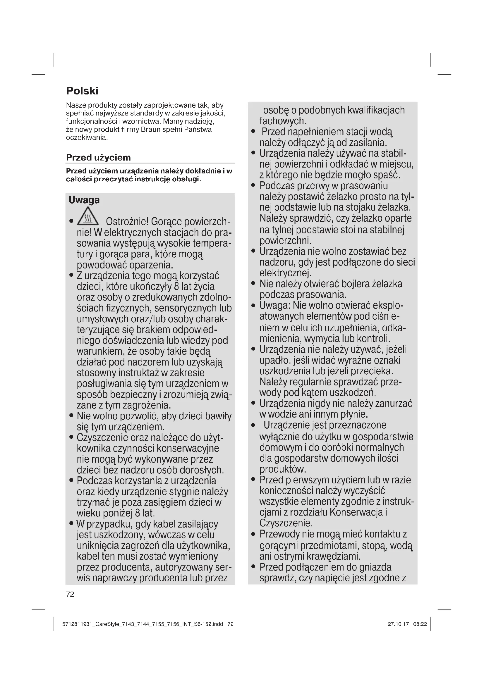 Przed podłączeniem do gniazda sprawdź, czy napięcie jest zgodne z 5712811931_CareStyle_7143_7144_7155_7156_INT_S6-152.indd 725712811931_CareStyle_7143_7144_7155_7156_INT_S6-152.indd 72 27.10.17 08:2227.10.17 08:2273 wartością podaną na spodzie urzą- dzenia, a używane gniazdo jest uzie- mione.