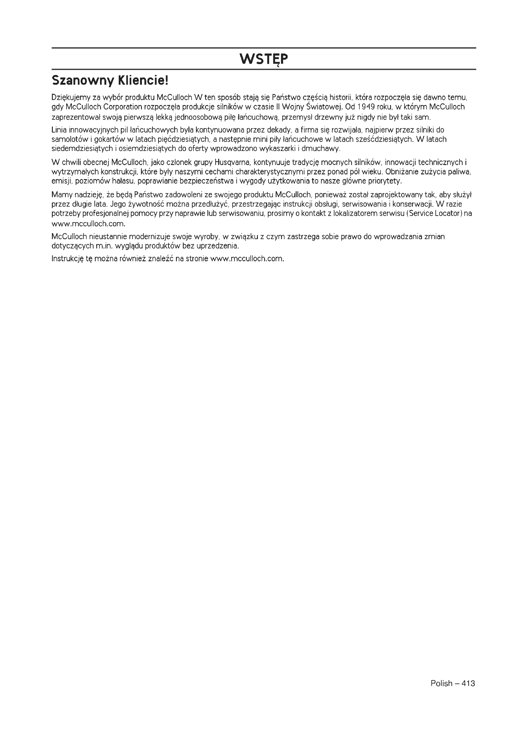 OSTRZE˚ENIE! W razie nieprawid∏owej lub nieuwa˝nej obs∏ugi, wykaszarka, wycinarka lub przycinarka mo˝e staç si´ niebezpiecznym narz´dziem, mogàcym spowodowaç powa˝ne obra˝enia lub Êmierç u˝ytkownika bàdê innych osób. Dlatego bardzo wa˝ne jest, aby przeczytaç niniejszà instrukcj´ obs∏ugi dok∏adnie i ze zrozumieniem. S1155295-38_3,B40B,BTELITE.fm Page 412 Thursday, September 13, 2018 8:00 AMPolish – 413 WST¢P Szanowny Kliencie! Dzi´kujemy za wybór produktu McCulloch W ten sposób stajà si´ Paƒstwo cz´Êcià historii, która rozpocz´∏a si´ dawno temu, gdy McCulloch Corporation rozpocz´∏a produkcje silników w czasie II Wojny Âwiatowej. Od 1949 roku, w którym McCulloch zaprezentowa∏ swojà pierwszà lekkà jednoosobowà pi∏´ ∏aƒcuchowà, przemys∏ drzewny ju˝ nigdy nie by∏ taki sam. Linia innowacyjnych pil ∏aƒcuchowych by∏a kontynuowana przez dekady, a firma si´ rozwija∏a, najpierw przez silniki do samolotów i gokartów w latach pi´çdziesiàtych, a nast´pnie mini pi∏y ∏aƒcuchowe w latach szeÊçdziesiàtych. W latach siedemdziesiàtych i osiemdziesiàtych do oferty wprowadzono wykaszarki i dmuchawy. W chwili obecnej McCulloch, jako cz∏onek grupy Husqvarna, kontynuuje tradycj´ mocnych silników, innowacji technicznych i wytrzyma∏ych konstrukcji, które by∏y naszymi cechami charakterystycznymi przez ponad pó∏ wieku. Obni˝anie zu˝ycia paliwa, emisji, poziomów ha∏asu, poprawianie bezpieczeƒstwa i wygody u˝ytkowania to nasze g∏ówne priorytety. Mamy nadziej´, ˝e b´dà Paƒstwo zadowoleni ze swojego produktu McCulloch, poniewa˝ zosta∏ zaprojektowany tak, aby s∏u˝y∏ przez d∏ugie lata. Jego ˝ywotnoÊç mo˝na przed∏u˝yç, przestrzegajàc instrukcji obs∏ugi, serwisowania i konserwacji. W razie potrzeby profesjonalnej pomocy przy naprawie lub serwisowaniu, prosimy o kontakt z lokalizatorem serwisu (Service Locator) na www.mcculloch.com. McCulloch nieustannie modernizuje swoje wyroby, w zwiàzku z czym zastrzega sobie prawo do wprowadzania zmian dotyczàcych m.in. wyglàdu produktów bez uprzedzenia. Instrukcj´ t´ mo˝na równie˝ znaleêç na stronie www.mcculloch.com. S1155295-38_3,B40B,BTELITE.fm Page 413 Thursday, September 13, 2018 8:00 AM414 – Polish CO JEST CO? Co jet co w wykaszarce?