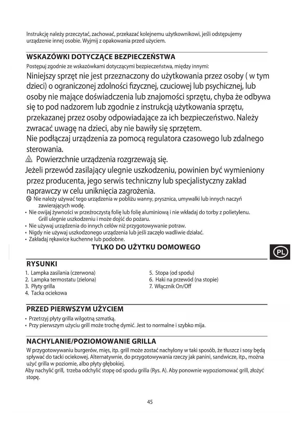 W przygotowywaniu burgerów, mięs, itp. grill może zostać nachylony w taki sposób, że tłuszcz i sosy będą spływać do tacki ociekowej. Alternatywnie, do przygotowywania rzeczy jak panini, sandwicze, itp., można użyć grilla w poziomie, albo płyty głębokiej. Aby nachylić grill, trzeba odchylić stopę od spodu grilla (Rys. A). Aby ponownie wypoziomować grill, złożyć stopę.