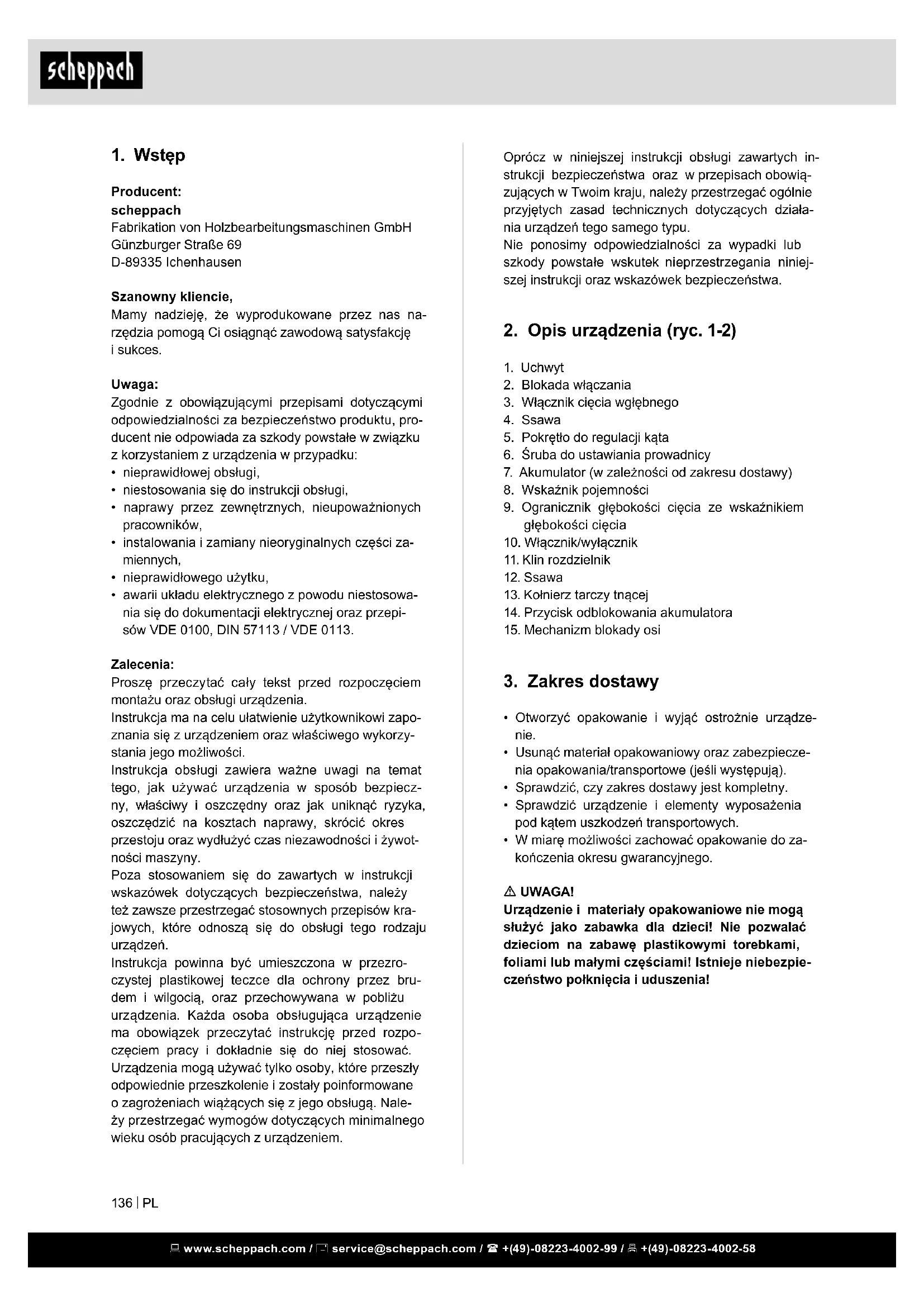 Producent: scheppach Fabrikation von Holzbearbeitungsmaschinen GmbH Günzburger Straße 69 D-89335 Ichenhausen Szanowny kliencie, Mamy nadzieję, że wyprodukowane przez nas na- rzędzia pomogą Ci osiągnąć zawodową satysfakcję i sukces. Uwaga: Zgodnie z obowiązującymi przepisami dotyczącymi odpowiedzialności za bezpieczeństwo produktu, pro- ducent nie odpowiada za szkody powstałe w związku z korzystaniem z urządzenia w przypadku: