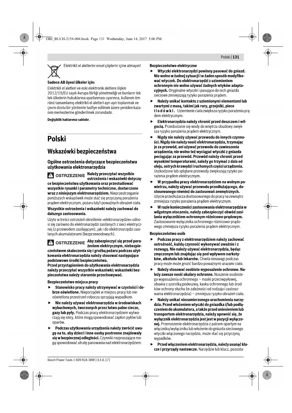 çimde oluğu kavramalıdır. Kontrol: Açı göstergesi 24 skalanın 5 0°-İşareti ile aynı doğruda olma- lıdır. Ayarlama: – Vidayı 45 bir filips uçlu tornavida ile gevşetin ve açı göster- gesini 0°-işareti boyunca doğrultun. – Vidayı tekrar sıkın. Nakliye (Bakınız: Şekil Q) Elektrikli el aletini nakletmeden önce şu işlemleri yapmalısı- nız: – Eğer sıkılı ise tespit vidasını 11 gevşetin. Alet kolunu sonu- na kadar öne çekin ve tespit vidasını tekrar sıkın. – Elektrikli el aletini taşıma konumuna getirin. – Elektrikli el aletine sabit olarak takılamayan bütün aksesu- arı alın. Kullanılmayan testere bıçaklarını taşırken mümkünse ka- palı bir kap içine yerleştirin. – Kaldırma veya nakliye için tutamak girintilerinden 4 kavra- yın, bu girintiler kesme masasının 22 yan tarafındadır. Elektrikli el aletini naklederken daima nakliye döna- nımlarını kullanın ve hiçbir zaman koruyucu donanımla- rı kullanmayın. Bakım ve servis Bakım ve temizlik Elektrikli el aletinin kendinde bir çalışma yapmadan önce her defasında fişi prizden çekin. Yedek bağlantı kablosu gerekli ise, güvenliğin tehlikeye düş- memesi için Bosch’tan veya yetkili bir servisten temin edilme- lidir. Temizlik İyi ve güvenli çalışabilmek için elektrikli el aletini ve havalan- dırma aralıklarını temiz tutun. Pandül hareketli koruyucu kapak her zaman serbest hareket edebilmeli ve kendiliğinden kapanmalıdır. Bu nedenle pandül hareketli koruyucu kapağın çevresini her zaman temiz tutun. Her çalışmadan sonra toz ve talaşı basınçlı hava veya fırçayla temizleyin. Kayıcı makarayı 20 düzenli aralıklarla temizleyin. Aksesuar Müşteri hizmeti ve uygulama danışmanlığı Müşteri hizmeti ürününüzün onarım, bakım ve yedek parçala- rına ilişkin sorularınızı yanıtlandırır. Demonte görünüşler ve yedek parçalara ilişkin ayrıntılı bilgiyi aşağıdaki Web sayfasın- da bulabilirsiniz: www.bosch-pt.com Ürün kodu Vidalı işkence 1 609 B04 224 Besleme levhaları 1 609 B05 242 Toz torbası 1 609 B05 010 Ahşap, levha malzeme, panel ve çıtalar için testere bıçak- ları Testere bıçağı 216 x 30 mm, 48 dişli 2 608 640 641 Plastik ve demir dışı metaller için testere bıçakları Testere bıçağı 216 x 30 mm, 80 dişli 2 608 640 447 Laminat zemin türleri için testere bıçakları Testere bıçağı 216 x 30 mm, 60 dişli 2 608 642 133 OBJ_BUCH-2154-004.book Page 129 Wednesday, June 14, 2017 5:06 PM130 | Türkçe 1 609 92A 3BW | (14.6.17) Bosch Power Tools Bosch uygulama danışmanlığı ekibi ürünlerimize ve ilgili akse- suara ilişkin sorularınızda size memnuniyetle yardımcı olur. Bütün başvuru ve yedek parça siparişlerinizde ürünün tip eti- keti üzerindeki 10 haneli ürün kodunu mutlaka belirtin. Sadece Türkiye için geçerlidir: Bosch genel olarak yedek parçaları 7 yıl hazır tutar. Türkçe Bosch Sanayi ve Ticaret A.Ş. Elektrikli El Aletleri Aydınevler Mah. İnönü Cad. No: 20 Küçükyalı Ofis Park A Blok 34854 Maltepe-İstanbul Tel.: 444 80 10 Fax: +90 216 432 00 82 E-mail: iletisim@bosch.com.tr www.bosch.com.tr Bulsan Elektrik İstanbul Cad. Devrez Sok. İstanbul Çarşısı No: 48/29 İskitler Ankara Tel.: +90 312 3415142 Tel.: +90 312 3410302 Fax: +90 312 3410203 E-mail: bulsanbobinaj@gmail.com Faz Makine Bobinaj Cumhuriyet Mah. Sanayi Sitesi Motor İşleri Bölümü 663 Sk. No:18 Antalya Tel.: +90 242 3465876 Tel.: +90 242 3462885 Fax: +90 242 3341980 E-mail: info@fazmakina.com.tr Körfez Elektrik Karaağaç Mah. Sümerbank Cad. No:18/2 Erzincan Tel.: +90 446 2230959 Fax: +90 446 2240132 E-mail: bilgi@korfezelektrik.com.tr Değer İş Bobinaj İsmetpaşa Mah. İlk Belediye Başkan Cad. 5/C Şahinbey/Gaziantep Tel.: +90 342 2316432 Fax: +90 342 2305871 E-mail: degerisbobinaj@hotmail.com Tek Çözüm Bobinaj Küsget San.Sit.A Blok 11Nolu Cd.No:49/A Şehitkamil/Gaziantep Tel.: +90 342 2351507 Fax: +90 342 2351508 E-mail: cozumbobinaj2@hotmail.com Günşah Otomotiv Beylikdüzü Sanayi Sit. No: 210 Beylikdüzü İstanbul Tel.: +90 212 8720066 Fax: +90 212 8724111 E-mail: gunsahelektrik@ttmail.com Aygem 10021 Sok. No: 11 AOSB Çiğli İzmir Tel.: +90232 3768074 Fax: +90 232 3768075 E-mail: boschservis@aygem.com.tr Sezmen Bobinaj Ege İş Merkezi 1201/4 Sok. No: 4/B Yenişehir İzmir Tel.: +90 232 4571465 Tel.: +90 232 4584480 Fax: +90 232 4573719 E-mail: info@sezmenbobinaj.com.tr Ankaralı Elektrik Eski Sanayi Bölgesi 3. Cad. No: 43 Kocasinan Kayseri Tel.: +90 352 3364216 Tel.: +90 352 3206241 Fax: +90 352 3206242 E-mail: gunay@ankarali.com.tr Asal Bobinaj Eski Sanayi Sitesi Barbaros Cad. No: 24/C Samsun Tel.: +90 362 2289090 Fax: +90 362 2289090 E-mail: bpsasalbobinaj@hotmail.com Üstündağ Elektrikli Aletler Nusretiye Mah. Boyacılar Aralığı No: 9 Tekirdağ Tel.: +90 282 6512884 Fax: +90 282 6521966 E-mail: info@ustundagsogutma.com Marmara Elektrik Tersane cd. Zencefil Sok.No:6 Karaköy İstanbul Tel.: +90 212 2974320 Fax: +90 212 2507200 E-mail: info@marmarabps.com Bağrıaçıklar Oto Elektrik Motorlu Sanayi Çarşısı Doğruer Sk. No:9 Selçuklu Konya Tel.: +90 332 2354576 Tel.: +90 332 2331952 Fax: +90 332 2363492 E-mail: bagriaciklarotoelektrik@gmail.com Ermenistan, Azerbaycan, Gürcistan, Kırgızistan, Moğolistan, Tacikistan, Türkmenistan, Özbekistan TOO “Robert Bosch” Power Tools, Satış Sonrası Servis Rayimbek Cad., 169/1 050050, Almatı, Kazakistan Servis E-posta: service.pt.ka@bosch.com Resmi İnternet Sitesi: www.bosch.com, www.bosch-pt.com Tasfiye Elektrikli el aleti, aksesuar ve ambalaj malzemesi çevre dostu bir yöntemle tasfiye edilmek üzere tekrar kazanım merkezine gönderilmelidir. OBJ_BUCH-2154-004.book Page 130 Wednesday, June 14, 2017 5:06 PMPolski | 131 Bosch Power Tools 1 609 92A 3BW | (14.6.17) Elektrikli el aletlerini evsel çöplerin içine atmayın! Sadece AB üyesi ülkeler için: Elektrikli el aletleri