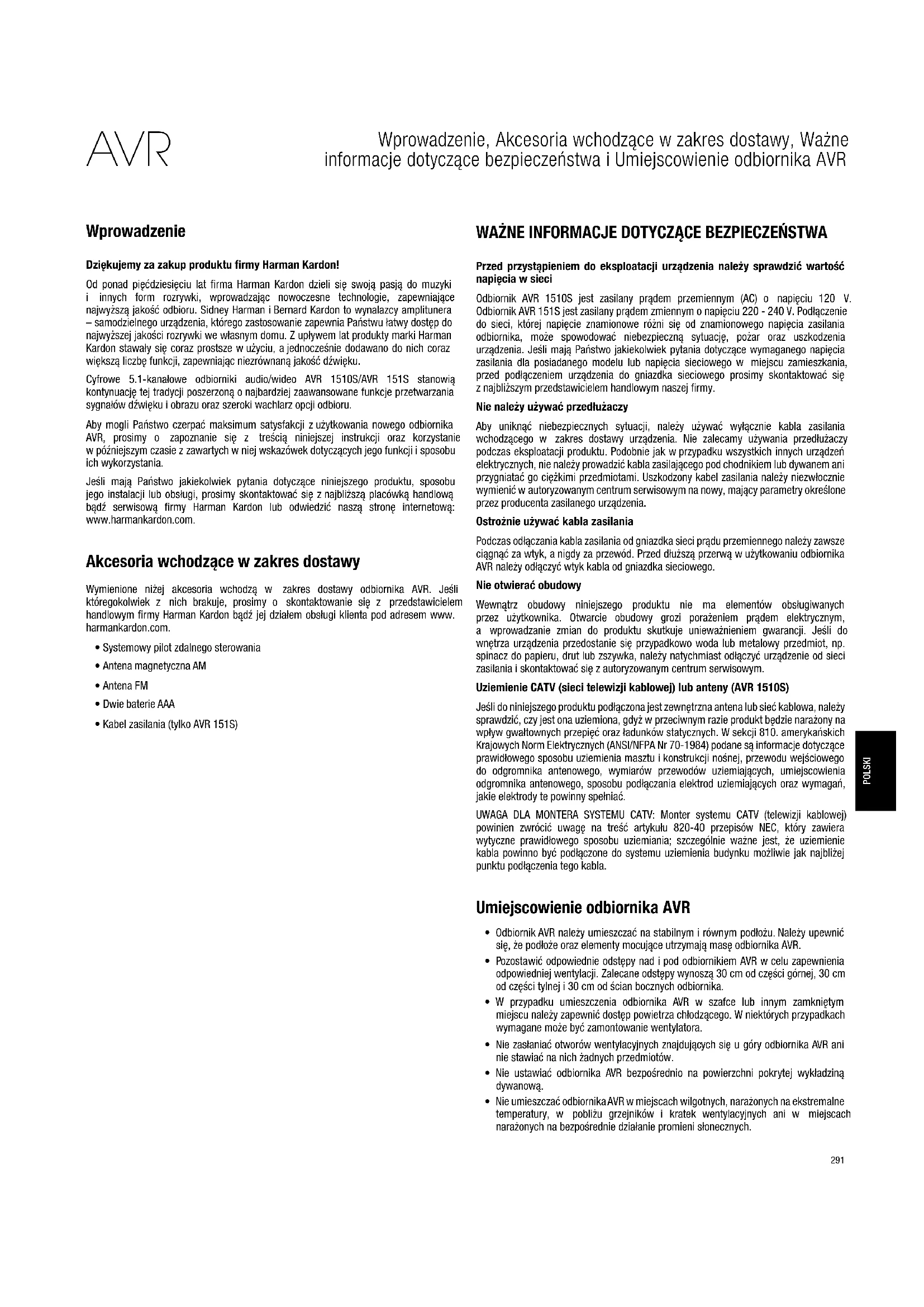 Wprowadzenie Dziękujemy za zakup produktu firmy Harman Kardon! Od ponad pięćdziesięciu lat firma Harman Kardon dzieli się swoją pasją do muzyki i innych form rozrywki, wprowadzając nowoczesne technologie, zapewniające najwyższą jakość odbioru. Sidney Harman iBernard Kardon to wynalazcy amplitunera – samodzielnego urządzenia, którego zastosowanie zapewnia Państwu łatwy dostęp do najwyższej jakości rozrywki we własnym domu. Zupływem lat produkty marki Harman Kardon stawały się coraz prostsze wużyciu, ajednocześnie dodawano do nich coraz większą liczbę funkcji, zapewniając niezrównaną jakość dźwięku. Cyfrowe 5.1-kanałowe odbiorniki audio/wideo AVR 1510S/AVR 151S stanowią kontynuację tej tradycji poszerzoną onajbardziej zaawansowane funkcje przetwarzania sygnałów dźwięku iobrazu oraz szeroki wachlarz opcji odbioru. Aby mogli Państwo czerpać maksimum satysfakcji zużytkowania nowego odbiornika AVR, prosimy o zapoznanie się z treścią niniejszej instrukcji oraz korzystanie wpóźniejszym czasie zzawartych wniej wskazówek dotyczących jego funkcji isposobu ich wykorzystania. Jeśli mają Państwo jakiekolwiek pytania dotyczące niniejszego produktu, sposobu jego instalacji lub obsługi, prosimy skontaktować się znajbliższą placówką handlową bądź serwisową firmy Harman Kardon lub odwiedzić naszą stronę internetową: www.harmankardon.com. Akcesoria wchodzące wzakres dostawy Wymienione niżej akcesoria wchodzą w zakres dostawy odbiornika AVR. Jeśli któregokolwiek z nich brakuje, prosimy o skontaktowanie się z przedstawicielem handlowym firmy Harman Kardon bądź jej działem obsługi klienta pod adresem www. harmankardon.com.