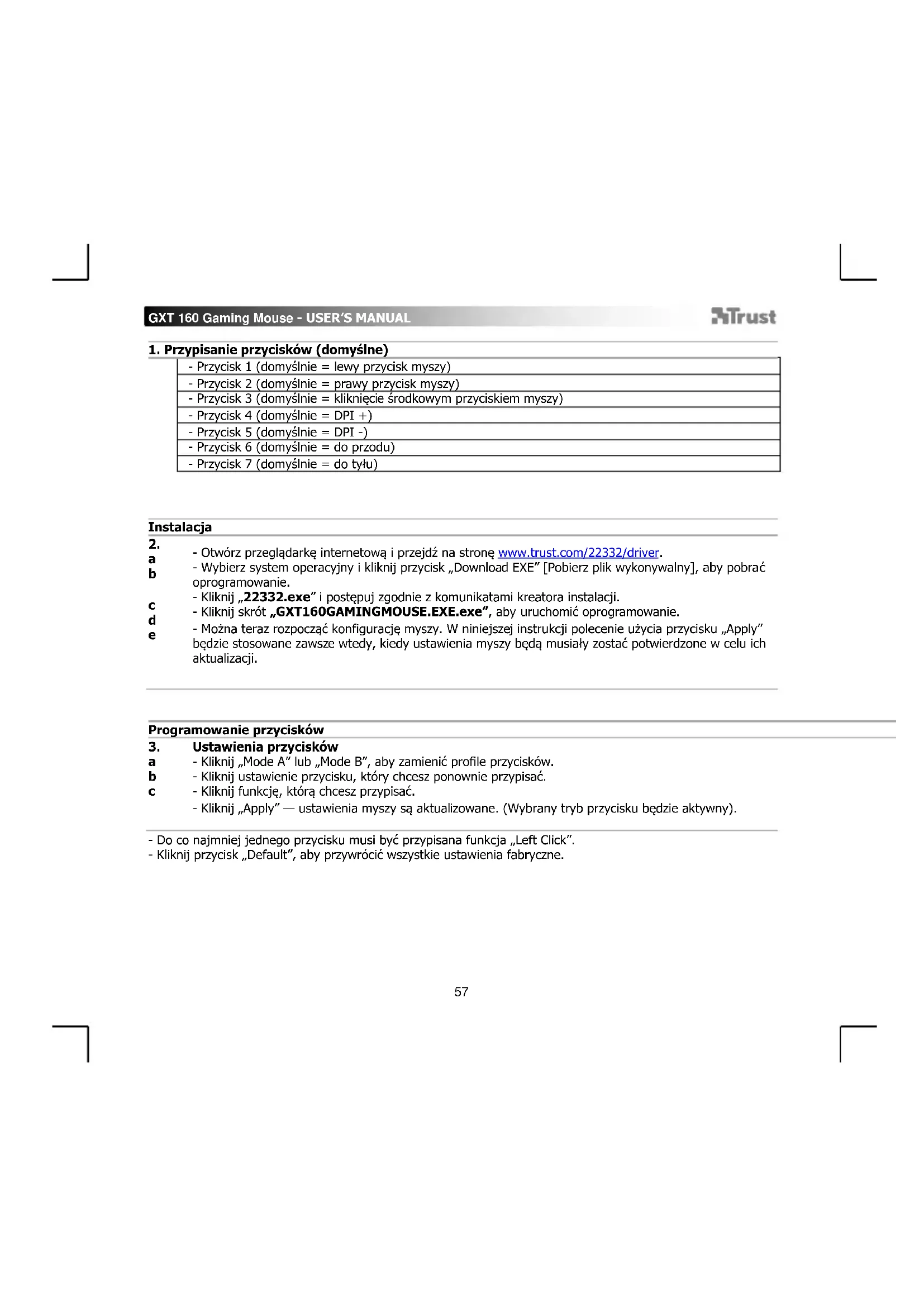 - Otwórz przeglądarkę internetową i przejdź na stronę www.trust.com/22332/driver. - Wybierz system operacyjny i kliknij przycisk „Download EXE” [Pobierz plik wykonywalny], aby pobrać oprogramowanie. - Kliknij „22332.exe” i postępuj zgodnie z komunikatami kreatora instalacji. - Kliknij skrót „GXT160GAMINGMOUSE.EXE.exe”, aby uruchomić oprogramowanie. - Można teraz rozpocząć konfigurację myszy. W niniejszej instrukcji polecenie użycia przycisku „Apply” będzie stosowane zawsze wtedy, kiedy ustawienia myszy będą musiały zostać potwierdzone w celu ich aktualizacji.