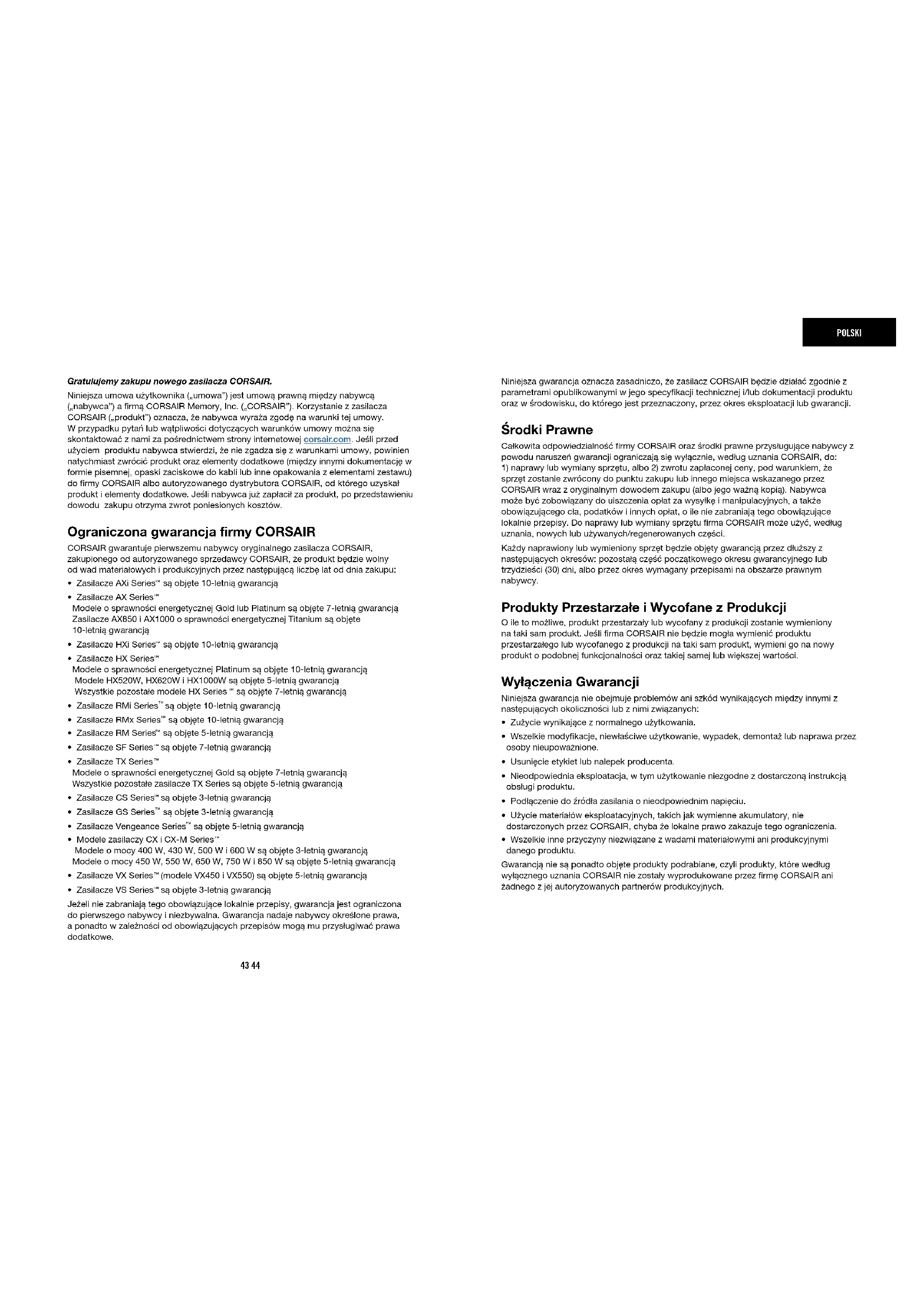 destas instruções de segurança anulará imediatamente todas as garantias.43 44 POLSKI Gratulujemy zakupu nowego zasilacza CORSAIR. Niniejsza umowa użytkownika („umowa”) jest umową prawną między nabywcą („nabywca”) a firmą CORSAIR Memory, Inc. („CORSAIR”). Korzystanie z zasilacza CORSAIR („produkt”) oznacza, że nabywca wyraża zgodę na warunki tej umowy. W przypadku pytań lub wątpliwości dotyczących warunków umowy można się skontaktować z nami za pośrednictwem strony internetowej corsair.com. Jeśli przed użyciem produktu nabywca stwierdzi, że nie zgadza się z warunkami umowy, powinien natychmiast zwrócić produkt oraz elementy dodatkowe (między innymi dokumentację w formie pisemnej, opaski zaciskowe do kabli lub inne opakowania z elementami zestawu) do firmy CORSAIR albo autoryzowanego dystrybutora CORSAIR, od którego uzyskał produkt i elementy dodatkowe. Jeśli nabywca już zapłacił za produkt, po przedstawieniu dowodu zakupu otrzyma zwrot poniesionych kosztów. Ograniczona gwarancja firmy CORSAIR CORSAIR gwarantuje pierwszemu nabywcy oryginalnego zasilacza CORSAIR, zakupionego od autoryzowanego sprzedawcy CORSAIR, że produkt będzie wolny od wad materiałowych i produkcyjnych przez następującą liczbę lat od dnia zakupu: