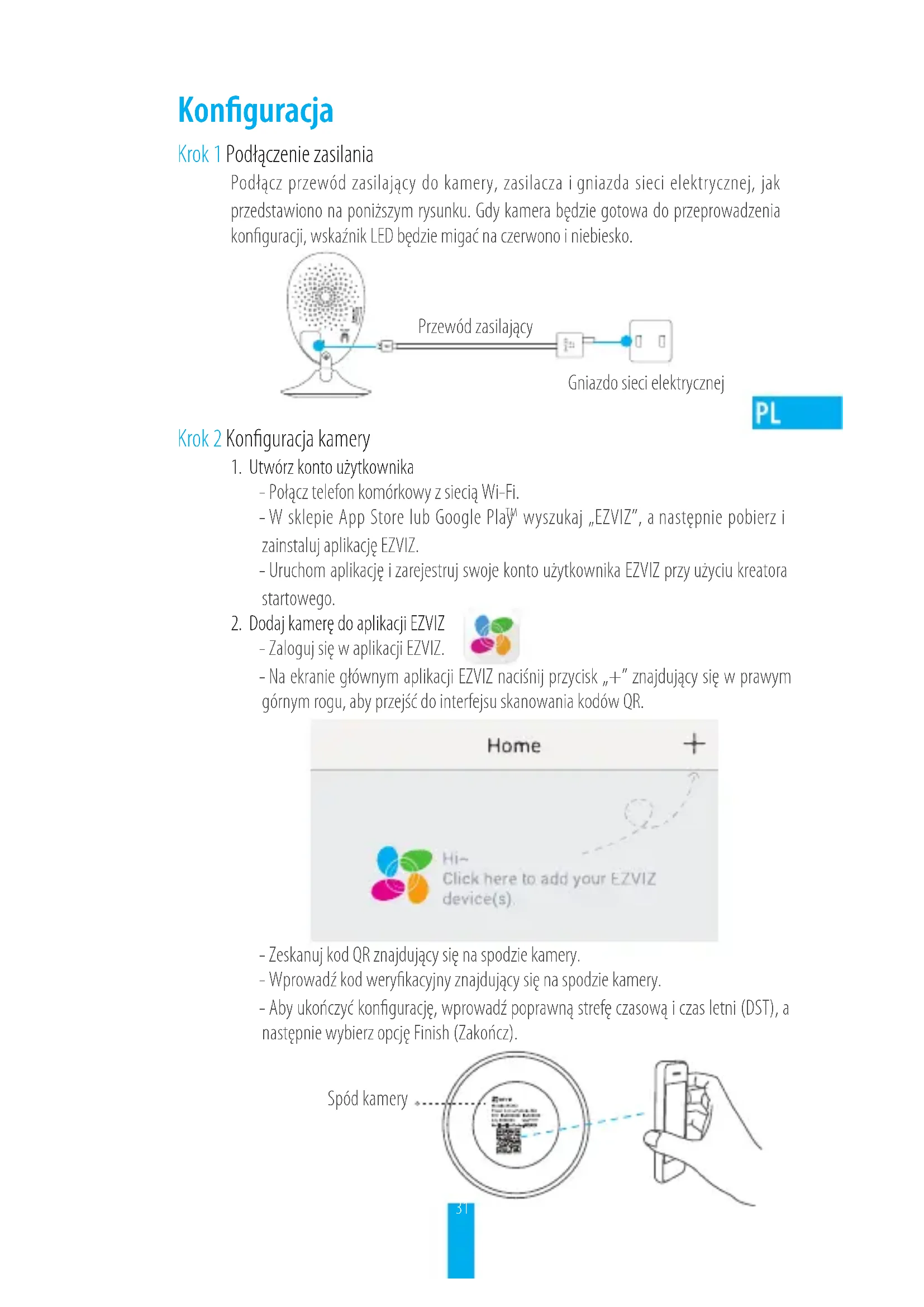 - Zaloguj się w aplikacji EZVIZ. - Na ekranie głównym aplikacji EZVIZ naciśnij przycisk „+” znajdujący się w prawym górnym rogu, aby przejść do interfejsu skanowania kodów QR. - Zeskanuj kod QR znajdujący się na spodzie kamery. - Wprowadź kod werykacyjny znajdujący się na spodzie kamery. - Aby ukończyć kongurację, wprowadź poprawną strefę czasową i czas letni (DST), a następnie wybierz opcję Finish (Zakończ). Spód kamery32