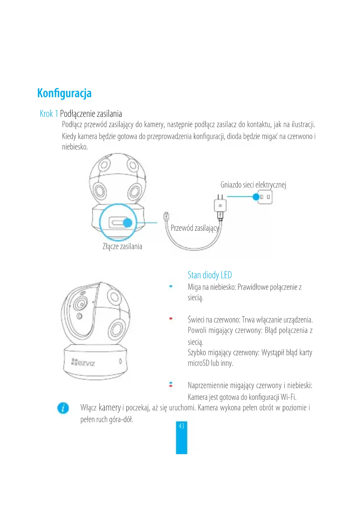 LED-indicator Luidspreker Power Interface Interfaccia LAN Power Interface Luidspreker LED-indicator43 Konguracja Krok 1 Podłączenie zasilania Podłącz przewód zasilający do kamery, następnie podłącz zasilacz do kontaktu, jak na ilustracji. Kiedy kamera będzie gotowa do przeprowadzenia konguracji, dioda będzie migać na czerwono i niebiesko. Złącze zasilania Przewód zasilający Gniazdo sieci elektrycznej Stan diody LED Miga na niebiesko: Prawidłowe połączenie z siecią. Świeci na czerwono: Trwa włączanie urządzenia. Powoli migający czerwony: Błąd połączenia z siecią. Szybko migający czerwony: Wystąpił błąd karty microSD lub inny. Naprzemiennie migający czerwony i niebieski: Kamera jest gotowa do konguracji Wi-Fi. Włącz kamery i poczekaj, aż się uruchomi. Kamera wykona pełen obrót w poziomie i pełen ruch góra-dół.44 Krok 2 Konguracja kamery