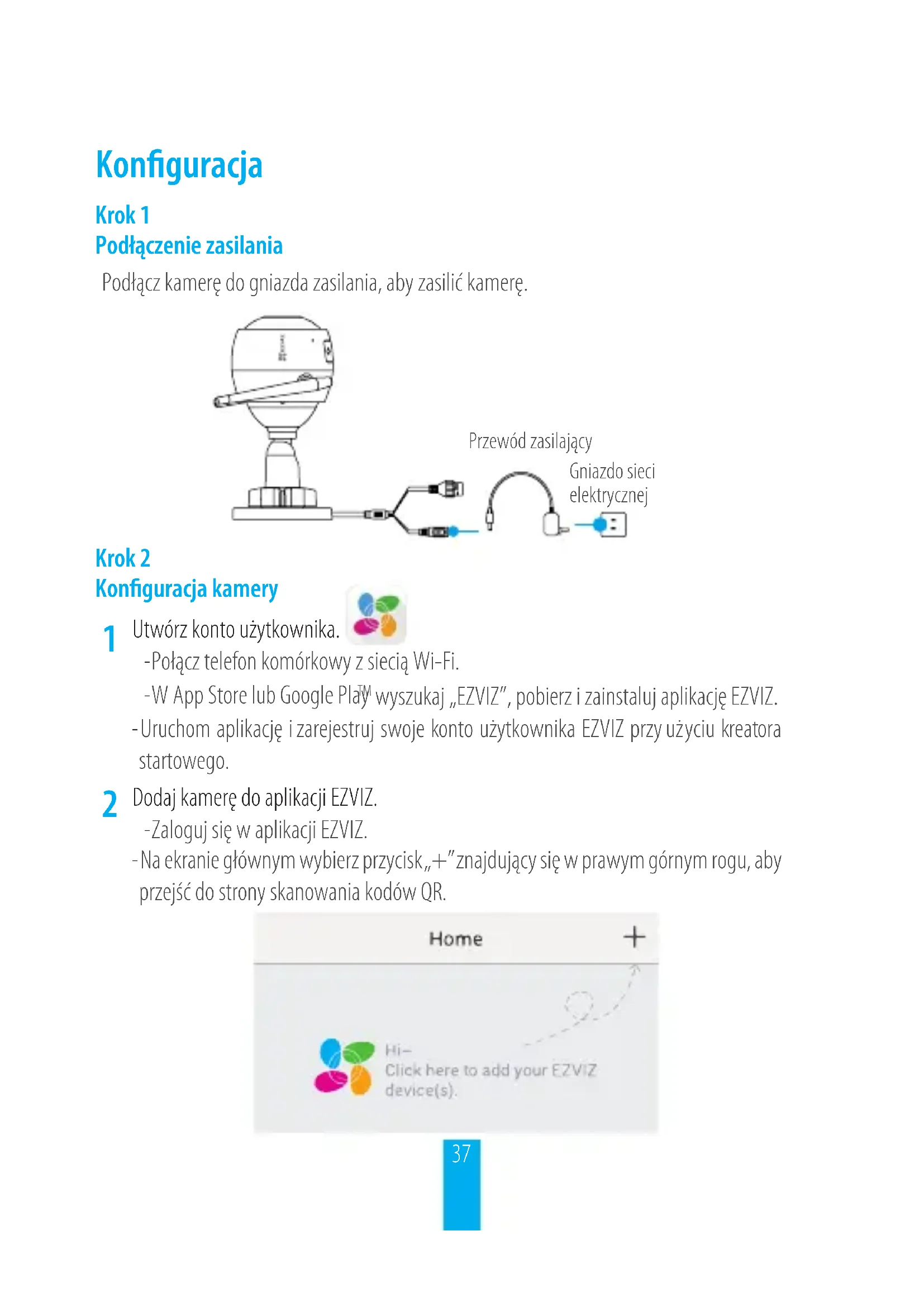 Dodaj kamerę do aplikacji EZVIZ. -Zaloguj się w aplikacji EZVIZ. -Na ekranie głównym wybierz przycisk „+” znajdujący się w prawym górnym rogu, aby przejść do strony skanowania kodów QR.38 -Zeskanuj kod QR znajdujący się na korpusie kamery.