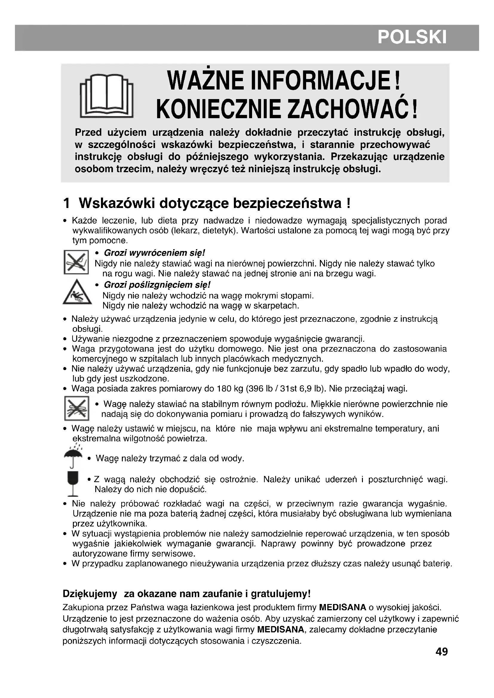- Waga przygotowana jest do użytku domowego. Nie jest ona przeznaczona do zastosowania komercyjnego w szpitalach lub innych placówkach medycznych.• Nie należy używać urządzenia, gdy nie funkcjonuje bez zarzutu, gdy spadło lub wpadło do wody,lub gdy jest uszkodzone.• Waga posiada zakres pomiarowy do 180 kg (396 lb / 31st 6,9 lb). Nie przeciążaj wagi.• Wagę należy stawiać na stabilnym równym podłożu. Miękkie nierówne powierzchnie nienadają się do dokonywania pomiaru i prowadzą do fałszywych wyników.• Wagę należy ustawić w miejscu, na które nie maja wpływu ani ekstremalne temperatury, aniekstremalna wilgotność powietrza.• Wagę należy trzymać z dala od wody.