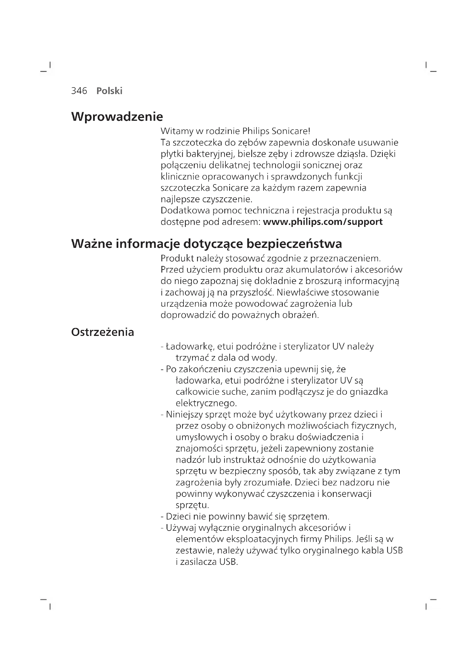 Polski Wprowadzenie Witamy w rodzinie Philips Sonicare! Ta szczoteczka do zębów zapewnia doskonałe usuwanie płytki bakteryjnej, bielsze zęby i zdrowsze dziąsła. Dzięki połączeniu delikatnej technologii sonicznej oraz klinicznie opracowanych i sprawdzonych funkcji szczoteczka Sonicare za każdym razem zapewnia najlepsze czyszczenie. Dodatkowa pomoc techniczna i rejestracja produktu są dostępne pod adresem: www.philips.com/support Ważne informacje dotyczące bezpieczeństwa Produkt należy stosować zgodnie z przeznaczeniem. Przed użyciem produktu oraz akumulatorów i akcesoriów do niego zapoznaj się dokładnie z broszurą informacyjną i zachowaj ją na przyszłość. Niewłaściwe stosowanie urządzenia może powodować zagrożenia lub doprowadzić do poważnych obrażeń. Ostrzeżenia - Ładowarkę, etui podróżne isterylizatorUV należy trzymać zdala od wody. - Po zakończeniu czyszczenia upewnij się, że ładowarka, etui podróżne isterylizatorUV są całkowicie suche, zanim podłączysz je do gniazdka elektrycznego. - Niniejszy sprzęt może być użytkowany przez dzieci i przez osoby o obniżonych możliwościach fizycznych, umysłowych i osoby o braku doświadczenia i znajomości sprzętu, jeżeli zapewniony zostanie nadzór lub instruktaż odnośnie do użytkowania sprzętu w bezpieczny sposób, tak aby związane z tym zagrożenia były zrozumiałe. Dzieci bez nadzoru nie powinny wykonywać czyszczenia i konserwacji sprzętu. - Dzieci nie powinny bawić się sprzętem. - Używaj wyłącznie oryginalnych akcesoriów i elementów eksploatacyjnych firmy Philips. Jeśli są w zestawie, należy używać tylko oryginalnego kabla USB i zasilacza USB.347 Polski - To urządzenie nie zawiera elementów, które można samodzielnie wymienić lub naprawić. Jeśli urządzenie jest uszkodzone, nie używaj go i skontaktuj się z Centrum Obsługi Klienta w swoim kraju (patrz „Gwarancja i pomoc techniczna”). - Jeżeli przewód lub zasilacz USB jest uszkodzony, należy zaprzestać jego używania. - Nie używaj ładowarki, etui podróżnego ani sterylizatoraUV poza budynkiem ani w pobliżu źródeł ciepła. - Nie należy czyścić żadnych części urządzenia w zmywarce do naczyń. - To urządzenie jest przeznaczone wyłącznie do czyszczenia zębów, dziąseł i języka. - Zawsze przechowuj sterylizatorUV poza zasięgiem dzieci. - Przerwij korzystanie ze sterylizatoraUV, jeśli dioda LED / żarówka UV pozostaje włączona, gdy sterylizatorUV jest otwarty. Promieniowanie UV może być szkodliwe dla oczu i skóry. - Z dezynfektora należy korzystać wyłącznie z założonym ekranem ochronnym. - Nie dotykaj żarówki sterylizatora UV, gdy jest ona gorąca. - Nie używaj końcówki z połamanym lub wygiętym włosiem. Końcówkę szczoteczki wymieniaj co 3 miesiące lub częściej, gdy widoczne są ślady zużycia. - Unikać kontaktu z produktami zawierającymi olejki eteryczne lub olej kokosowy. Kontakt może spowodować wypadnięcie włosia. - Maksymalna wysokość użytkowania wynosi 4500 metrów n.p.m.
