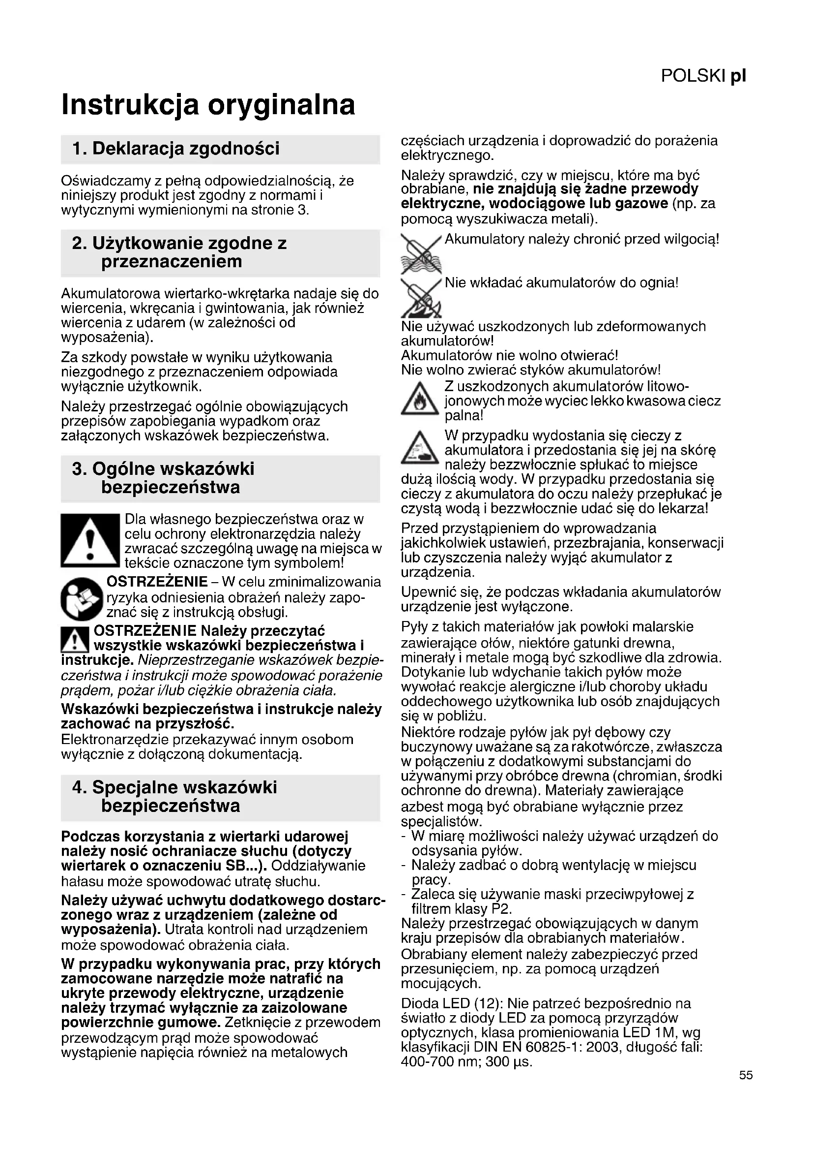 Instrukcja oryginalna Oświadczamy z pełną odpowiedzialnością, że niniejszy produkt jest zgodny z normami i wytycznymi wymienionymi na stronie 3. Akumulatorowa wiertarko-wkrętarka nadaje się do wiercenia, wkręcania i gwintowania, jak również wiercenia z udarem (w zależności od wyposażenia). Za szkody powstałe w wyniku użytkowania niezgodnego z przeznaczeniem odpowiada wyłącznie użytkownik. Należy przestrzegać ogólnie obowiązujących przepisów zapobiegania wypadkom oraz załączonych wskazówek bezpieczeństwa. Dla własnego bezpieczeństwa oraz w celu ochrony elektronarzędzia należy zwracać szczególną uwagę na miejsca w tekście oznaczone tym symbolem! OSTRZEŻENIE – W celu zminimalizowania ryzyka odniesienia obrażeń należy zapo- znać się z instrukcją obsługi. OSTRZEŻEN IE Należy przeczytać wszystkie wskazówki bezpieczeństwa i instrukcje. Nieprzestrzeganie wskazówek bezpie- czeństwa i instrukcji może spowodować porażenie prądem, pożar i/lub ciężkie obrażenia ciała. Wskazówki bezpieczeństwa i instrukcje należy zachować na przyszłość. Elektronarzędzie przekazywać innym osobom wyłącznie z dołączoną dokumentacją. Podczas korzystania z wiertarki udarowej należy nosić ochraniacze słuchu (dotyczy wiertarek o oznaczeniu SB...). Oddziaływanie hałasu może spowodować utratę słuchu. Należy używać uchwytu dodatkowego dostarc- zonego wraz z urządzeniem (zależne od wyposażenia). Utrata kontroli nad urządzeniem może spowodować ob rażen ia ciała. W przypadku wykonywania prac, przy których zamocowane narzędzie może natrafić na ukryte przewody elektryczne, urządzenie należy trzymać wyłącznie za zaizolowane powierzchnie gumowe. Zetknięcie z przewodem przewodzącym prąd może spowodować wystąpienie napięcia również na metalowych częściach urządzenia i doprowadzić do porażenia elektrycznego. Należy sprawdzić, czy w miejscu, które ma być obrabiane, nie znajdują się żadne przewody elektryczne, wodociągowe lub gazowe (np. za pomocą wyszukiwacza metali). Akumulatory należy chronić przed wilgocią! Nie wkładać akumulatorów do ognia! Nie używać uszkodzonych lub zdeformowanych akumulatorów! Akumulatorów nie wolno otwierać! Nie wolno zwierać styków akumulatorów! Z uszkodzonych akumul