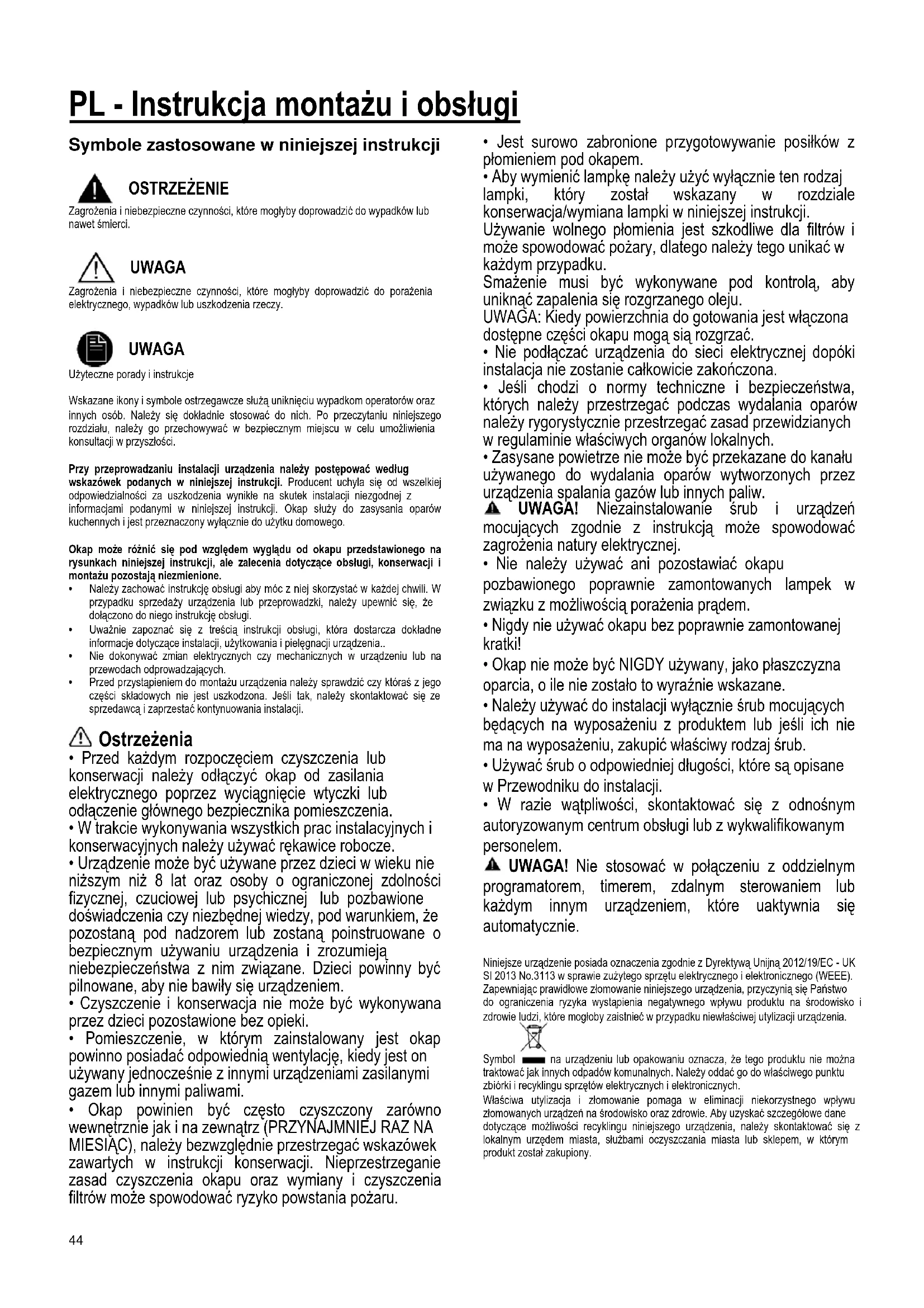 - W razie wątpliwości, skontaktować się z odnośnym autoryzowanym centrum obsługi lub z wykwalifikowanym personelem. UWAGA! Nie stosować w połączeniu z oddzielnym programatorem, timerem, zdalnym sterowaniem lub każdym innym urządzeniem, które uaktywnia się automatycznie. Niniejsze urządzenie posiada oznaczenia zgodnie z Dyrektywą Unijną 2012/19/EC - UK SI 2013 No.3113 w sprawie zużytego sprzętu elektrycznego i elektronicznego (WEEE). Zapewniając prawidłowe złomowanie niniejszego urządzenia, przyczynią się Państwo do ograniczenia ryzyka wystąpienia negatywnego wpływu produktu na środowisko i zdrowie ludzi, które mogłoby zaistnieć w przypadku niewłaściwej utylizacji urządzenia. Symbol na urządzeniu lub opakowaniu oznacza, że tego produktu nie można traktować jak innych odpadów komunalnych. Należy oddać go do właściwego punktu zbiórki i recyklingu sprzętów elektrycznych i elektronicznych. Właściwa utylizacja i złomowanie pomaga w eliminacji niekorzystnego wpływu złomowanych urządzeń na środowisko oraz zdrowie. Aby uzyskać szczegółowe dane dotyczące możliwości recyklingu niniejszego urządzenia, należy skontaktować się z lokalnym urzędem miasta, służbami oczyszczania miasta lub sklepem, w którym produkt został zakupiony.45 Urządzenie zostało zaprojektowane, przetestowane i wyprodukowane zgodnie z następującymi warunkami:
