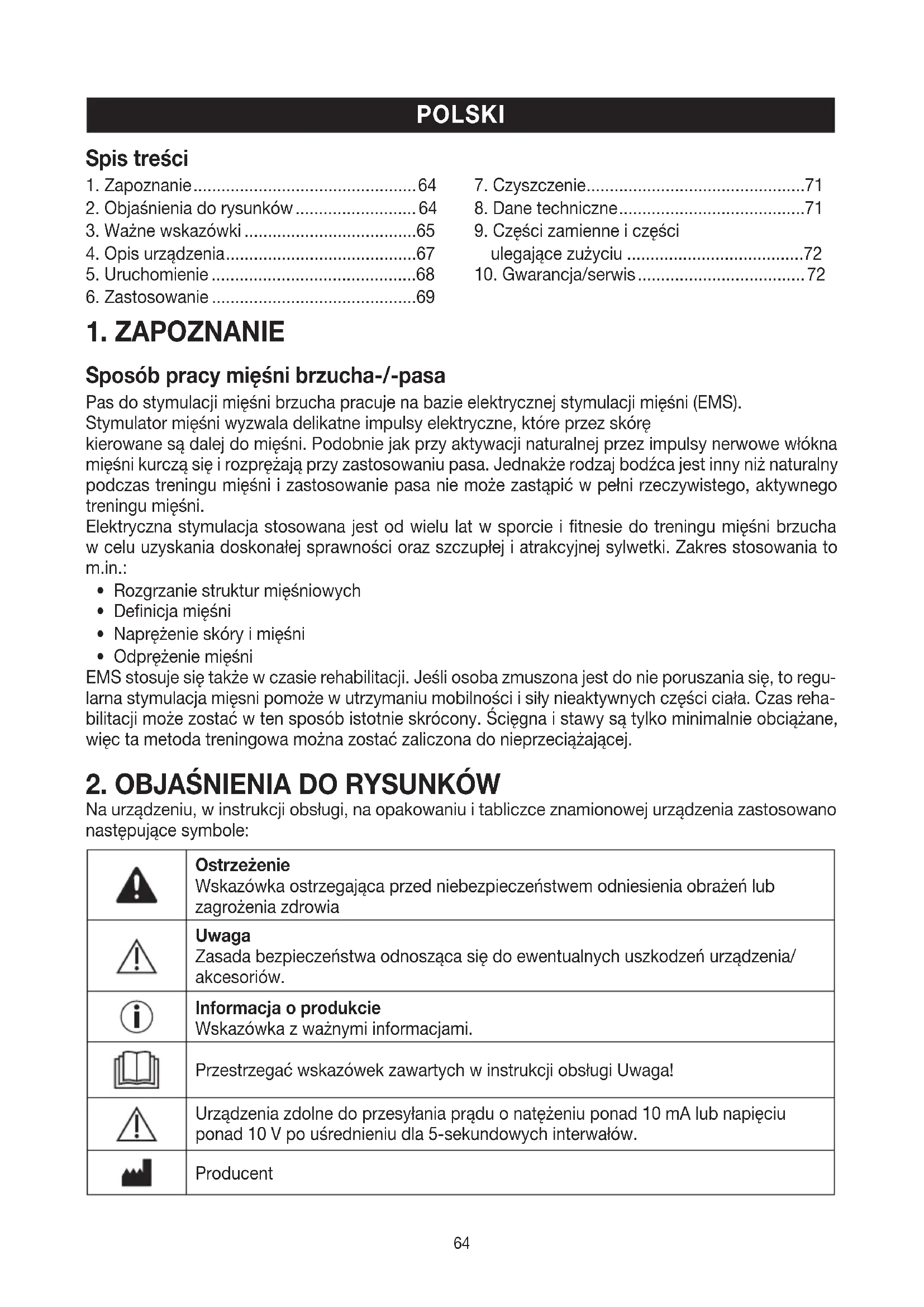Na urządzeniu, w instrukcji obsługi, na opakowaniu i tabliczce znamionowej urządzenia zastosowano następujące symbole: Ostrzeżenie Wskazówka ostrzegająca przed niebezpieczeństwem odniesienia obrażeń lub zagrożenia zdrowia Uwaga Zasada bezpieczeństwa odnosząca się do ewentualnych uszkodzeń urządzenia/ akcesoriów. Informacja o produkcie Wskazówka z ważnymi informacjami. Przestrzegać wskazówek zawartych w instrukcji obsługi Uwaga! Urządzenia zdolne do przesyłania prądu o natężeniu ponad 10 mA lub napięciu ponad 10 V po uśrednieniu dla 5-sekundowych interwałów. Producent POLSKI Spis treści