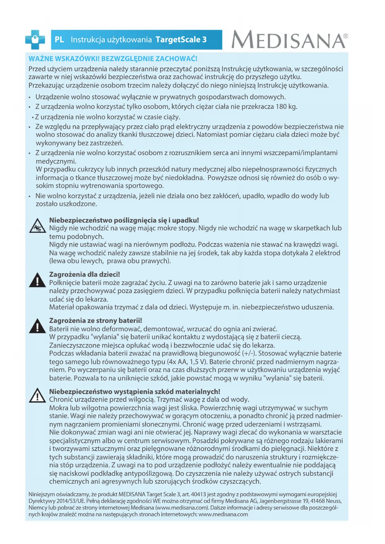 E-Mail: info@medisana.de Internet: www.medisana.com50 PL Instrukcja użytkowania TargetScale 3 WAŻNE WSKAZÓWKI! BEZWZGLĘDNIE ZACHOWAĆ! Przed użyciem urządzenia należy starannie przeczytać poniższą Instrukcję użytkowania, w szczególności zawarte w niej wskazówki bezpieczeństwa oraz zachować instrukcję do przyszłego użytku. Przekazując urządzenie osobom trzecim należy dołączyć do niego niniejszą Instrukcję użytkowania.