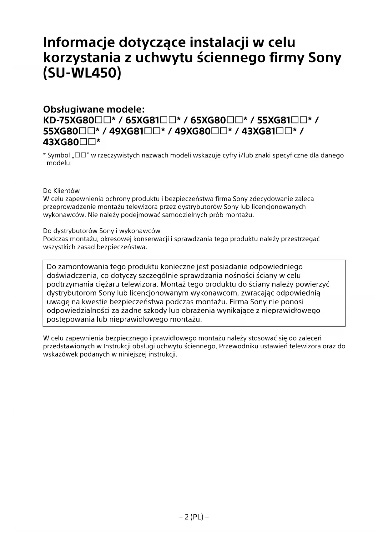 - Symbol „” w rzeczywistych nazwach modeli wskazuje cyfry i/lub znaki specyficzne dla danego modelu. Do Klientów W celu zapewnienia ochrony produktu i bezpieczeństwa firma Sony zdecydowanie zaleca przeprowadzenie montażu telewizora przez dystrybutorów Sony lub licencjonowanych wykonawców. Nie należy podejmować samodzielnych prób montażu. Do dystrybutorów Sony i wykonawców Podczas montażu, okresowej konserwacji i sprawdzania tego produktu należy przestrzegać wszystkich zasad bezpieczeństwa. Do zamontowania tego produktu konieczne jest posiadanie odpowiedniego doświadczenia, co dotyczy szczególnie sprawdzania nośności ściany w celu podtrzymania ciężaru telewizora. Montaż tego produktu do ściany należy powierzyć dystrybutorom Sony lub licencjonowanym wykonawcom, zwracając odpowiednią uwagę na kwestie bezpieczeństwa podczas montażu. Firma Sony nie ponosi odpowiedzialności za żadne szkody lub obrażenia wynikające z nieprawidłowego postępowania lub nieprawidłowego montażu. W celu zapewnienia bezpiecznego i prawidłowego montażu należy stosować się do zaleceń przedstawionych w Instrukcji obsługi uchwytu ściennego, Przewodniku ustawień telewizora oraz do wskazówek podanych w niniejszej instrukcji.− 3 (PL) −