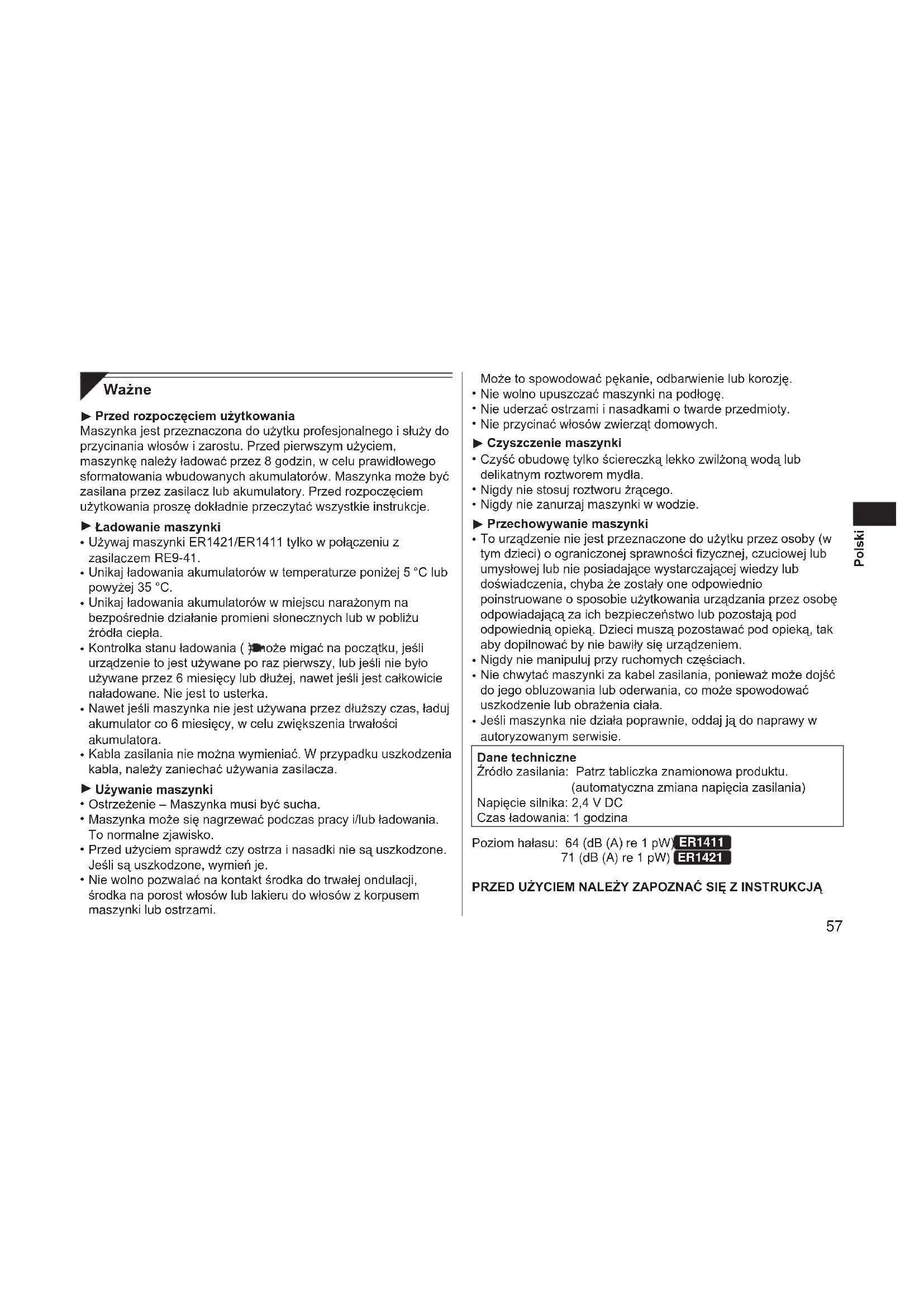 Może to spowodować pękanie, odbarwienie lub korozję. Nie wolno upuszczać maszynki na podłogę. Nie uderzać ostrzami i nasadkami o twarde przedmioty. Nie przycinać włosów zwierząt domowych. Czyszczenie maszynki Czyść obudowę tylko ściereczką lekko zwilżoną wodą lub delikatnym roztworem mydła. Nigdy nie stosuj roztworu żrącego. Nigdy nie zanurzaj maszynki w wodzie. Przechowywanie maszynki To urządzenie nie jest przeznaczone do użytku przez osoby (w tym dzieci) o ograniczonej sprawności zycznej, czuciowej lub umysłowej lub nie posiadające wystarczającej wiedzy lub doświadczenia, chyba że zostały one odpowiednio poinstruowane o sposobie użytkowania urządzania przez osobę odpowiadającą za ich bezpieczeństwo lub pozostają pod odpowiednią opieką. Dzieci muszą pozostawać pod opieką, tak aby dopilnować by nie bawiły się urządzeniem. Nigdy nie manipuluj przy ruchomych częściach. Nie chwytać maszynki za kabel zasilania, ponieważ może dojść do jego obluzowania lub oderwania, co może spowodować uszkodzenie lub obrażenia ciała. Jeśli maszynka nie działa poprawnie, oddaj ją do naprawy w autoryzowanym serwisie. Dane techniczne Źródło zasilania: Patrz tabliczka znamionowa produktu. (automatyczna zmiana napięcia zasilania) Napięcie silnika: 2,4 V DC Czas ładowania: 1 godzina Poziom hałasu: 64 (dB (A) re 1 pW) ER1411 71 (dB (A) re 1 pW) ER1421 PRZED UŻYCIEM NALEŻY ZAPOZNAĆ SIĘ Z INSTRUKCJĄ
