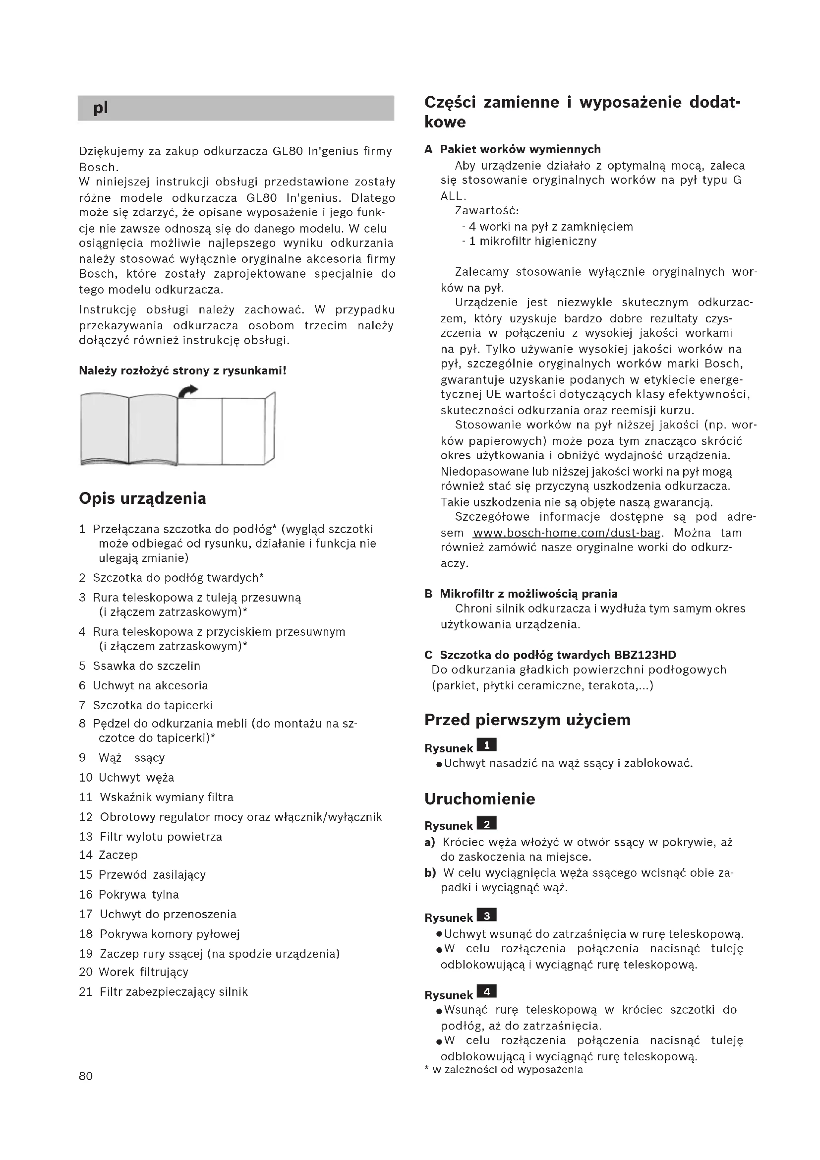 Aşındırıcı temizleme maddesi, cam temizleyici veya çok amaçlı temizleyiciler kullanılmamalıdır. Elektrikli süpürge kesinlikle suya sokulmamalıdır. Toz bölmesi gerekirse ikinci bir elektrik süpürgesi kullanılarak süpürülebilir veya sadece kuru bir toz bezi / toz fırçası ile temizlenebilir. Üretici firma, ürünün teknik özelliklerinde değişiklik yapma hakkına sahiptir.80 Dziękujemy za zakup odkurzacza GL80 In'genius firmy Bosch. W niniejszej instrukcji obsługi przedstawione zostały różne modele odkurzacza GL80 In'genius. Dlatego może się zdarzyć, że opisane wyposażenie i jego funk- cje nie zawsze odnoszą się do danego modelu. W celu osiągnięcia możliwie najlepszego wyniku odkurzania należy stosować wyłącznie oryginalne akcesoria firmy Bosch, które zostały zaprojektowane specjalnie do tego modelu odkurzacza. Instrukcję obsługi należy zachować. W przypadku przekazywania odkurzacza osobom trzecim należy dołączyć również instrukcję obsługi. Należy rozłożyć strony z rysunkami! Opis urządzenia 1 Przełączana szczotka do podłóg* (wygląd szczotki może odbiegać od rysunku, działanie i funkcja nie ulegają zmianie) 2 Szczotka do podłóg twardych* 3 Rura teleskopowa z tuleją przesuwną (i złączem zatrzaskowym)* 4 Rura teleskopowa z przyciskiem przesuwnym (i złączem zatrzaskowym)* 5 Ssawka do szczelin 6 Uchwyt na akcesoria 7 Szczotka do tapicerki 8 Pędzel do odkurzania mebli (do montażu na sz- czotce do tapicerki)* 9 Wąż ssący 10 Uchwyt węża 11 Wskaźnik wymiany filtra 12 Obrotowy regulator mocy oraz włącznik/wyłącznik 13 Filtr wylotu powietrza 14 Zaczep 15 Przewód zasilający 16 Pokrywa tylna 17 Uchwyt do przenoszenia 18 Pokrywa komory pyłowej 19 Zaczep rury ssącej (na spodzie urządzenia) 20 Worek filtrujący 21 Filtr zabezpieczający silnik
