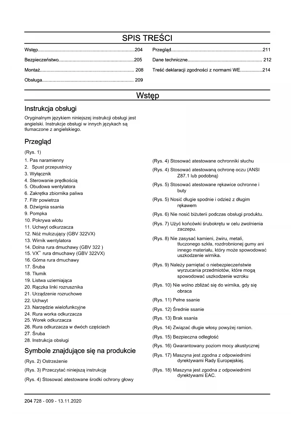 Symbole znajdujące się na produkcie (Rys. 2) Ostrzeżenie (Rys. 3) Przeczytać niniejszą instrukcję (Rys. 4) Stosować atestowane środki ochrony głowy (Rys. 4) Stosować atestowane ochronniki słuchu (Rys. 4) Stosować atestowaną ochronę oczu (ANSI Z87.1 lub podobną) (Rys. 5) Stosować atestowane rękawice ochronne i buty (Rys. 5) Nosić długie spodnie i odzież z długim rękawem (Rys. 6) Nie nosić biżuterii podczas obsługi produktu. (Rys. 7) Użyć końcówki śrubokrętu w celu zwolnienia zaczepu. (Rys. 8) Nie zasysać kamieni, żwiru, metali, tłuczonego szkła, rozdrobnionej gumy ani innego materiału, który może spowodować uszkodzenie wirnika. (Rys. 9) Należy pamiętać o niebezpieczeństwie wyrzucania przedmiotów, które mogą spowodować uszkodzenie wzroku (Rys. 10) Nie wolno zbliżać się do wirnika, gdy się obraca (Rys. 11) Pełne ssanie (Rys. 12) Średnie ssanie (Rys. 13) Brak ssania (Rys. 14) Związać długie włosy powyżej ramion. (Rys. 15) Bezpieczna odległość (Rys. 16) Gwarantowany poziom mocy akustycznej (Rys. 17) Maszyna jest zgodna z odpowiednimi dyrektywami Rady Europejskiej. (Rys. 18) Maszyna jest zgodna z odpowiednimi dyrektywami EAC. 204 728 - 009 - 13.11.2020(Rys. 19) Maszyna jest zgodna z odpowiednimi dyrektywami obowiązującymi na Ukrainie. (Rys. 20) Produkt jest zgodny z australijskimi przepisami dotyczącymi kompatybilności elektromagnetycznej (EMC). Uwaga: Pozostałe symbole/naklejki samoprzylepne umieszczone na produkcie dotyczą wymogów związanych z certyfikatami w innych obszarach komercyjnych. Emisje Euro V OSTRZEŻENIE: Ingerencja w silnik powoduje unieważnienie europejskiego zatwierdzenia typu produktu. Odpowiedzialność za produkt Zgodnie z przepisami dotyczącymi odpowiedzialności za produkt nie ponosimy odpowiedzialności za szkody spowodowane przez nasz produkt, jeśli: