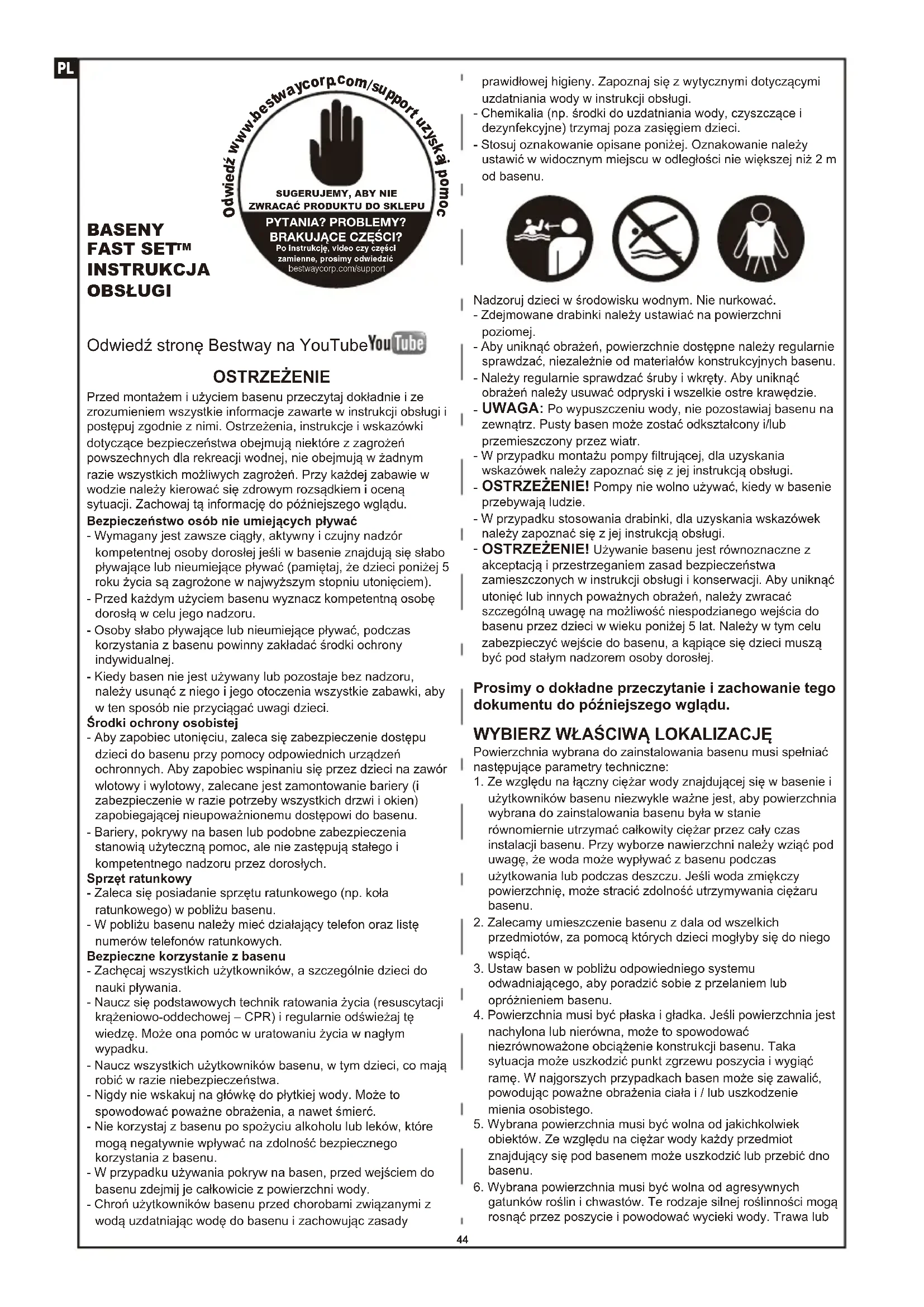 В случае протечки заклейте бассейн клейкой заплатой специально для ремонта поверхности, находящейся под водой (входит в комплект44 OSTRZEŻENIE Przed montażem i użyciem basenu przeczytaj dokładnie i ze zrozumieniem wszystkie informacje zawarte w instrukcji obsługi i postępuj zgodnie z nimi. Ostrzeżenia, instrukcje i wskazówki dotyczące bezpieczeństwa obejmują niektóre z zagrożeń powszechnych dla rekreacji wodnej, nie obejmują w żadnym razie wszystkich możliwych zagrożeń. Przy każdej zabawie w wodzie należy kierować się zdrowym rozsądkiem i oceną sytuacji. Zachowaj tą informację do późniejszego wglądu.Bezpieczeństwo osób nie umiejących pływać- Wymagany jest zawsze ciągły, aktywny i czujny nadzór kompetentnej osoby dorosłej jeśli w basenie znajdują się słabo pływające lub nieumiejące pływać (pamiętaj, że dzieci poniżej 5 roku życia są zagrożone w najwyższym stopniu utonięciem).- Przed każdym użyciem basenu wyznacz kompetentną osobę dorosłą w celu jego nadzoru.- Osoby słabo pływające lub nieumiejące pływać, podczas korzystania z basenu powinny zakładać środki ochrony indywidualnej.- Kiedy basen nie jest używany lub pozostaje bez nadzoru, należy usunąć z niego i jego otoczenia wszystkie zabawki, aby w ten sposób nie przyciągać uwagi dzieci.Środki ochrony osobistej- Aby zapobiec utonięciu, zaleca się zabezpieczenie dostępu dzieci do basenu przy pomocy odpowiednich urządzeń ochronnych. Aby zapobiec wspinaniu się przez dzieci na zawór wlotowy i wylotowy, zalecane jest zamontowanie bariery (i zabezpieczenie w razie potrzeby wszystkich drzwi i okien) zapobiegającej nieupoważnionemu dostępowi do basenu.- Bariery, pokrywy na basen lub podobne zabezpieczenia stanowią użyteczną pomoc, ale nie zastępują stałego i kompetentnego nadzoru przez dorosłych.Sprzęt ratunkowy- Zaleca się posiadanie sprzętu ratunkowego (np. koła ratunkowego) w pobliżu basenu.- W pobliżu basenu należy mieć działający telefon oraz listę numerów telefonów ratunkowych.Bezpieczne korzystanie z basenu- Zachęcaj wszystkich użytkowników, a szczególnie dzieci do nauki pływania.- Naucz się podstawowych technik ratowania życia (resuscytacji krążeniowo-oddechowej – CPR) i regularnie odświeżaj tę wiedzę. Może ona pomóc w uratowaniu życia w nagłym wypadku.- Naucz wszystkich użytkowników basenu, w tym dzieci, co mają robić w razie niebezpieczeństwa.- Nigdy nie wskakuj na główkę do płytkiej wody. Może to spowodować poważne obrażenia, a nawet śmierć.- Nie korzystaj z basenu po spożyciu alkoholu lub leków, które mogą negatywnie wpływać na zdolność bezpiecznego korzystania z basenu.- W przypadku używania pokryw na basen, przed wejściem do basenu zdejmij je całkowicie z powierzchni wody.- Chroń użytkowników basenu przed chorobami związanymi z wodą uzdatniając wodę do basenu i zachowując zasady prawidłowej higieny. Zapoznaj się z wytycznymi dotyczącymi uzdatniania wody w instrukcji obsługi.- Chemikalia (np. środki do uzdatniania wody, czyszczące i dezynfekcyjne) trzymaj poza zasięgiem dzieci.- Stosuj oznakowanie opisane poniżej. Oznakowanie należy ustawić w widocznym miejscu w odległości nie większej niż 2 m od basenu.Nadzoruj dzieci w środowisku wodnym. Nie nurkować.- Zdejmowane drabinki należy ustawiać na powierzchni poziomej.- Aby uniknąć obrażeń, powierzchnie dostępne należy regularnie sprawdzać, niezależnie od materiałów konstrukcyjnych basenu.- Należy regularnie sprawdzać śruby i wkręty. Aby uniknąć obrażeń należy usuwać odpryski i wszelkie ostre krawędzie. UWAGA: Po wypuszczeniu wody, nie pozostawiaj basenu na zewnątrz. Pusty basen może zostać odkształcony i/lub przemieszczony przez wiatr.- W przypadku montażu pompy filtrującej, dla uzyskania wskazówek należy zapoznać się z jej instrukcją obsługi. OSTRZEŻENIE! Pompy nie wolno używać, kiedy w basenie przebywają ludzie.- W przypadku stosowania drabinki, dla uzyskania wskazówek należy zapoznać się z jej instrukcją obsługi. OSTRZEŻENIE! Używanie basenu jest równoznaczne z akceptacją i przestrzeganiem zasad bezpieczeństwa zamieszczonych w instrukcji obsługi i konserwacji. Aby uniknąć utonięć lub innych poważnych obrażeń, należy zwracać szczególną uwagę na możliwość niespodzianego wejścia do basenu przez dzieci w wieku poniżej 5 lat. Należy w tym celu zabezpieczyć wejście do basenu, a kąpiące się dzieci muszą być pod stałym nadzorem osoby dorosłej.Prosimy o dokładne przeczytanie i zachowanie tego dokumentu do późniejszego wglądu.