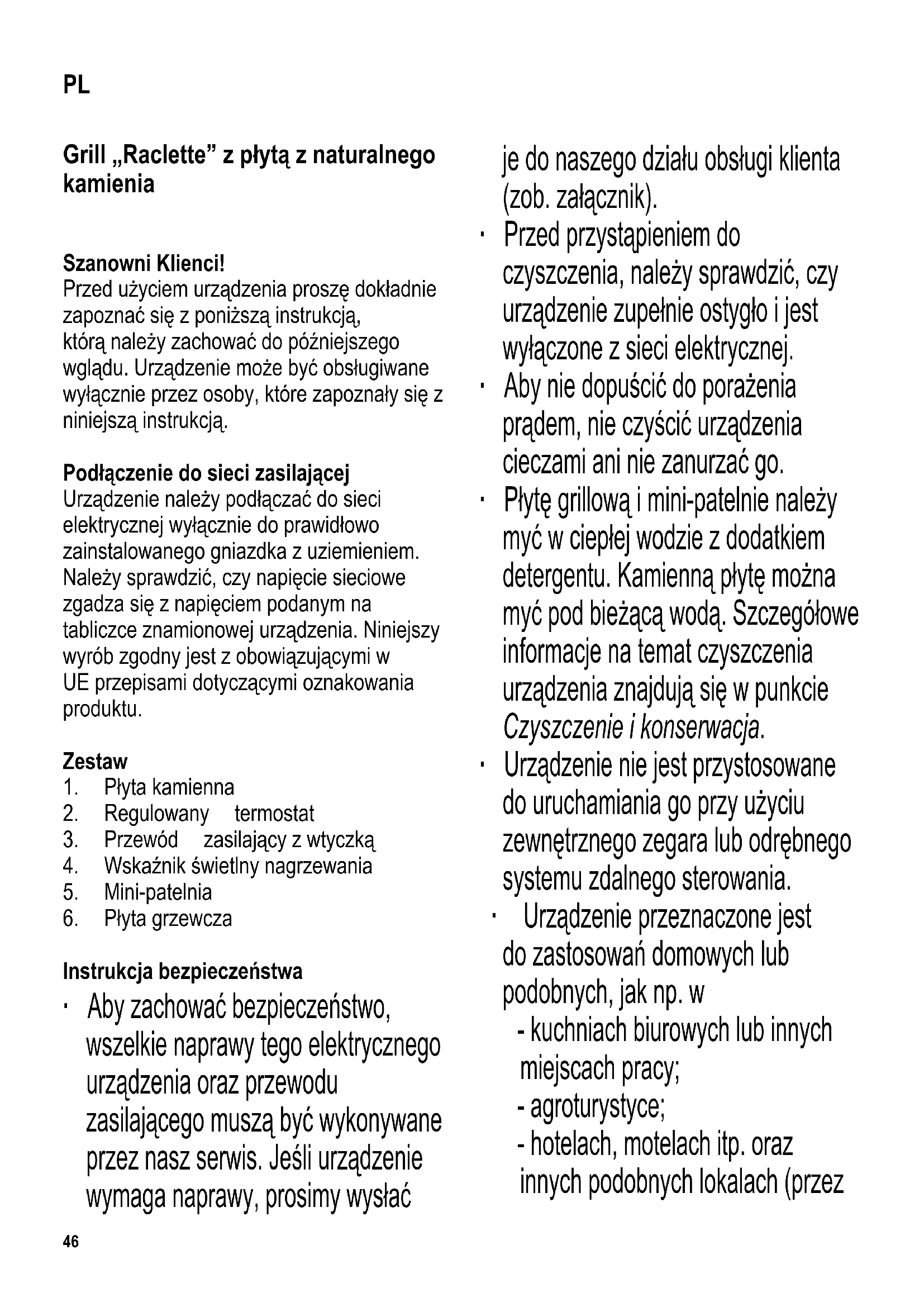 yć od 200 do 300 gramów sera na osobę. Pokroić ser na plasterki o grubości od 3 do 5 mm i ułożyć je na mini-patelniach. Najlepiej użyć oryginalnego sera „Raclette”, aczkolwiek można użyć każdego innego sera, który szybko się rozpuszcza. Kilka praktycznych rad ∙ Przed przystąpieniem do smażenia lub grillowania zamrożonej wcześniej żywności, należy ją całkowicie rozmrozić. ∙ Aby nie uszkodzić warstwy ochronnej mini-patelni oraz płyty grzewczej, używać wyłącznie takich przyborów, które rysują powierzchni naczyń. Czyszczenie i konserwacja ∙ Przed przystąpieniem do czyszczenia urządzenia, należy sprawdzić czy wtyczka jest wyjęta z gniazdka, a urządzenie już cał kowicie ostygło. ∙ Nie zanurzać sprzętu w wodzie, ani nie myć go wodą, ponieważ grozi to porażeniem prądem. ∙ Do czyszczenia nie należy stosować żrących roztworów, ani środków ścierających. ∙ Wytrzeć powierzchnię zewnętrzną grilla czystą, wilgotną ściereczką. ∙ Przed zdjęciem kamiennej płyty grzewczej z urządzenia w celu jej wyczyszczenia, upewnić się, czy całkowicie ostygła. Kamienną płytę grzewczą można myć pod bieżącą wodą bez użycia detergentów. Następnie płytę należy dokładnie wysuszyć miękką ściereczką. Nie zanurzać płyty w wodzie. ∙ Zdjąć płytę grzewczą i umyć w ciepłej wodzie z detergentem, po czym dokładnie wytrzeć do sucha ściereczką.50 ∙ Mini-patelnie należy myć w ciepłej wodzie z dodatkiem płynu do mycia naczyń. Następnie należy je dokładnie wysuszyć. ∙ Nie nadają się natomiast do mycia w zmywarce. Utylizacja Urządzenia oznaczone powyższym symbolem należy usuwać osobno, a nie wraz ze zwykłymi odpadkami z gospodarstwa domowego. Urządzenia takie zawierają bowiem cenne materiały, jakie można poddać recyklingowi. Odpowiednia utylizacja takich urządzeń przyczynia się do ochrony środowiska i zdrowia ludzkiego. Szczegółowych informacji na ten temat udzielają lokalne władze lub sklepy prowadzące sprzedaż detaliczną. Gwarancja Gwarancja na produkt obejmuje wady materiału i wykonania przez okres dwóch lat od daty zakupu produktu. W ramach gwarancji producent zobowiązuje się do naprawy lub wymiany wszelkich wadliwych elementów, pod warunkiem, że produkt zostanie odniesiony prze klienta do punktu zakupu, a później odesłany przez sklep do serwisu centralnego w Opolu, prowadzonego przez fi rmę Serv- Serwis Sp.z o.o. Aby gwarancja zachowała ważność, urządzenie musi być używane zgodnie z instrukcją i nie może być modyfi kowane, naprawiane lub w jakikolwiek sposób naruszane przez nieupoważnioną do tego osobę, ani też uszkodzone w wyniku nieprawidłowego użycia. Gwarancja nie obejmuje naturalnego zużycia, ani elementów łatwo tłukących się, jak szkło, elementy z tworzyw sztucznych, żarówki itd. Niniejsza gwarancja nie ogranicza ustawowych praw konsumenta ani innych praw, jakie konsument posiada zgodnie z obowiązującymi przepisami, które dotyczą zakupu przedmiotów użytkowych. Jeżeli urządzenie przestanie działać prawidłowo i musi zostać odesłane, należy je dokładnie zapakować i dołączyć imię, nazwisko i adres nadawcy oraz przyczynę odesłania. Jeśli urządzenie jest nadal na gwarancji, proszę także dołączyć paragon zakupu, lub fakturę zakupową.51 Ψησταριά ρακλέτ με φυσική πέτρινη