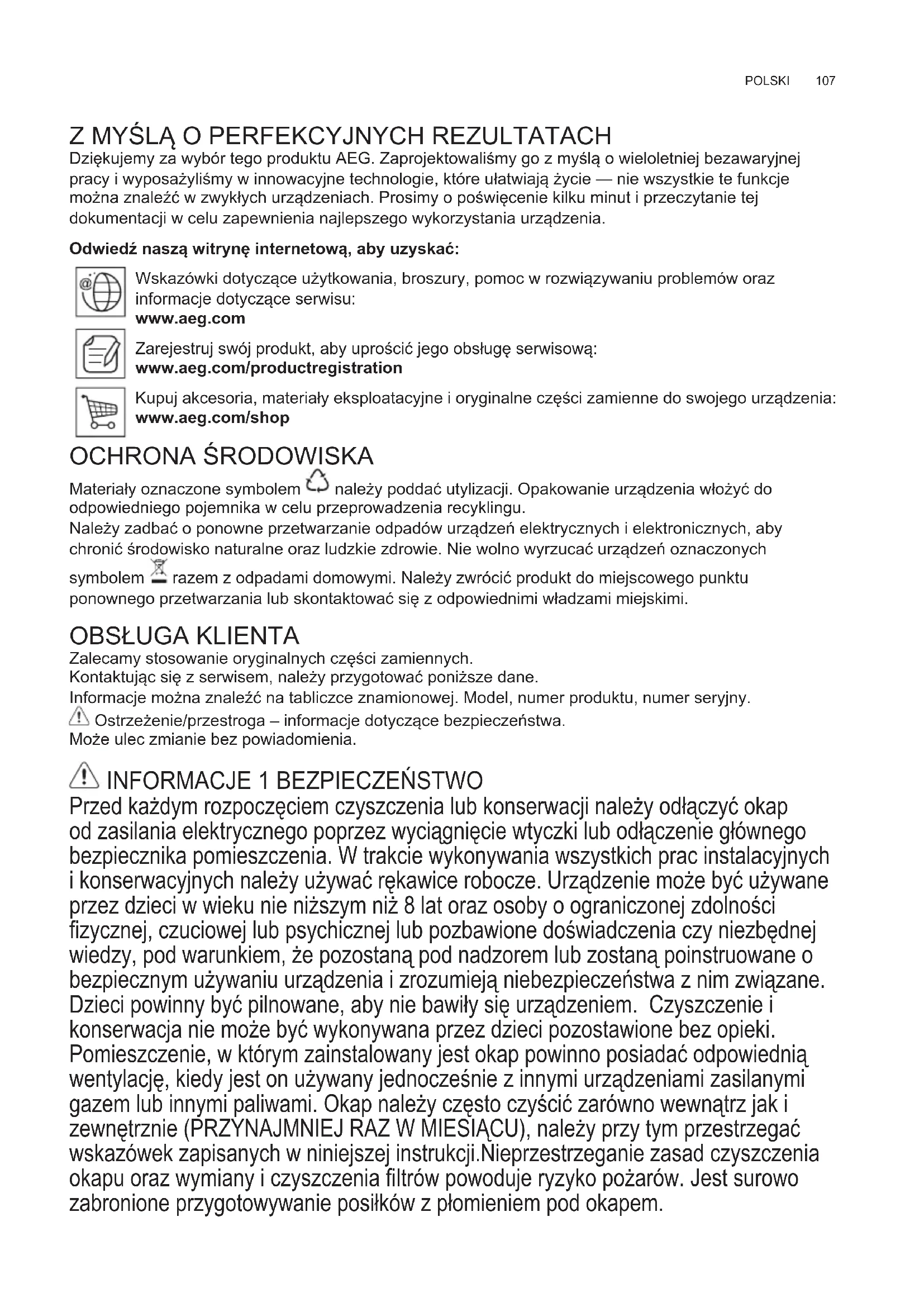 Przed każdym rozpoczęciem czyszczenia lub konserwacji należy odłączyć okap od zasilania elektrycznego poprzez wyciągnięcie wtyczki lub odłączenie głównego bezpiecznika pomieszczenia. W trakcie wykonywania wszystkich prac instalacyjnych i konserwacyjnych należy używać rękawice robocze. Urządzenie może być używane przez dzieci w wieku nie niższym niż 8 lat oraz osoby o ograniczonej zdolności fi zycznej, czuciowej lub psychicznej lub pozbawione doświadczenia czy niezbędnej wiedzy, pod warunkiem, że pozostaną pod nadzorem lub zostaną poinstruowane o bezpiecznym używaniu urządzenia i zrozumieją niebezpieczeństwa z nim związane. Dzieci powinny być pilnowane, aby nie bawiły się urządzeniem. Czyszczenie i konserwacja nie może być wykonywana przez dzieci pozostawione bez opieki. Pomieszczenie, w którym zainstalowany jest okap powinno posiadać odpowiednią wentylację, kiedy jest on używany jednocześnie z innymi urządzeniami zasilanymi gazem lub innymi paliwami. Okap należy często czyścić zarówno wewnątrz jak i zewnętrznie (PRZYNAJMNIEJ RAZ W MIESIĄCU), należy przy tym przestrzegać wskazówek zapisanych w niniejszej instrukcji.Nieprzestrzeganie zasad czyszczenia okapu oraz wymiany i czyszczenia fi ltrów powoduje ryzyko pożarów. Jest surowo zabronione przygotowywanie posiłków z płomieniem pod okapem. PL INSTRUKCJA UŻYTKOWANIAwww.aeg.com108 Używanie wolnego płomienia jest szkodliwe dla fi ltrów i może spowodować pożary, dlatego należy tego unikać w każdym przypadku. Smażenie musi być wykonywane pod kontrolą, aby uniknąć zapalenia się rozgrzanego oleju. Uwaga! Kiedy powierzchnia do gotowania jest włączona dostępne części okapu mogą sią rozgrzać. Aby wymienić lampkę należy użyć wyłącznie ten rodzaj lampki, który został wskazany w rozdziale konserwacja/wymiana lampki w niniejszej instrukcji. Uwaga! Nie podłączać urządzenia do sieci elektrycznej dopóki instalacja nie zostanie całkowicie zakończona. W celu podłączenia okapu do sieci elektrycznej można stosować wyłącznie certyfikowane elektryczne adaptery gniazdkowe. Nie wolno używać elektrycznych listew wielogniazdowych.