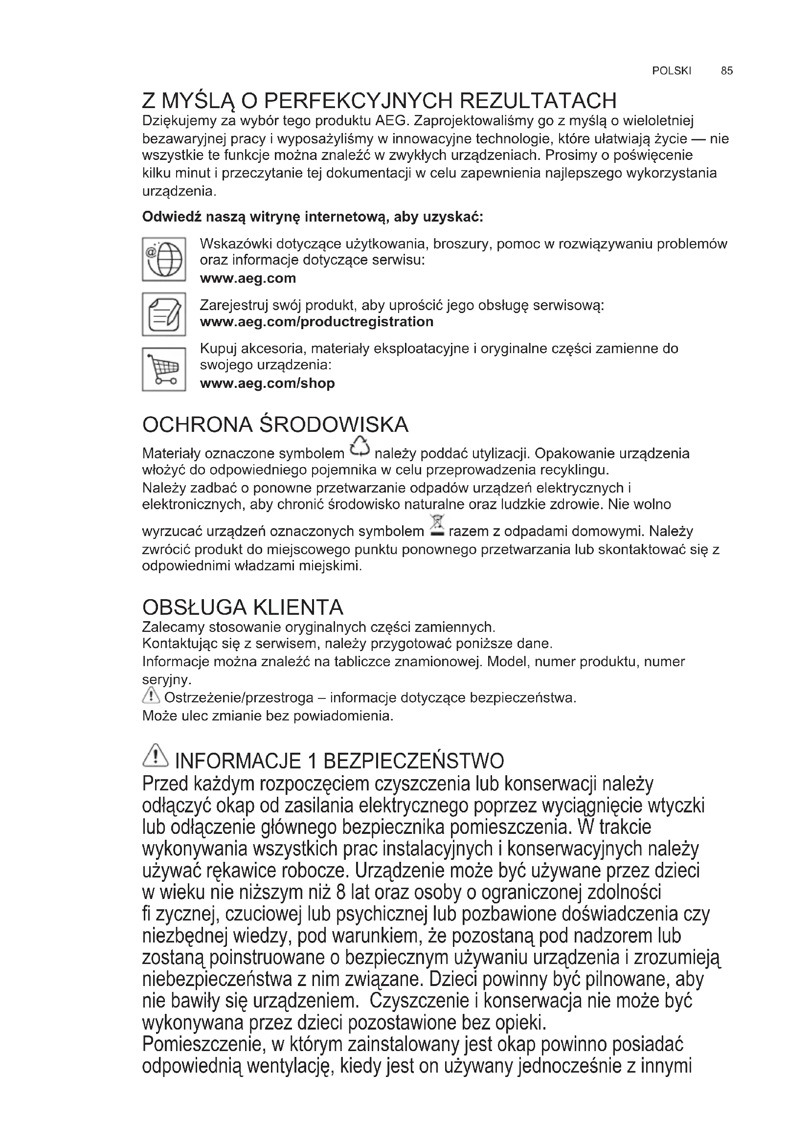 Dziękujemy za wybór tego produktu AEG. Zaprojektowaliśmy go z myślą o wieloletniej bezawaryjnej pracy i wyposażyliśmy w innowacyjne technologie, które ułatwiają życie — nie wszystkie te funkcje można znaleźć w zwykłych urządzeniach. Prosimy o poświęcenie kilku minut i przeczytanie tej dokumentacji w celu zapewnienia najlepszego wykorzystania urządzenia. Odwiedź naszą witrynę internetową, aby uzyskać: Wskazówki dotyczące użytkowania, broszury, pomoc w rozwiązywaniu problemów oraz informacje dotyczące serwisu: www.aeg.com Zarejestruj swój produkt, aby uprościć jego obsługę serwisową: www.aeg.com/productregistration Kupuj akcesoria, materiały eksploatacyjne i oryginalne części zamienne do swojego urządzenia: www.aeg.com/shop OCHRONA ŚRODOWISKA Materiały oznaczone symbolem należy poddać utylizacji. Opakowanie urządzenia włożyć do odpowiedniego pojemnika w celu przeprowadzenia recyklingu. Należy zadbać o ponowne przetwarzanie odpadów urządzeń elektrycznych i elektronicznych, aby chronić środowisko naturalne oraz ludzkie zdrowie. Nie wolno wyrzucać urządzeń oznaczonych symbolem razem z odpadami domowymi. Należy zwrócić produkt do miejscowego punktu ponownego przetwarzania lub skontaktować się z odpowiednimi władzami miejskimi.