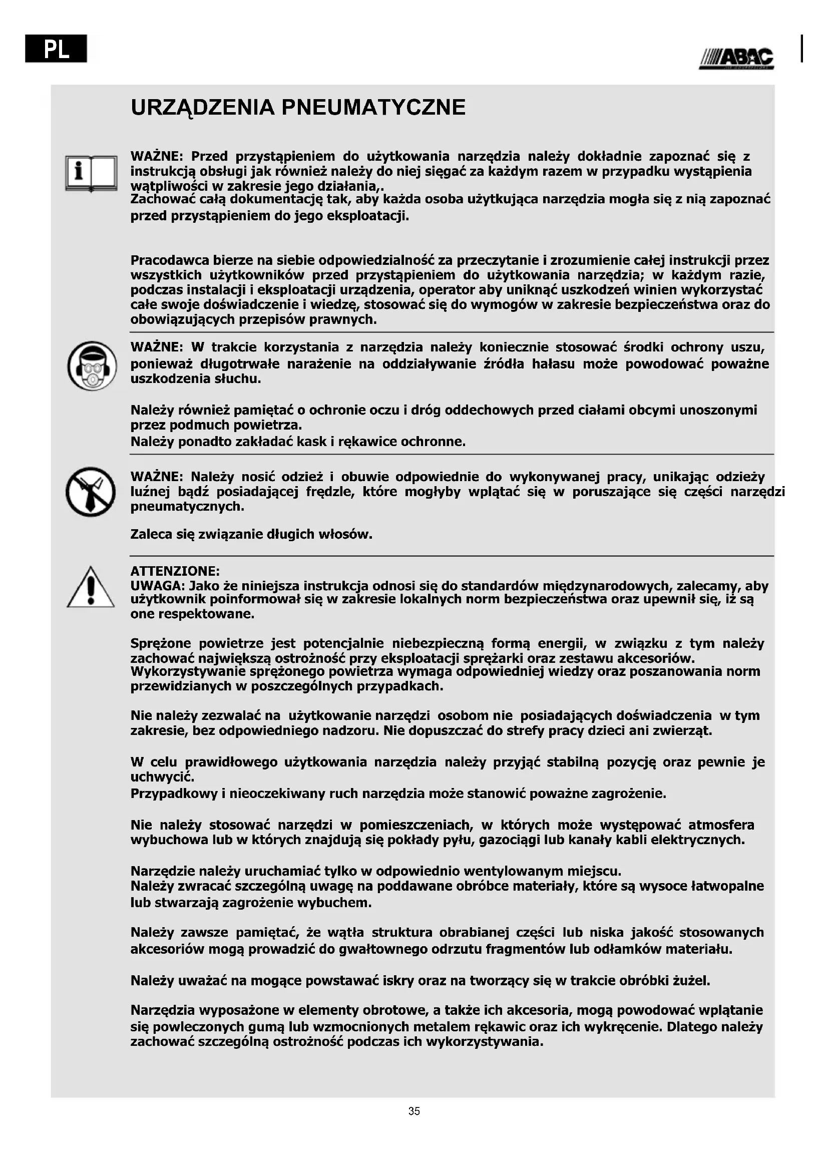 WAŻNE: Przed przystąpieniem do użytkowania narzędzia należy dokładnie zapoznać się z instrukcją obsługi jak również należy do niej sięgać za każdym razem w przypadku wystąpienia wątpliwości w zakresie jego działania,. Zachować całą dokumentację tak, aby każda osoba użytkująca narzędzia mogła się z nią zapoznać przed przystąpieniem do jego eksploatacji. Pracodawca bierze na siebie odpowiedzialność za przeczytanie i zrozumienie całej instrukcji przez wszystkich użytkowników przed przystąpieniem do użytkowania narzędzia; w każdym razie, podczas instalacji i eksploatacji urządzenia, operator aby uniknąć uszkodzeń winien wykorzystać całe swoje doświadczenie i wiedzę, stosować się do wymogów w zakresie bezpieczeństwa oraz do obowiązujących przepisów prawnych. WAŻNE: W trakcie korzystania z narzędzia należy koniecznie stosować środki ochrony uszu, ponieważ długotrwałe narażenie na oddziaływanie źródła hałasu może powodować poważne uszkodzenia słuchu. Należy również pamiętać o ochronie oczu i dróg oddechowych przed ciałami obcymi unoszonymi przez podmuch powietrza. Należy ponadto zakładać kask i rękawice ochronne. WAŻNE: Należy nosić odzież i obuwie odpowiednie do wykonywanej pracy, unikając odzieży luźnej bądź posiadającej frędzle, które mogłyby wplątać się w poruszające się części narzędzi pneumatycznych. Zaleca się związanie długich włosów. ATTENZIONE: UWAGA: Jako że niniejsza instrukcja odnosi się do standardów międzynarodowych, zalecamy, aby użytkownik poinformował się w zakresie lokalnych norm bezpieczeństwa oraz upewnił się, iż są one respektowane. Sprężone powietrze jest potencjalnie niebezpieczną formą energii, w związku z tym należy zachować największą ostrożność przy eksploatacji sprężarki oraz zestawu akcesoriów. Wykorzystywanie sprężonego powietrza wymaga odpowiedniej wiedzy oraz poszanowania norm przewidzianych w poszczególnych przypadkach. Nie należy zezwalać na użytkowanie narzędzi osobom nie posiadających doświadczenia w tym zakresie, bez odpowiedniego nadzoru. Nie dopuszczać do strefy pracy dzieci ani zwierząt. W celu prawidłowego użytkowania narzędzia należy przyjąć stabilną pozycję oraz pewnie je uchwycić. Przypadkowy i nieoczekiwany ruch narzędzia może stanowić poważne zagrożenie. Nie należy stosować narzędzi w pomieszczeniach, w których może występować atmosfera wybuchowa lub w których znajdują się pokłady pyłu, gazociągi lub kanały kabli elektrycznych. Narzędzie należy uruchamiać tylko w odpowiednio wentylowanym miejscu. Należy zwracać szczególną uwagę na poddawane obróbce materiały, które są wysoce łatwopalne lub stwarzają zagrożenie wybuchem. Należy zawsze pamiętać, że wątła struktura obrabianej części lub niska jakość stosowanych akcesoriów mogą prowadzić do gwałtownego odrzutu fragmentów lub odłamków materiału. Należy uważać na mogące powstawać iskry oraz na tworzący się w trakcie obróbki żużel. Narzędzia wyposażone w elementy obrotowe, a także ich akcesoria, mogą powodować wplątanie się powleczonych gumą lub wzmocnionych metalem rękawic oraz ich wykręcenie. Dlatego należy zachować szczególną ostrożność podczas ich wykorzystywania.36