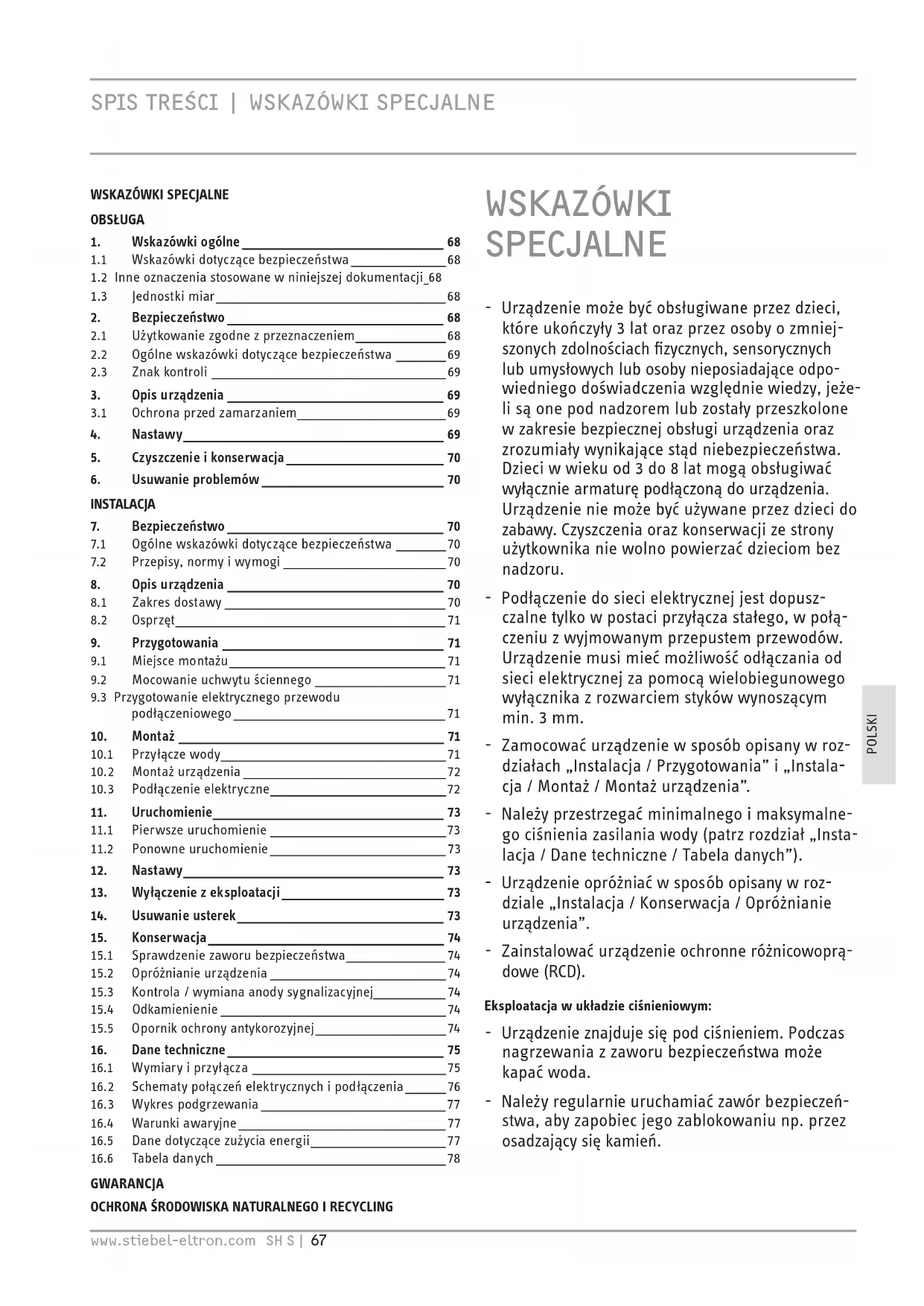 WSKAZÓWKI SPECJALNE - Urządzenie może być obsługiwane przez dzieci, które ukończyły 3 lat oraz przez osoby o zmniej- szonych zdolnościach fizycznych, sensorycznych lub umysłowych lub osoby nieposiadające odpo- wiedniego doświadczenia względnie wiedzy, jeże- li są one pod nadzorem lub zostały przeszkolone w zakresie bezpiecznej obsługi urządzenia oraz zrozumiały wynikające stąd niebezpieczeństwa. Dzieci w wieku od 3 do 8 lat mogą obsługiwać wyłącznie armaturę podłączoną do urządzenia. Urządzenie nie może być używane przez dzieci do zabawy. Czyszczenia oraz konserwacji ze strony użytkownika nie wolno powierzać dzieciom bez nadzoru. - Podłączenie do sieci elektrycznej jest dopusz- czalne tylko w postaci przyłącza stałego, w połą- czeniu z wyjmowanym przepustem przewodów. Urządzenie musi mieć możliwość odłączania od sieci elektrycznej za pomocą wielobiegunowego wyłącznika z rozwarciem styków wynoszącym min. 3mm. - Zamocować urządzenie w sposób opisany w roz- działach „Instalacja/ Przygotowania” i „Instala- cja/ Montaż / Montaż urządzenia”. - Należy przestrzegać minimalnego i maksymalne- go ciśnienia zasilania wody (patrz rozdział „Insta- lacja / Dane techniczne / Tabela danych”). - Urządzenie opróżniać w sposób opisany w roz- dziale „Instalacja/ Konserwacja/ Opróżnianie urządzenia”. - Zainstalować urządzenie ochronne różnicowoprą- dowe (RCD). Eksploatacja w układzie ciśnieniowym: - Urządzenie znajduje się pod ciśnieniem. Podczas nagrzewania zzaworu bezpieczeństwa może kapać woda. - Należy regularnie uruchamiać zawór bezpieczeń- stwa, aby zapobiec jego zablokowaniu np. przez osadzający się kamień.68 | SH S www.stiebel-eltron.com