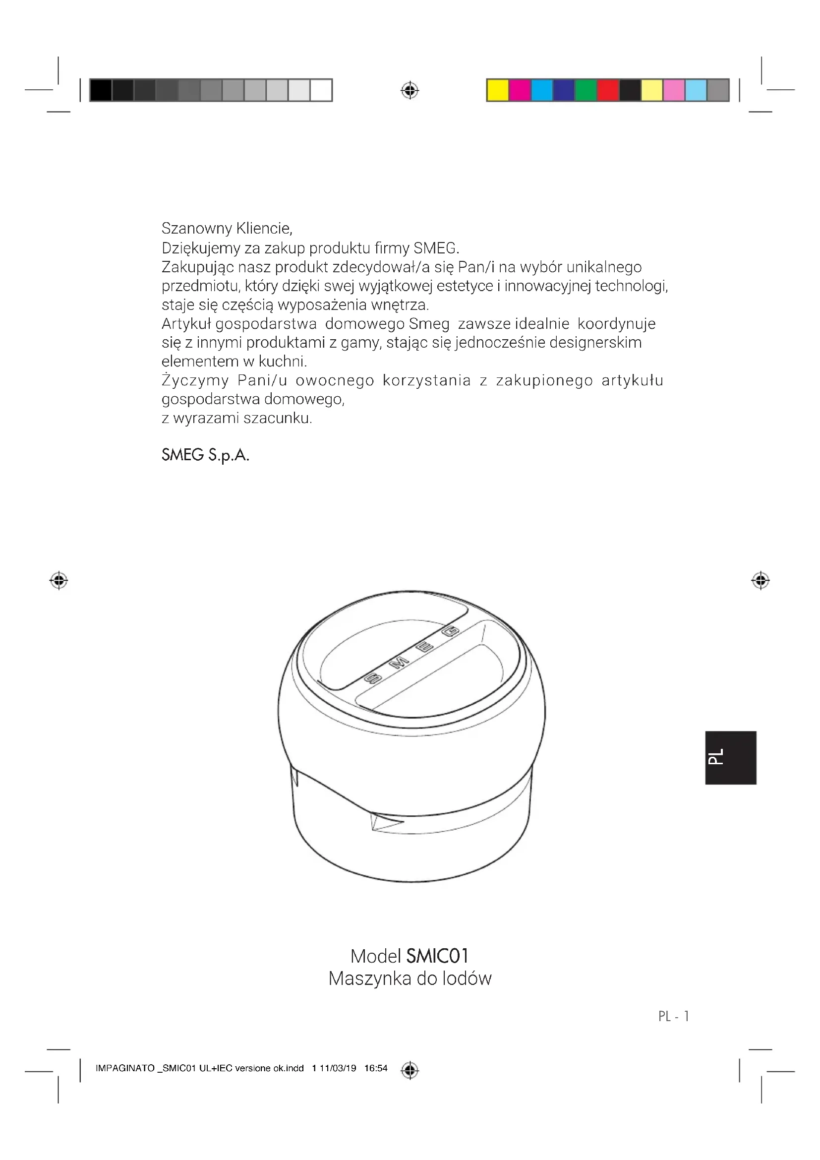 - Sæt skålen i køleskabet, indtil blandingen når køleskabstemperaturen. IMPAGINATO _SMIC01 UL+IEC versione ok.indd 7 11/03/19 16:548 - DA IMPAGINATO _SMIC01 UL+IEC versione ok.indd 8 11/03/19 16:54PL PL - 1 Szanowny Kliencie, Dziękujemy za zakup produktu rmy SMEG. Zakupując nasz produkt zdecydował/a się Pan/i na wybór unikalnego przedmiotu, który dzięki swej wyjątkowej estetyce i innowacyjnej technologi, staje się częścią wyposażenia wnętrza. Artykuł gospodarstwa domowego Smeg zawsze idealnie koordynuje się z innymi produktami z gamy, stając się jednocześnie designerskim elementem w kuchni. Życzymy Pani/u owocnego korzystania z zakupionego artykułu gospodarstwa domowego, z wyrazami szacunku. SMEG S.p.A. Model SMIC01 Maszynka do lodów IMPAGINATO _SMIC01 UL+IEC versione ok.indd 1 11/03/19 16:542 - PL Ostrzeżenia BEZPIECZEŃSTWO Podstawowe ostrzeżenia dotyczące bezpieczeństwa Używać maszynki do lodów tylko w połączeniu z modelami miksera linii SMF producenta. Pełne informacje dotyczące używania miksera znajdują się w instrukcji obsługi, dostarczonej wraz z artykułem gospodarstwa domowego.