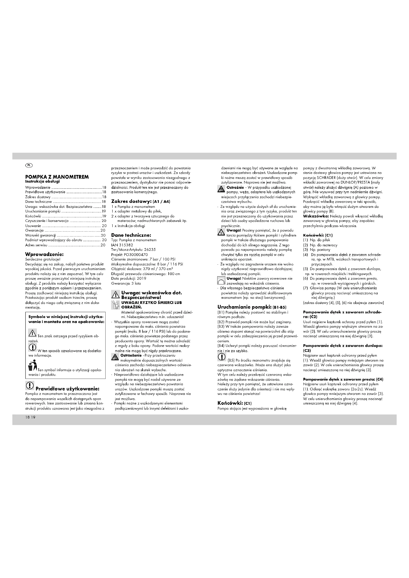 Prawidłowe użytkowanie: Pompka z manometrem ta przeznaczona jest do napompowania wszelkich dostępnych opon rowerowych. Inne zastosowanie lub zmiana kon-strukcji produktu uznawana jest jako niezgodna z przeznaczeniem i może prowadzić do powstania ryzyka w postaci urazów i uszkodzeń. Za szkody powstałe w wyniku zastosowania niezgodnego z przeznaczeniem, dystrybutor nie ponosi odpowie-dzialności. Produkt ten nie jest przeznaczony do zastosowania komercyjnego. Zakres dostawy: (A1 / A4) 1 x Pompka z manometrem1 x adapter metalowy do piłek,2 x adapter z tworzywa sztucznego do materaców, nadmuchiwanych zabawek itp.1 x Instrukcja obsługi Dane techniczne: Typ: Pompka z manometremIAN 315382 Tnr-/Monz-Artykułu: 26235Projekt: PO30000470Ciśnienie znamionowe: 7 bar / 100 PSIMaksymalne dopuszczalne: 8 bar / 116 PSIObjętość skokowa: 370 ml / 370 cm³Długość przewodu ciśnieniowego: 100 cmData produkcji: 2019 Gwarancja: 3 lata