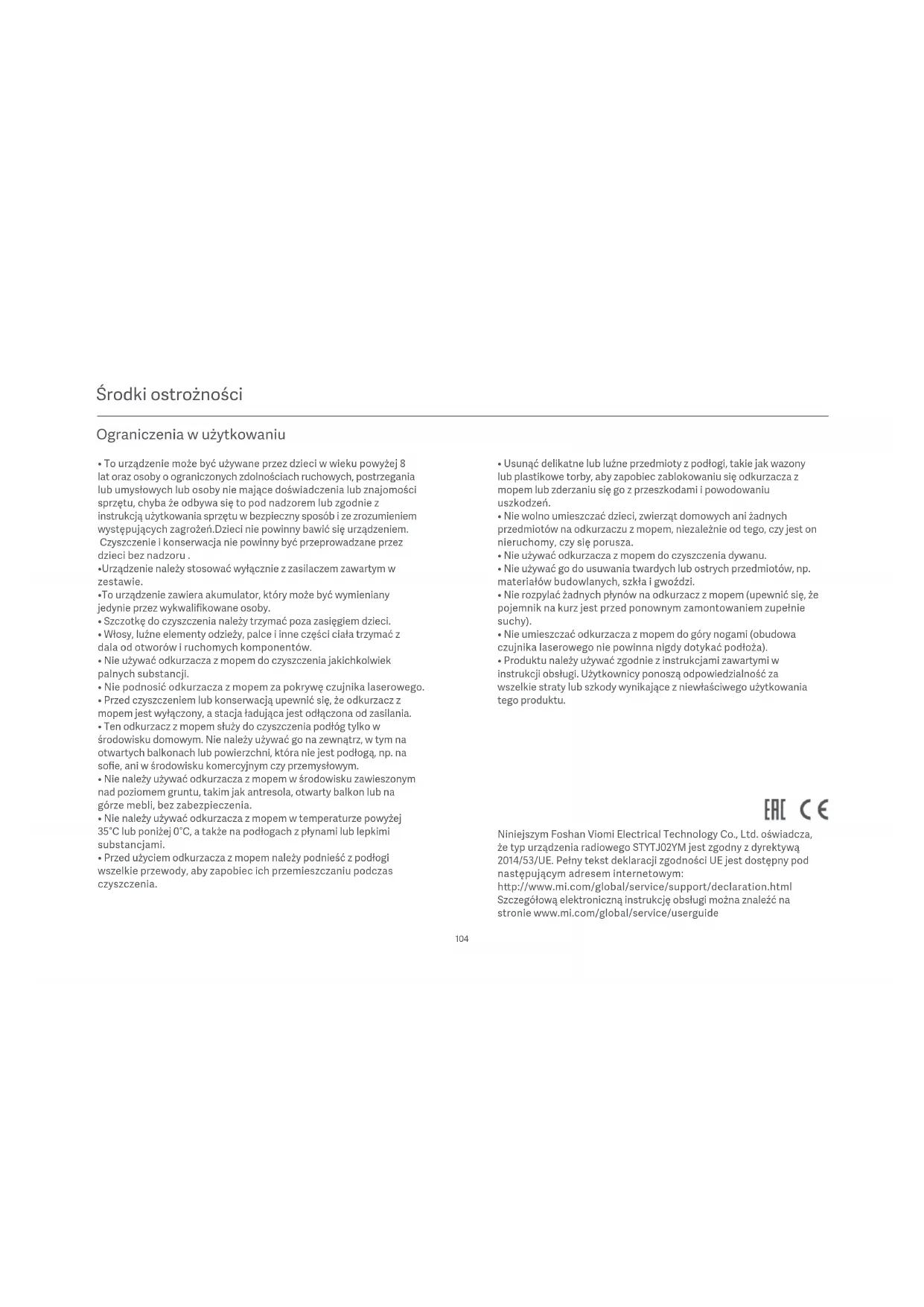 - Produktu należy używać zgodnie z instrukcjami zawartymi w instrukcji obsługi. Użytkownicy ponoszą odpowiedzialność za wszelkie straty lub szkody wynikające z niewłaściwego użytkowania tego produktu. Niniejszym Foshan Viomi Electrical Technology Co., Ltd. oświadcza, że typ urządzenia radiowego STYTJ02YM jest zgodny z dyrektywą 2014/53/UE. Pełny tekst deklaracji zgodności UE jest dostępny pod następującym adresem internetowym: hp://www.mi.com/global/service/support/declaration.html Szczegółową elektroniczną instrukcję obsługi można znaleźć na stronie www.mi.com/global/service/userguide105