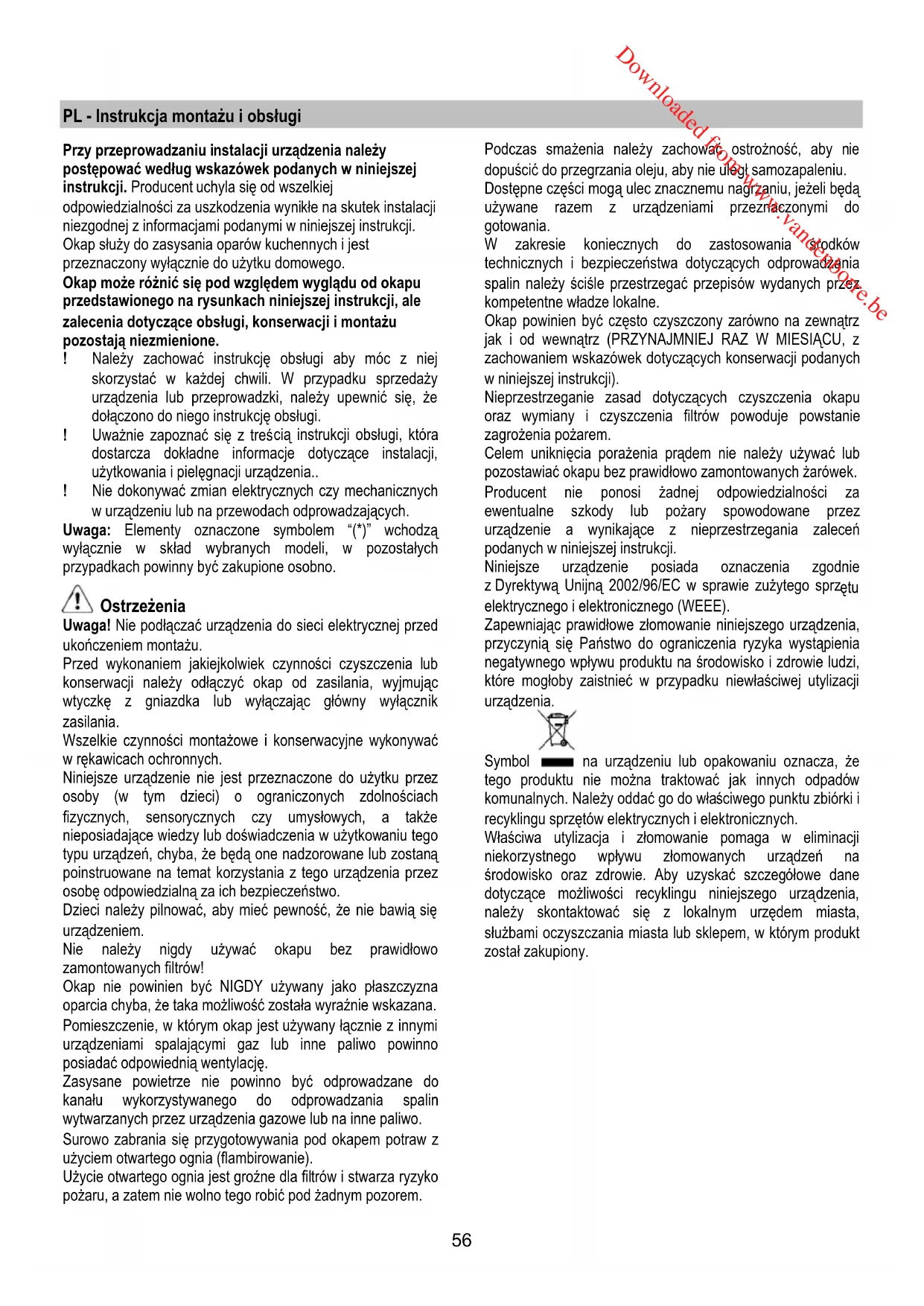 Tryk på tasten i 3 sekunder; emhættens betjeningselektronik afbrydes. Denne funktion kan være nyttig under rengøring af emhætten. Tryk på tasten for at tilslutte elektronikken igen. Hvis der opstår fejlfunktion, bør man - inden henvendelse til servicetjenesten - afbryde emhætten fra elforsyningen i mindst 5 sekunder ved at trække stikket ud, og derefter tilslutte emhætten igen. Hvis fejlfunktionen fortsætter, bedes man kontakte servicetjenesten. Vedligeholdelse Obs! Inden der udføres nogen form for rengøring eller vedligeholdelse skal emhætten afbrydes fra elnettet ved at fjerne stikket fra stikkontakten, eller ved at afbryde hjemmets hovedafbryder. Rengøring Emhætten skal rengøres jævnligt både på ydersiden og på indersiden (mindst med samme frekvens som for vedligeholdelse af fedtfiltrene). Ved rengøring skal man anvende en klud fugtet med neutrale, milde rengøringsmidler i flydende form. Undgå brug af produkter indeholdende slibemidler BENYT ALDRIG SPRIT! Pas på: Manglende overholdelse af vejledningen til rengøring af apparatet og udskiftning af filtrene medfører brandfare. Der henstilles således til, at instruktionerne følges. Fabrikanten frasiger sig ethvert ansvar for eventuel beskadigelse af motoren, brande forårsaget af utilstrækkelig vedligeholdelse af apparatet eller manglende overholdelse af ovenstående instruktioner. Fedtfilter - Fig. 19-25 Tilbageholder de fedtpartikler, der dannes under tilberedning af mad. Fedtfilteret skal rengøres med milde vaskemidler en gang om måneden (eller når signaleringssystemet for filtermætning angiver behovet – hvis denne funktion findes på den købte model); filteret kan også vaskes i opvaskemaskine ved lave temperaturer og med en kort opvaskecyklus. Ved vask i opvaskemaskinen kan metal-fedtfilteret blive misfarvet, men dette vil ikke have negativ indflydelse på dets filtrerende egenskaber. Træk i fjederhåndtaget for at afmontere fedtfilteret. Kulfilter (kun den filtrerende udgave) - Fig. 23 Filteret opfanger lugt fra madlavning. Kulfilteret kan vaskes hver anden måned (eller når systemet til angivelse af filtermætning – hvis det er monteret på den købte model – viser, at der er behov) i varmt vand og egnet vaskemiddel, eller i opvaskemaskine ved 65°C (vask i opvaskemaskinen skal ske med en fuld cyklus uden andre køkkengenstande). Fjern det overskydende vand uden at ødelægge filteret; læg derefter filteret i ovnen i 10 minutter ved 100°C for at tørre det helt. Udskift den lille madras hver 3. år, og når kluden er beskadiget. Udskiftning af lyspærerne Emhætten er udstyret med et belysningssystem baseret på lysdiode-teknologi. Lysdioderne sikrer optimal belysning, holdbarhed op til 10 gange længere end almindelige pærer, og de giver mulighed for at spare 90% elektricitet. Ved udskiftning bedes man kontakte den tekniske servicetjeneste. Downloaded from www.vandenborre.be56 PL - Instrukcja montażu i obsługi Przy przeprowadzaniu instalacji urządzenia należy postępować według wskazówek podanych w niniejszej instrukcji. Producent uchyla się od wszelkiej odpowiedzialności za uszkodzenia wynikłe na skutek instalacji niezgodnej z informacjami podanymi w niniejszej instrukcji. Okap służy do zasysania oparów kuchennych i jest przeznaczony wyłącznie do użytku domowego. Okap może różnić się pod względem wyglądu od okapu przedstawionego na rysunkach niniejszej instrukcji, ale zalecenia dotyczące obsługi, konserwacji i montażu pozostają niezmienione. ! Należy zachować instrukcję obsługi aby móc z niej skorzystać w każdej chwili. W przypadku sprzedaży urządzenia lub przeprowadzki, należy upewnić się, że dołączono do niego instrukcję obsługi. ! Uważnie zapoznać się z treś cią instrukcji obsługi, która dostarcza dokładne informacje dotyczące instalacji, użytkowania i pielęgnacji urządzenia.. ! Nie dokonywać zmian elektrycznych czy mechanicznych w urządzeniu lub na przewodach odprowadzających. Uwaga: Elementy oznaczone symbolem “(*)” wchodzą wyłącznie w skład wybranych modeli, w pozostałych przypadkach powinny być zakupione osobno. Ostrzeżenia Uwaga! Nie podłączać urządzenia do sieci elektrycznej przed ukończeniem montażu. Przed wykonaniem jakiejkolwiek czynności czyszczenia lub konserwacji należy odłączyć okap od zasilania, wyjmując wtyczkę z gniazdka lub wyłączając główny wyłącznik zasilania. Wszelkie czynności montażowe i konserwacyjne wykonywać w rękawicach ochronnych. Niniejsze urządzenie nie jest przeznaczone do użytku przez osoby (w tym dzieci) o ograniczonych zdolnościach fizycznych, sensorycznych czy umysłowych, a także nieposiadające wiedzy lub doświadczenia w użytkowaniu tego typu urządzeń, chyba, że będą one nadzorowane lub zostaną poinstruowane na temat korzystania z tego urządzenia przez osobę odpowiedzialną za ich bezpieczeństwo. Dzieci należy pilnować, aby mieć pewność, że nie bawią się urządzeniem. Nie należy nigdy używać okapu bez prawidłowo zamontowanych filtrów! Okap nie powinien być NIGDY używany jako płaszczyzna oparcia chyba, że taka możliwość została wyraźnie wskazana. Pomieszczenie, w którym okap jest używany łącznie z innymi urządzeniami spalającymi gaz lub inne paliwo powinno posiadać odpowiednią wentylację. Zasysane powietrze nie powinno być odprowadzane do kanału wykorzystywanego do odprowadzania spalin wytwarzanych przez urządzenia gazowe lub na inne paliwo. Surowo zabrania się przygotowywania pod okapem potraw z użyciem otwartego ognia (flambirowanie). Użycie otwartego ognia jest groźne dla filtrów i stwarza ryzyko pożaru, a zatem nie wolno tego robić pod żadnym pozorem. Podczas smażenia należy zachować ostrożność, aby nie dopuścić do przegrzania oleju, aby nie uległ samozapaleniu. Dostępne części mog ą ulec znacznemu nagrzaniu, jeżeli będą używane razem z urządzeniami przeznaczonymi do gotowania