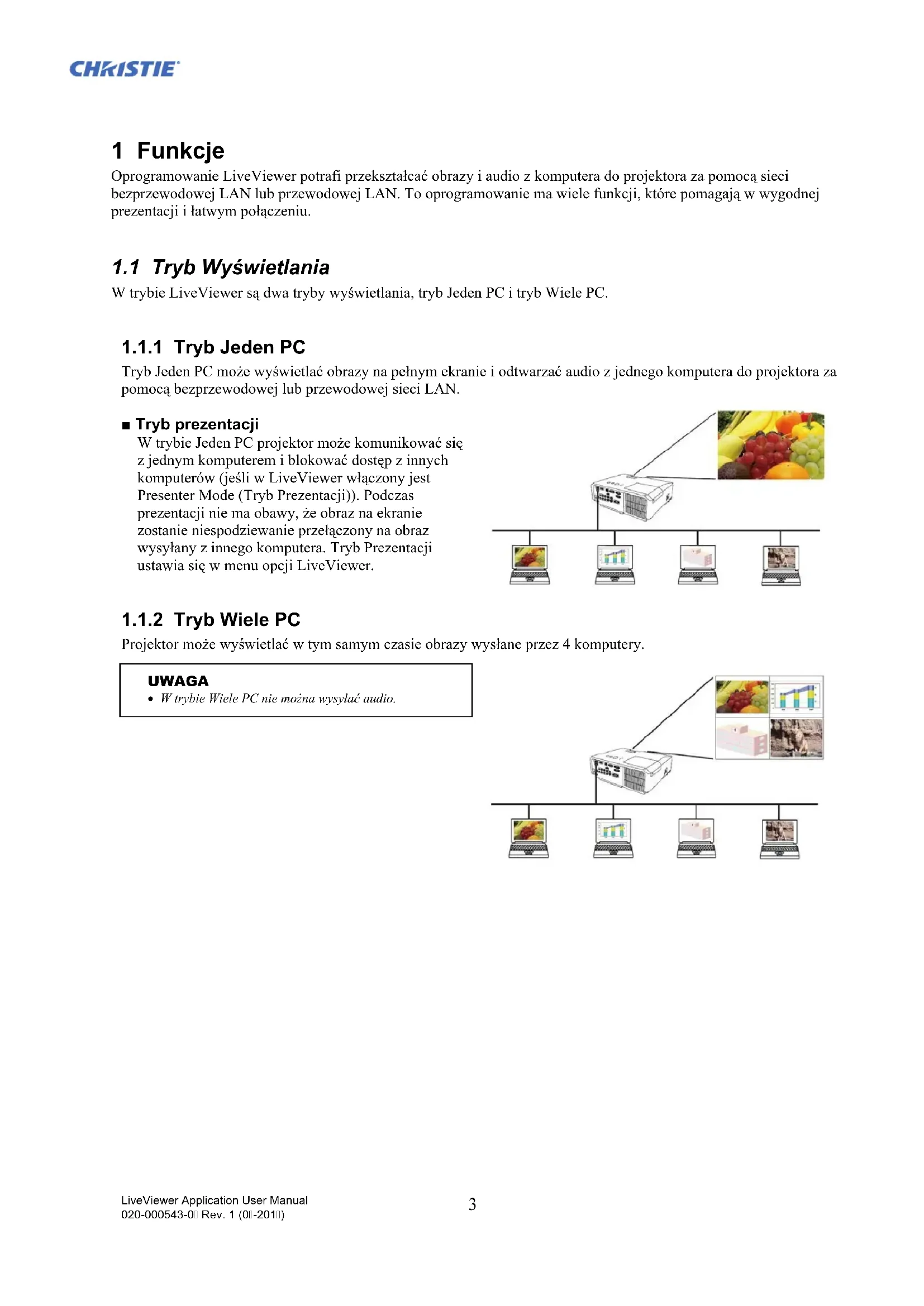 - Dodatek LiveViewer Application User Manual 020-000543-0 Rev. 1 (0-201)3 1 Funkcje Oprogramowanie LiveViewer potrafi przekształcać obrazy i audio z komputera do projektora za pomocą sieci bezprzewodowej LAN lub przewodowej LAN. To oprogramowanie ma wiele funkcji, które pomagają w wygodnej prezentacji i łatwym połączeniu. p. 36