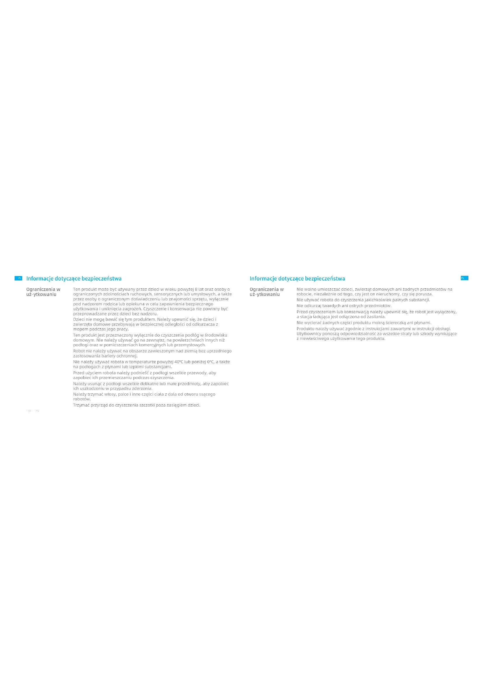 Ten produkt może być używany przez dzieci w wieku powyżej 8 lat oraz osoby o ograniczonych zdolnościach ruchowych, sensorycznych lub umysłowych, a także przez osoby o ograniczonym doświadczeniu lub znajomości sprzętu, wyłącznie pod nadzorem rodzica lub opiekuna w celu zapewnienia bezpiecznego użytkowania i uniknięcia zagrożeń. Czyszczenie i konserwacja nie powinny być przeprowadzane przez dzieci bez nadzoru. Dzieci nie mogą bawić się tym produktem. Należy upewnić się, że dzieci i zwierzęta domowe przebywają w bezpiecznej odległości od odkurzacza z mopem podczas jego pracy. Ten produkt jest przeznaczony wyłącznie do czyszczenia podłóg w środowisku domowym. Nie należy używać go na zewnątrz, na powierzchniach innych niż podłogi oraz w pomieszczeniach komercyjnych lub przemysłowych. Robot nie należy używać na obszarze zawieszonym nad ziemią bez uprzedniego zastosowania bariery ochronnej. Nie należy używać robota w temperaturze powyżej 40°C lub poniżej 0°C, a także na podłogach z płynami lub lepkimi substancjami. Przed użyciem robota należy podnieść z podłogi wszelkie przewody, aby zapobiec ich przemieszczaniu podczas czyszczenia. Należy usunąć z podłogi wszelkie delikatne lub małe przedmioty, aby zapobiec ich uszkodzeniu w przypadku zderzenia. Należy trzymać włosy, palce i inne części ciała z dala od otworu ssącego robotów. Trzymać przyrząd do czyszczenia szczotki poza zasięgiem dzieci. Ograniczenia w uż-ytkowaniu Informacje dotycz