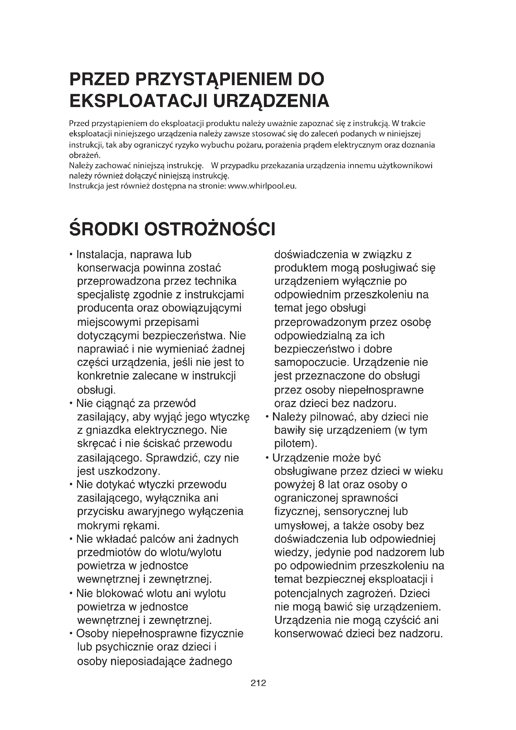 Przed przystąpieniem do eksploatacji produktu należy uważnie zapoznać się z instrukcją. W trakcie eksploatacji niniejszego urządzenia należy zawsze stosować się do zaleceń podanych w niniejszej instrukcji, tak aby ograniczyć ryzyko wybuchu pożaru, porażenia prądem elektrycznym oraz doznania obrażeń. Należy zachować niniejszą instrukcję. W przypadku przekazania urządzenia innemu użytkownikowi należy również dołączyć niniejszą instrukcję. Instrukcja jest również dostępna na stronie: www.whirlpool.eu.