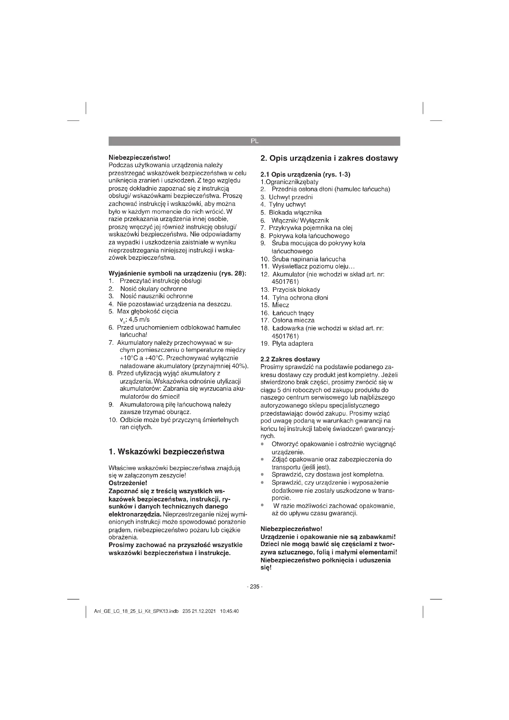 W razie możliwości zachować opakowanie, aż do upływu czasu gwarancji. Niebezpieczeństwo! Urządzenie i opakowanie nie są zabawkami! Dzieci nie mogą bawić się częściami z twor- zywa sztucznego, folią i małymi elementami! Niebezpieczeństwo połknięcia i uduszenia się! Anl_GE_LC_18_25_Li_Kit_SPK13.indb 235 21.12.2021 10:45:40PL