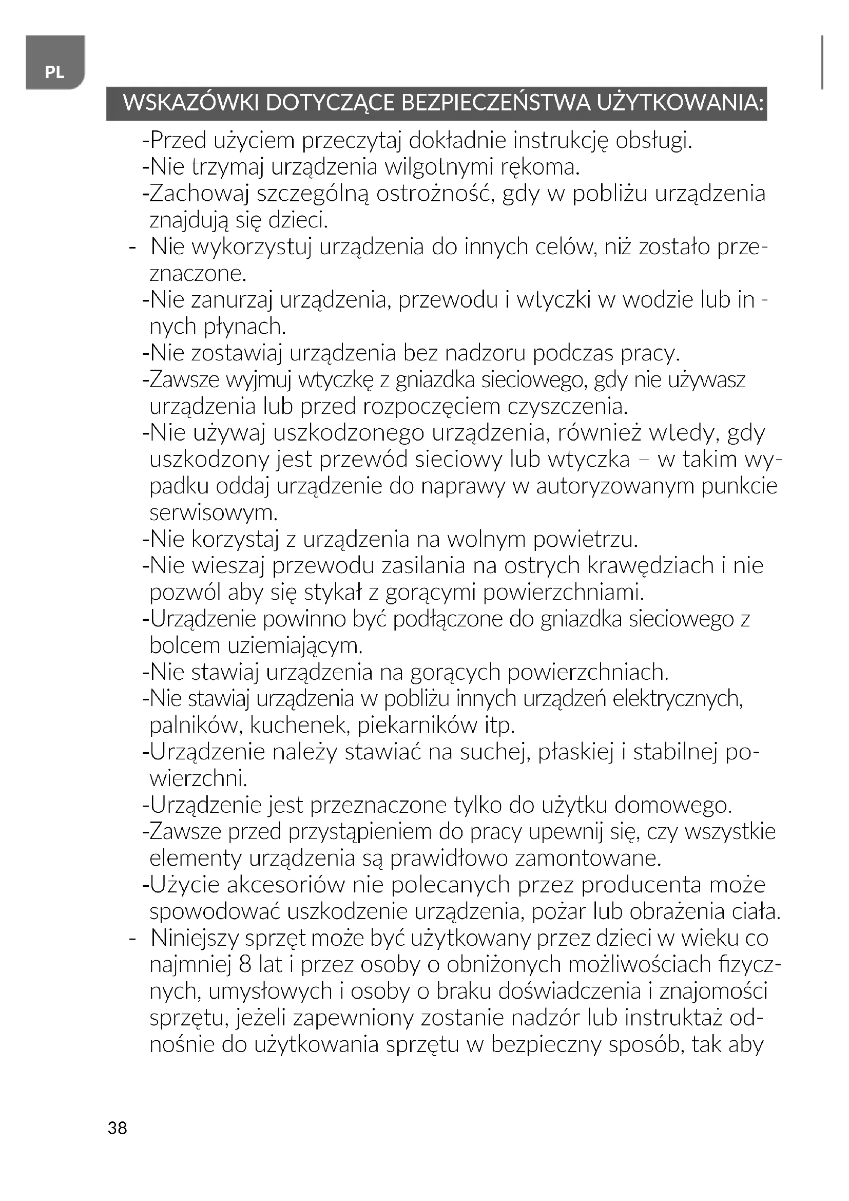 WSKAZÓWKI DOTYCZĄCE BEZPIECZEŃSTWA UŻYTKOWANIA: - Przed użyciem przeczytaj dokładnie instrukcję obsługi. - Nie trzymaj urządzenia wilgotnymi rękoma.