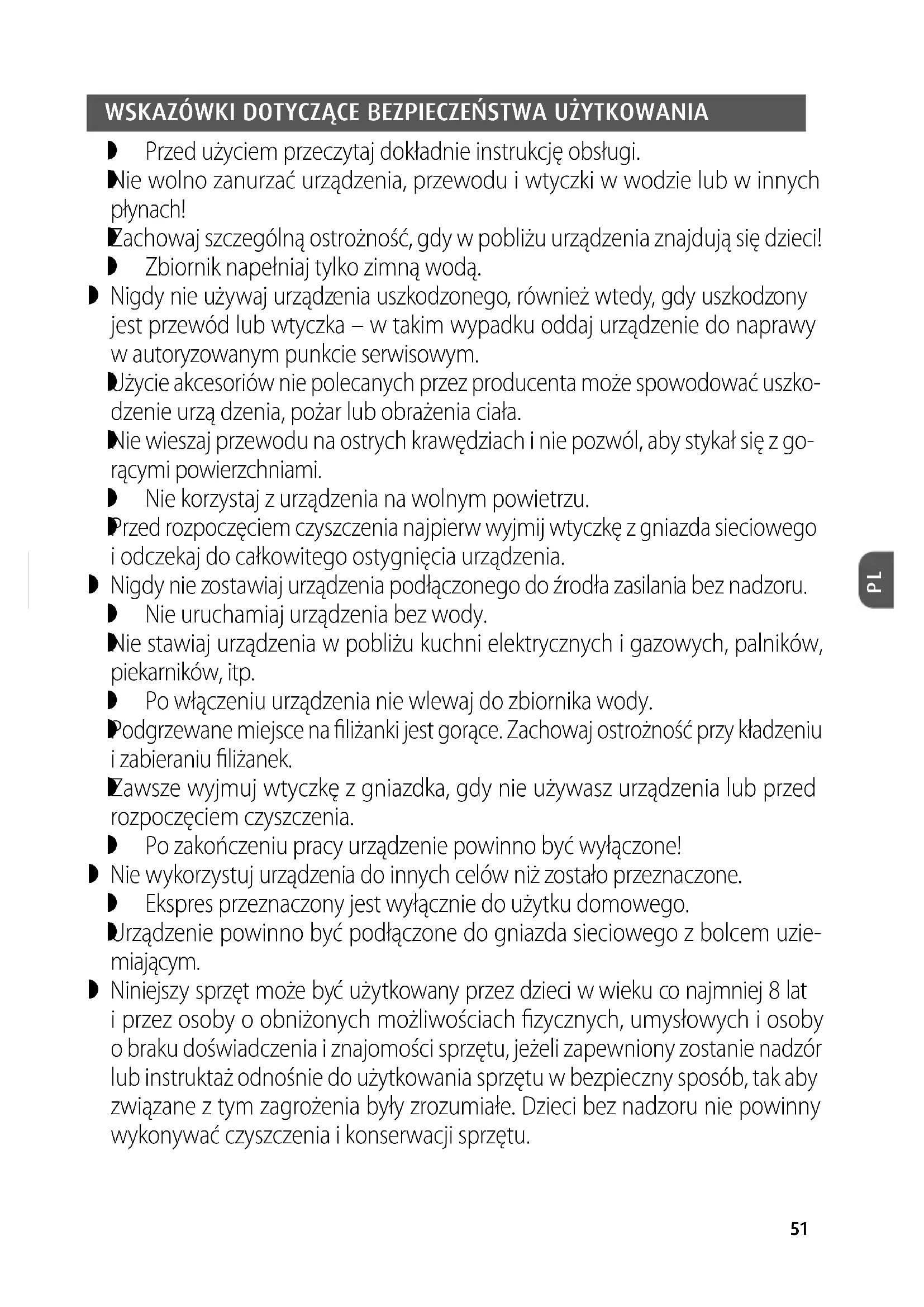 Zawsze wyjmuj wtyczkę z gniazdka, gdy nie używasz urządzenia lub przed rozpoczęciem czyszczenia. Po zakończeniu pracy urządzenie powinno być wyłączone! Nie wykorzystuj urządzenia do innych celów niż zostało przeznaczone. Ekspres przeznaczony jest wyłącznie do użytku domowego.
